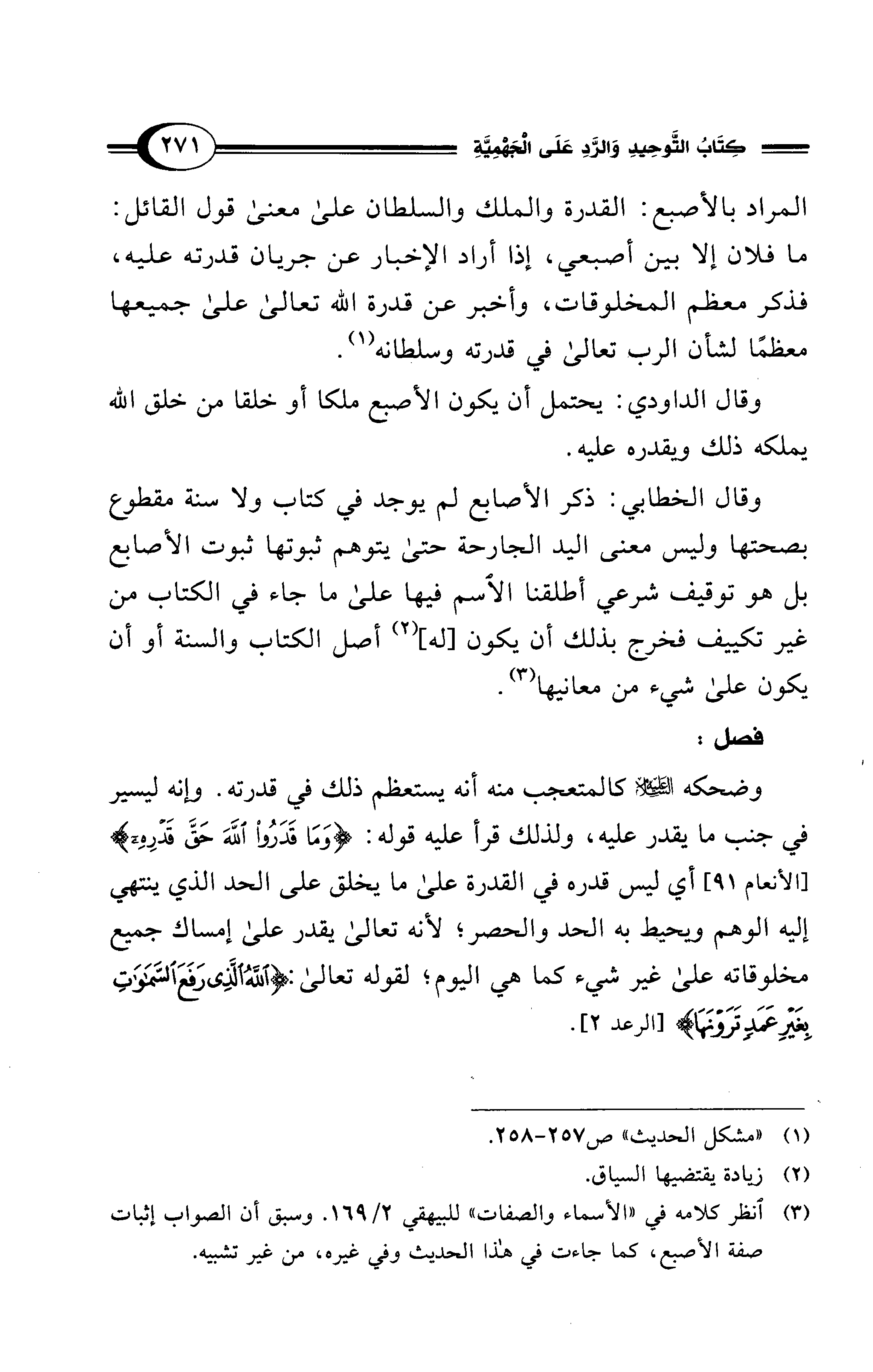 وقال الخطابي: ذكر الأصابع لم يوجد في كتاب ولا سنة مقطوع بصحتها وليس معنى اليد الجارحة حتى يتوهم ثبوتها ثبوت الأصابع بل هو توقيف شرعي أطلقنا الاسم فيها على ما جاء في الكتاب من غير تكييف فخرج بذلك أن يكون [له] (¬2) أصل الكتاب والسنة أو أن يكون على شيء من معانيها (¬3).