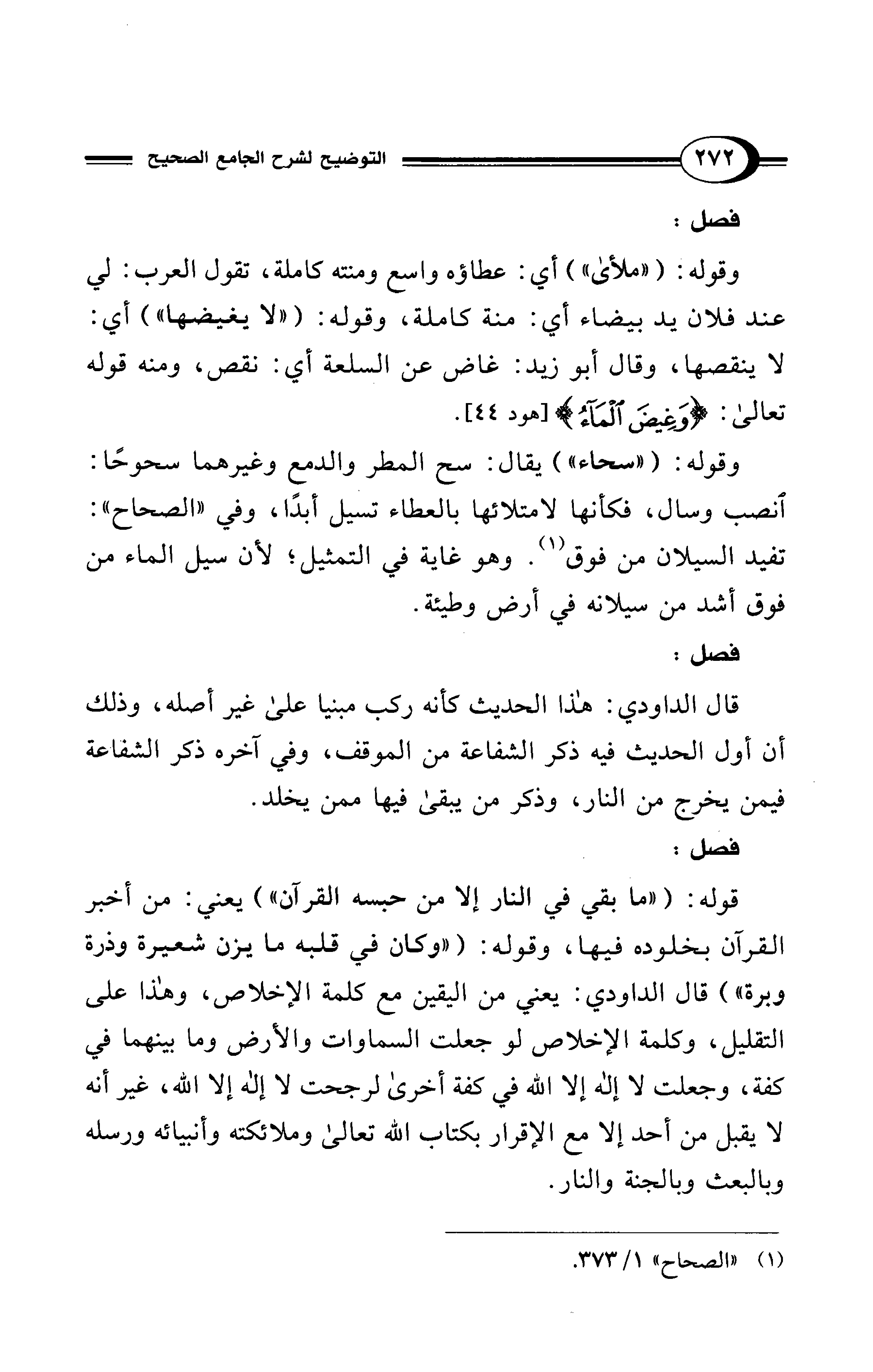 وقوله: ("سحاء") يقال: سح المطر والدمع وغيرهما سحوحًا: انصب وسال، فكأنها لامتلائها بالعطاء تسيل أبدًا، وفي "الصحاح": تفيد السيلان من فوق (¬1). وهو غاية في التمثيل؛ لأن سيل الماء من فوق أشد من سيلانه في أرض وطيئة.
