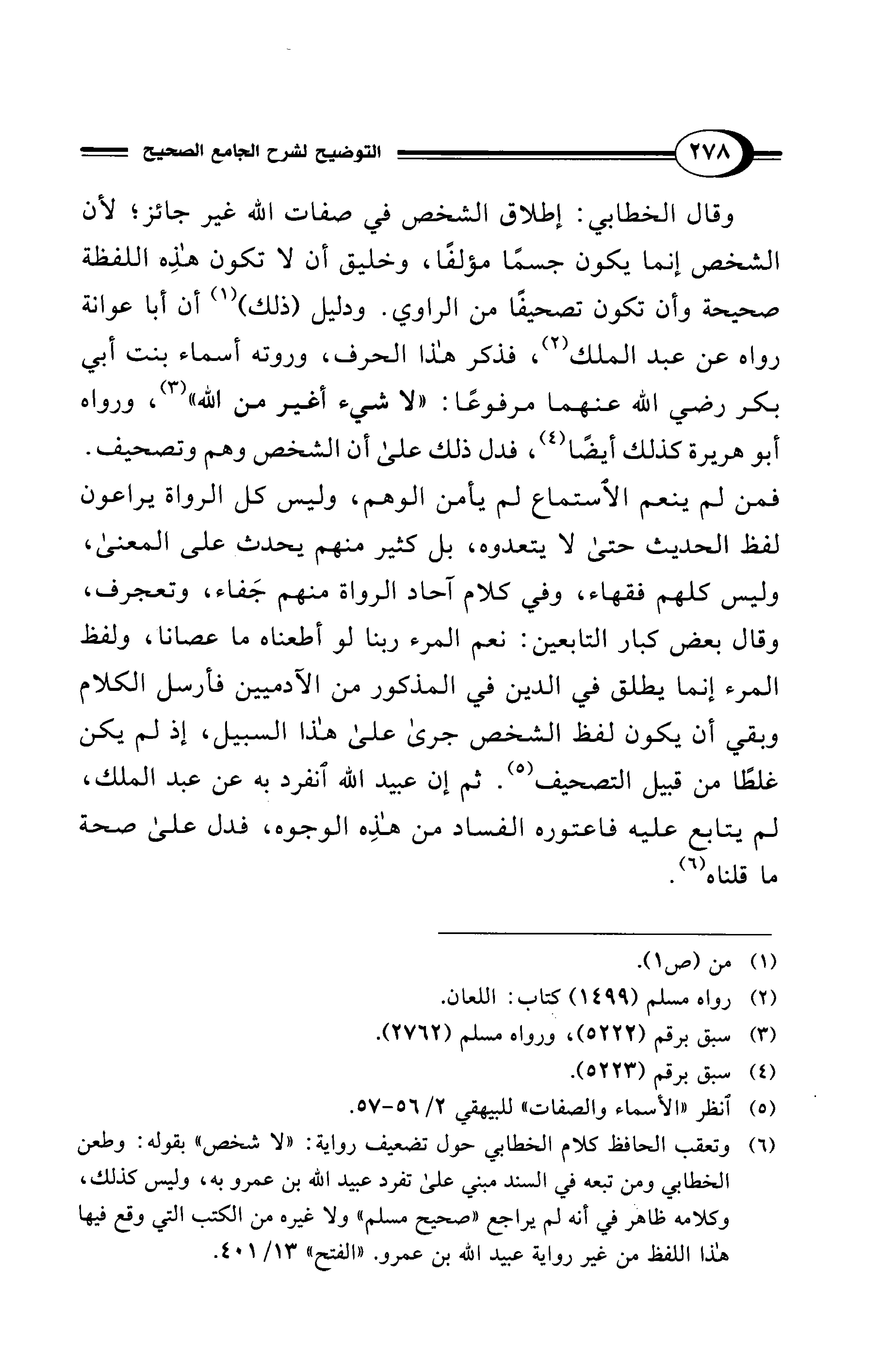 (¬6) وتعقب الحافظ كلام الخطابي حول تضعيف رواية: "لا شخص" بقوله: وطعن الخطابي ومن تبعه في السند مبني على تفرد عبيد الله بن عمرو به، وليس كذلك، وكلامه ظاهر في أنه لم يراجع "صحيح مسلم" ولا غيره من الكتب التي وقع فيها هذا اللفظ من غير رواية عبيد الله بن عمرو. "الفتح" 13/ 401.