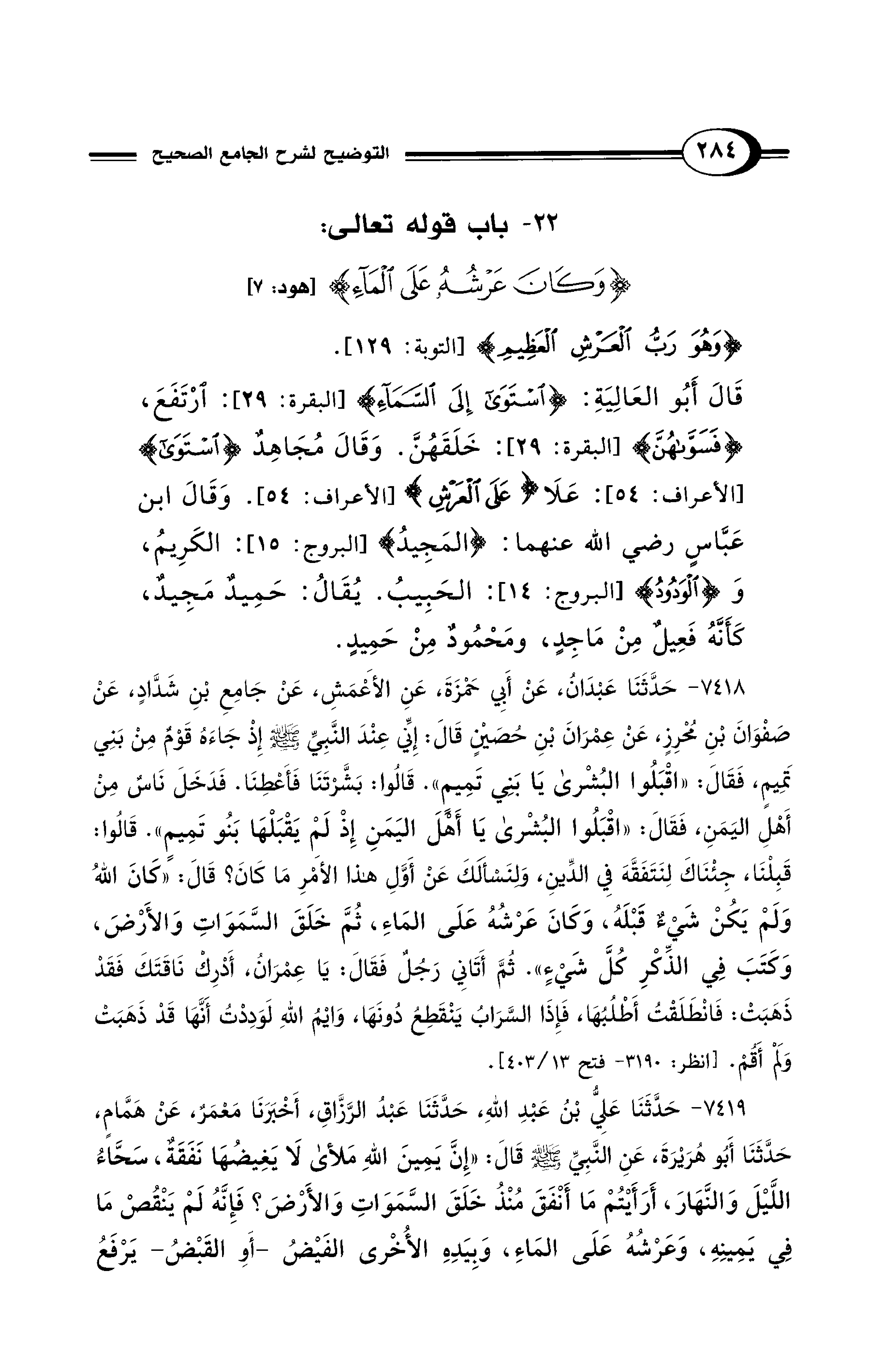 7418 - حَدَّثَنَا عَبْدَانُ، عَنْ أَبِي حَمْزَةَ، عَنِ الأَعْمَشِ، عَنْ جَامِعِ بْنِ شَدَّادٍ، عَنْ صَفْوَانَ بْنِ مُحْرِزٍ، عَنْ عِمْرَانَ بْنِ حُصَيْنٍ قَالَ: إِنِّي عِنْدَ النَّبِيِّ - صلى الله عليه وسلم - إِذْ جَاءَهُ قَوْمٌ مِنْ بَنِي تَمِيمٍ، فَقَالَ: «اقْبَلُوا البُشْرَى يَا بَنِي تَمِيمٍ». قَالُوا: بَشَّرْتَنَا فَأَعْطِنَا. فَدَخَلَ نَاسٌ مِنْ أَهْلِ اليَمَنِ فَقَالَ: «اقْبَلُوا البُشْرَى يَا أَهْلَ اليَمَنِ إِذْ لَمْ يَقْبَلْهَا بَنُو تَمِيمٍ». قَالُوا: قَبِلْنَا، جِئْنَاكَ لِنَتَفَقَّهَ فِي الدِّينِ، وَلِنَسْأَلَكَ عَنْ أَوَّلِ هَذَا الأَمْرِ مَا كَانَ؟. قَالَ: «كَانَ اللهُ وَلَمْ يَكُنْ شَيْءٌ قَبْلَهُ، وَكَانَ عَرْشُهُ عَلَى الْمَاءِ، ثُمَّ خَلَقَ السَّمَوَاتِ وَالأَرْضَ، وَكَتَبَ فِي الذِّكْرِ كُلَّ شَيْءٍ». ثُمَّ أَتَانِي رَجُلٌ فَقَالَ: يَا عِمْرَانُ أَدْرِكْ نَاقَتَكَ فَقَدْ ذَهَبَتْ: فَانْطَلَقْتُ أَطْلُبُهَا، فَإِذَا السَّرَابُ يَنْقَطِعُ دُونَهَا، وَايْمُ اللهِ لَوَدِدْتُ أَنَّهَا قَدْ ذَهَبَتْ وَلَمْ أَقُمْ. [انظر: 3190 - فتح 13/ 403].