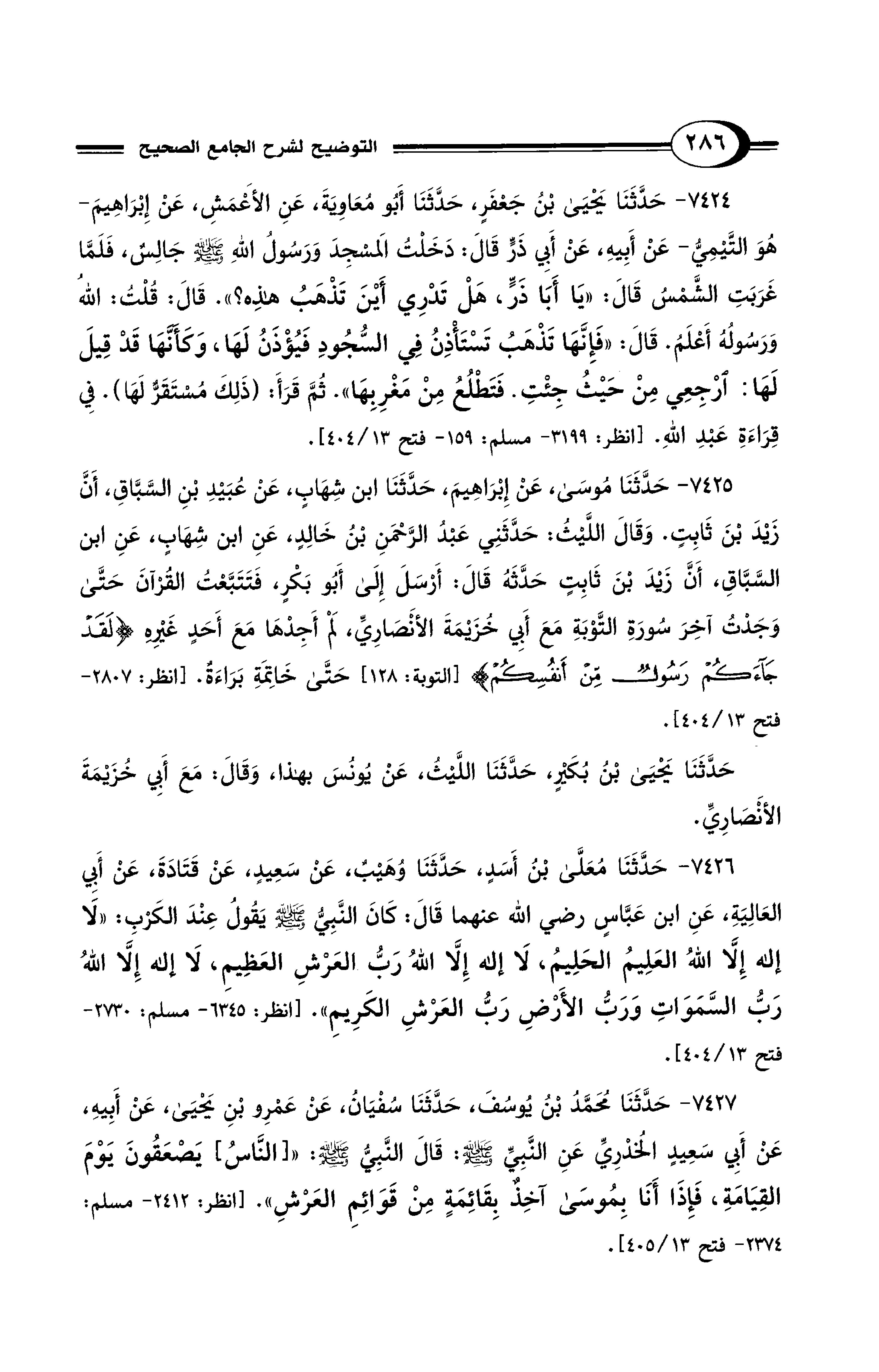 7424 - حَدَّثَنَا يَحْيَى بْنُ جَعْفَرٍ، حَدَّثَنَا أَبُو مُعَاوِيَةَ، عَنِ الأَعْمَشِ، عَنْ إِبْرَاهِيمَ -هُوَ التَّيْمِيُّ- عَنْ أَبِيهِ، عَنْ أَبِي ذَرٍّ قَالَ: دَخَلْتُ الْمَسْجِدَ وَرَسُولُ اللهِ - صلى الله عليه وسلم - جَالِسٌ، فَلَمَّا غَرَبَتِ الشَّمْسُ قَالَ: «يَا أَبَا ذَرٍّ، هَلْ تَدْرِي أَيْنَ تَذْهَبُ هَذِهِ؟». قَالَ: قُلْتُ: اللهُ وَرَسُولُهُ أَعْلَمُ. قَالَ: «فَإِنَّهَا تَذْهَبُ تَسْتَأْذِنُ فِي السُّجُودِ فَيُؤْذَنُ لَهَا، وَكَأَنَّهَا قَدْ قِيلَ لَهَا: ارْجِعِي مِنْ حَيْثُ جِئْتِ. فَتَطْلُعُ مِنْ مَغْرِبِهَا». ثُمَّ قَرَأَ: (ذَلِكَ مُسْتَقَرٌّ لَهَا) فِي قِرَاءَةِ عَبْدِ اللهِ. [انظر: 3199 - مسلم: 159 - فتح 13/ 404]