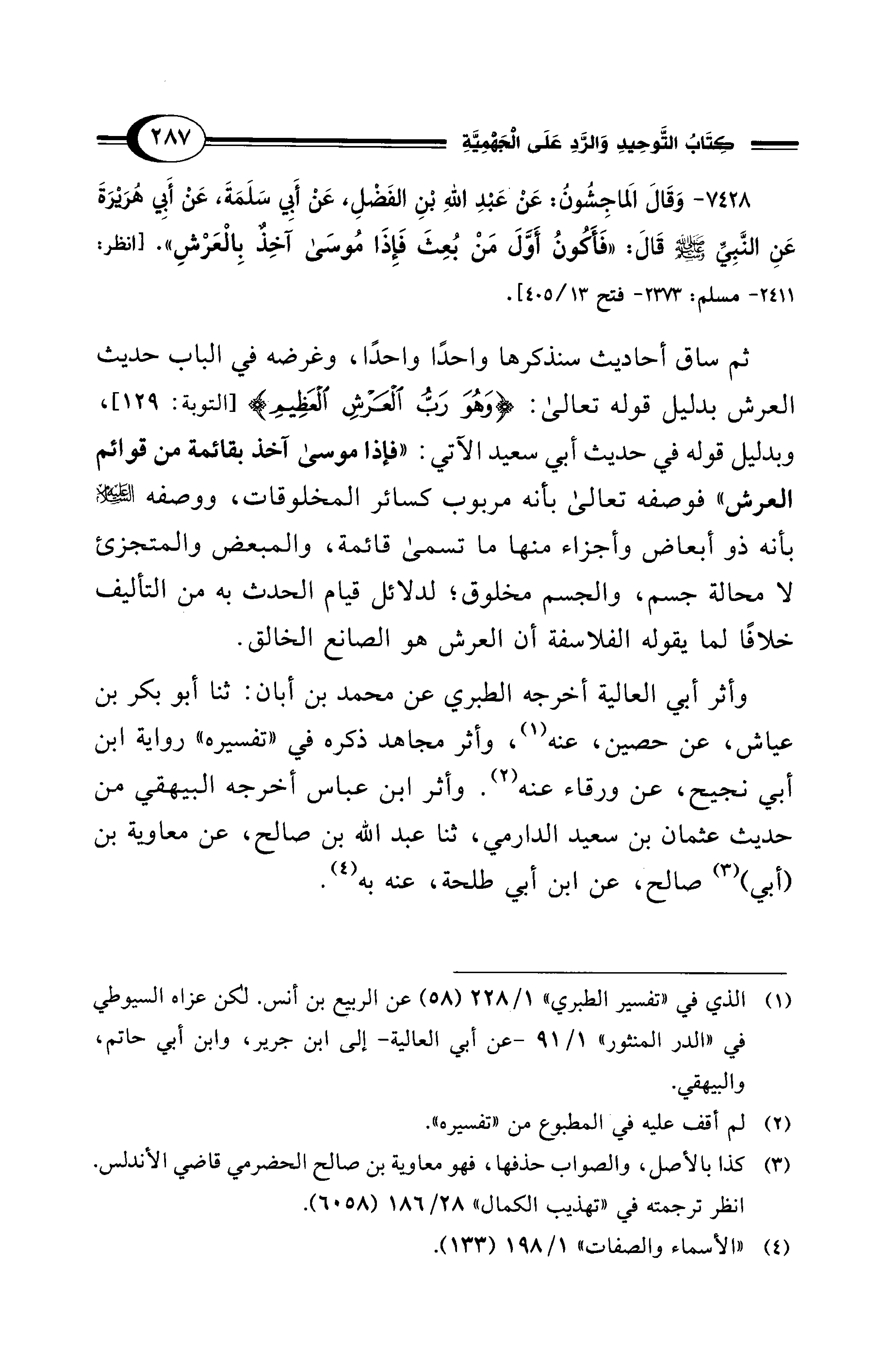 7428 - وَقَالَ المَاجِشُونُ: عَنْ عَبْدِ اللهِ بْنِ الفَضْلِ، عَنْ أَبِي سَلَمَةَ، عَنْ أَبِي هُرَيْرَةَ عَنِ النَّبِيِّ - صلى الله عليه وسلم - قَالَ: «فَأَكُونُ أَوَّلَ مَنْ بُعِثَ فَإِذَا مُوسَى آخِذٌ بِالْعَرْشِ». [انظر: 2411 - مسلم:2373 - فتح 13/ 405].