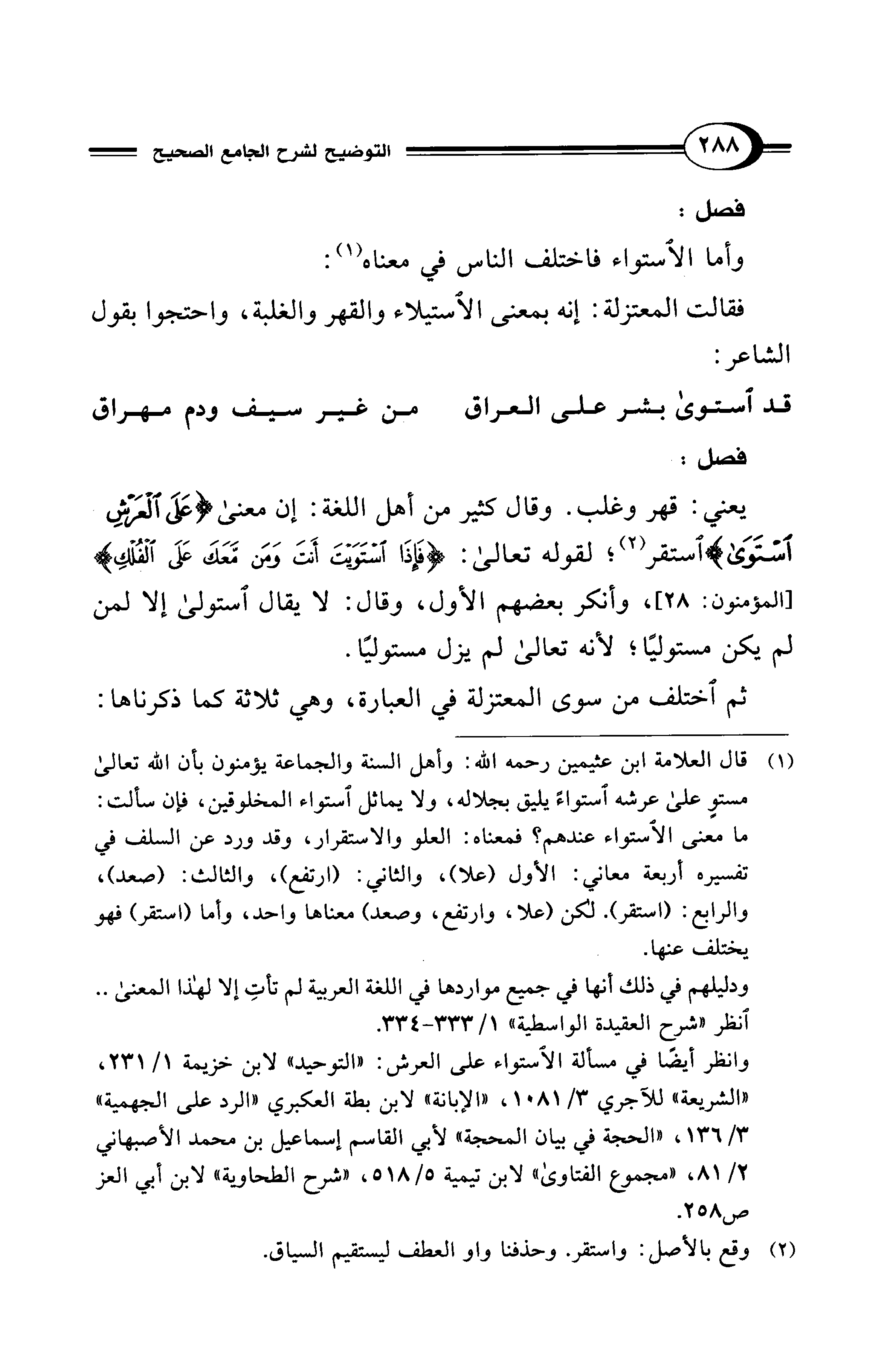 (¬1) قال العلامة ابن عثيمين -رحمه الله-: وأهل السنة والجماعة يؤمنون بأن الله تعالى مستوٍ على عرشه استواءً يليق بجلاله، ولا يماثل استواء المخلوقين، فإن سألت: ما معنى الاستواء عندهم؟ فمعناه: العلو والاستقرار، وقد ورد عن السلف في تفسيره أربعة معاني: الأول (على)، والثاني: (ارتفع)، والثالث: (صعد)، والرابع: (استقر). لكن (علا، وارتفع، وصعد) معناها واحد، وأما (استقر) فهو يختلف عنها.
