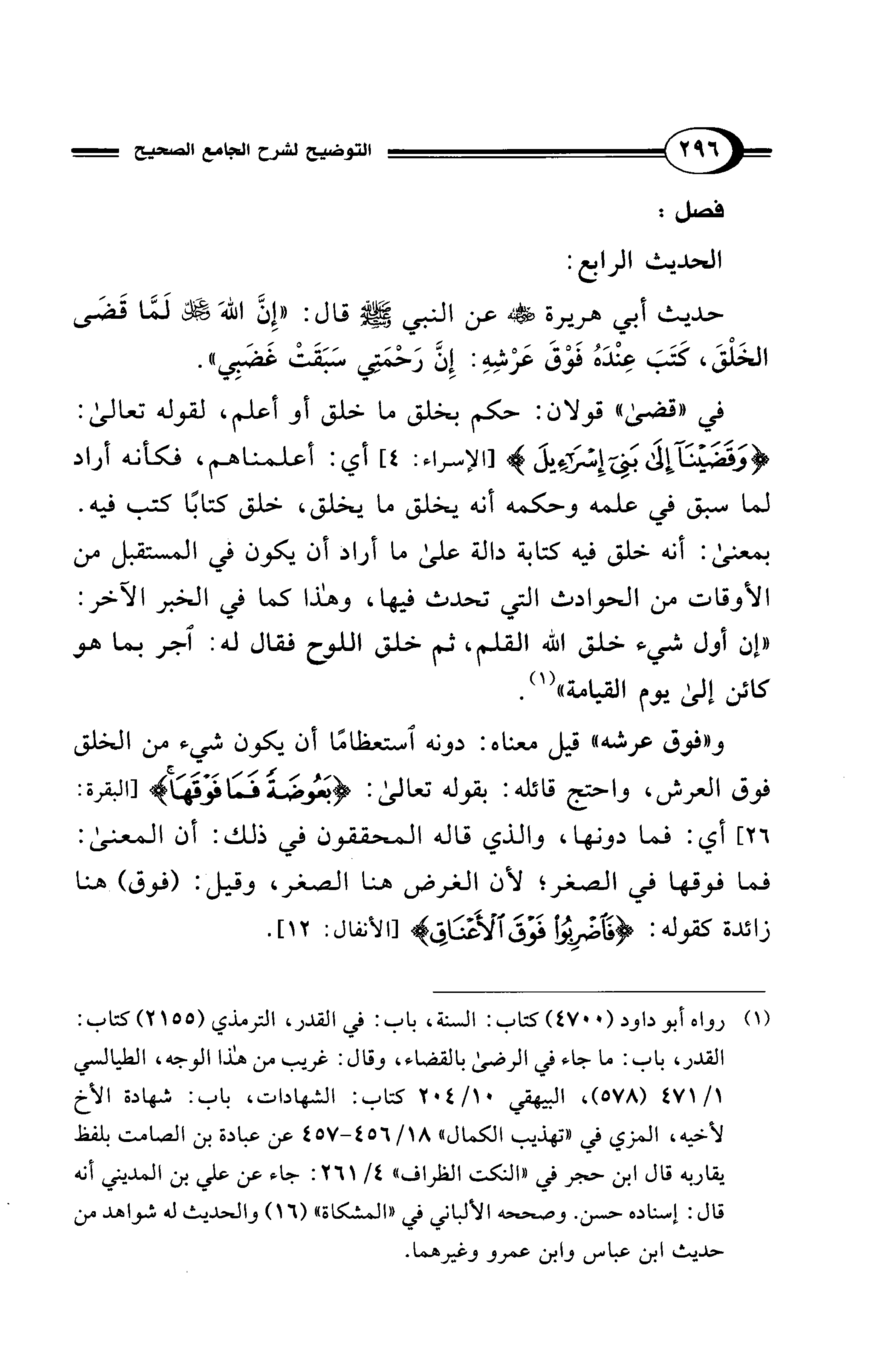حديث أبي هريرة - رضي الله عنه - عن النبي- صلى الله عليه وسلم - قال: "إِنَّ اللهَ -عَزَّ وَجَلَّ- لَمَّا قَضَى الخَلْقَ، كَتَبَ عِندهُ فَوْقَ عَرْشِهِ: إِنَّ رَحْمَتي سَبَقَتْ غَضَبِي".
