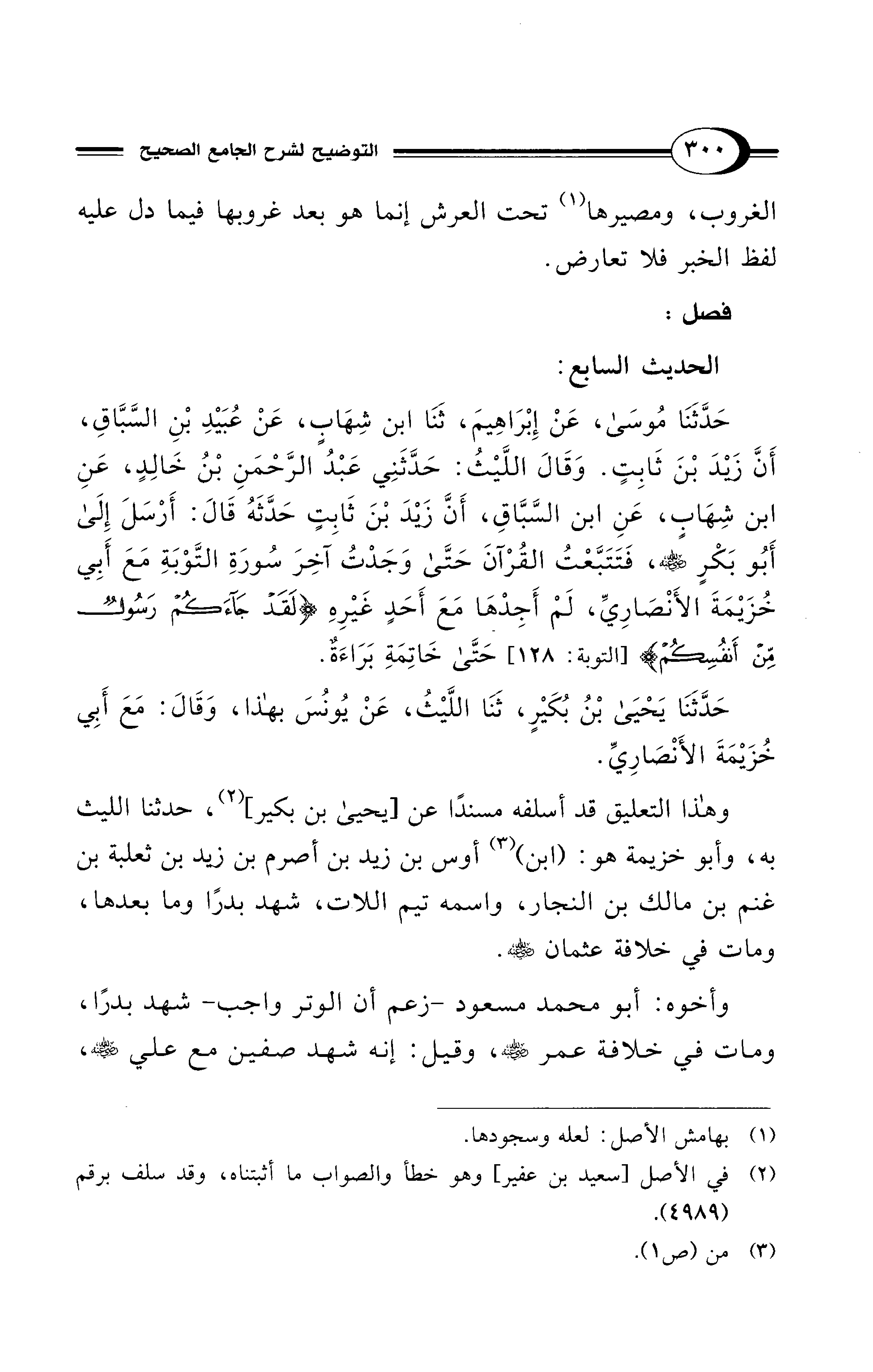 حَدَّثَنَا مُوسَى، عَنْ إِبْرَاهِيمَ، ثَنَا ابْنُ شِهَابٍ، عَنْ عُبَيْدِ بْنِ السَّبَّاقِ، أَنَّ زَيْدَ بْنَ ثَابِتٍ. وَقَالَ اللَّيْثُ: حَدَّثَنِي عَبْدُ الرَّحْمَنِ بْنُ خَالِدٍ، عَنِ ابْنِ شِهَابٍ، عَنِ ابْنِ السَّبَّاقِ، أَنَّ زَيْدَ بْنَ ثَابِتٍ حَدَّثَهُ قَالَ: أَرْسَلَ إِلَيَّ أَبُو بَكْر - رضي الله عنه -، فَتَتَبَّعْتُ الْقُرْآنَ حَتَّى وَجَدْتُ آخِرَ سُورَةِ التَّوْبَةِ مَعَ أَبِي خُزَيْمَةَ الأَنْصَارِيِّ، لَمْ أَجِدْهَا مَعَ أَحَدٍ غَيْرِهِ {لَقَدْ جَاءَكُمْ رَسُولٌ مِنْ أَنْفُسِكُمْ} [التوبة: 128] حَتَّى خَاتِمَةِ بَرَاءَةٌ.