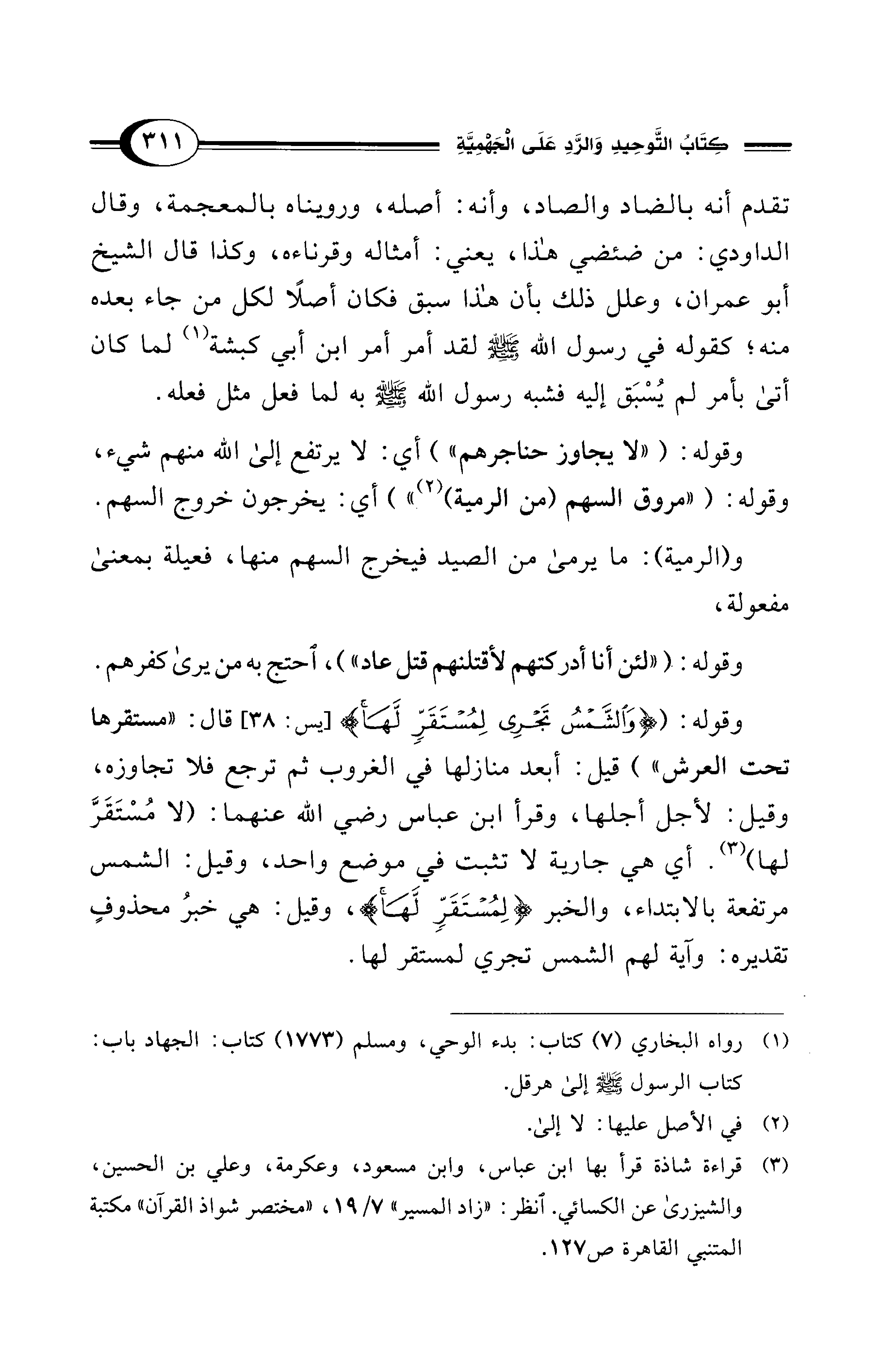 وقوله: ({وَالشَّمْسُ تَجْرِي لِمُسْتَقَرٍّ لَهَا} [يس: 38] قال: "مستقرها تحت العرش") قيل: أبعد منازلها في الغروب ثم ترجع فلا تجاوزه، وقيل: لأجل أجلها، وقرأ ابن عباس - رضي الله عنهما -: (لا مُسْتَقَرَّ لها) (¬3). أي هي جارية لا تثبت في موضع واحد، وقيل: الشمس مرتفعة بالابتداء، والخبر {لِمُسْتَقَرٍّ لَهَا}، وقيل: هي خبرُ محذوفٍ تقديره: وآية لهم الشمس تجري لمستقر لها.