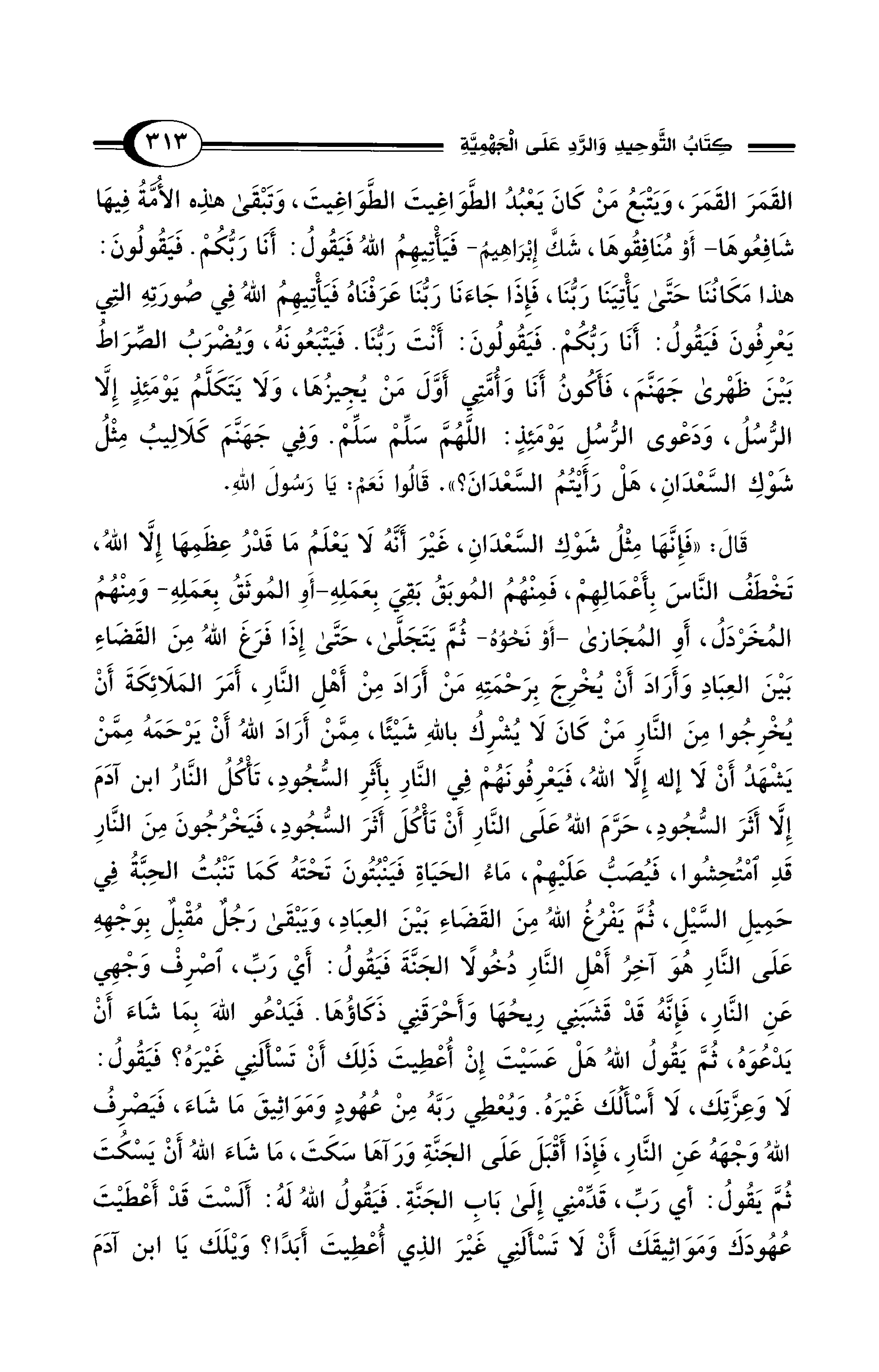 قَالَ: «فَإِنَّهَا مِثْلُ شَوْكِ السَّعْدَانِ، غَيْرَ أَنَّهُ لاَ يَعْلَمُ مَا قَدْرُ عِظَمِهَا إِلاَّ اللهُ، تَخْطَفُ النَّاسَ بِأَعْمَالِهِمْ، فَمِنْهُمُ الْمُوبَقُ بَقِيَ بِعَمَلِهِ -أَوِ الْمُوثَقُ بِعَمَلِهِ- وَمِنْهُمُ الْمُخَرْدَلُ أَوِ الْمُجَازَى -أَوْ نَحْوُهُ- ثُمَّ يَتَجَلَّى, حَتَّى إِذَا فَرَغَ اللهُ مِنَ القَضَاءِ بَيْنَ العِبَادِ وَأَرَادَ أَنْ يُخْرِجَ بِرَحْمَتِهِ مَنْ أَرَادَ مِنْ أَهْلِ النَّارِ، أَمَرَ الْمَلاَئِكَةَ أَنْ يُخْرِجُوا مِنَ النَّارِ مَنْ كَانَ لاَ يُشْرِكُ بِاللهِ شَيْئًا، مِمَّنْ أَرَادَ اللهُ أَنْ يَرْحَمَهُ مِمَّنْ يَشْهَدُ أَنْ لاَ إِلَهَ إِلاَّ اللهُ، فَيَعْرِفُونَهُمْ فِي النَّارِ بِأَثَرِ السُّجُودِ، تَأْكُلُ النَّارُ ابْنَ آدَمَ إِلاَّ أَثَرَ السُّجُودِ، حَرَّمَ اللهُ عَلَى النَّارِ أَنْ تَأْكُلَ أَثَرَ السُّجُودِ، فَيَخْرُجُونَ مِنَ النَّارِ قَدِ امْتُحِشُوا، فَيُصَبُّ عَلَيْهِمْ، مَاءُ الحَيَاةِ فَيَنْبُتُونَ تَحْتَهُ كَمَا تَنْبُتُ الْحِبَّةُ فِي حَمِيلِ السَّيْلِ، ثُمَّ يَفْرُغُ اللهُ مِنَ القَضَاءِ بَيْنَ العِبَادِ، وَيَبْقَى رَجُلٌ مُقْبِلٌ بِوَجْهِهِ عَلَى النَّارِ هُوَ آخِرُ أَهْلِ النَّارِ دُخُولاً الجَنَّةَ فَيَقُولُ: أَيْ رَبِّ، اصْرِفْ وَجْهِي عَنِ النَّارِ، فَإِنَّهُ قَدْ قَشَبَنِي رِيحُهَا وَأَحْرَقَنِي ذَكَاؤُهَا. فَيَدْعُو اللهَ بِمَا شَاءَ أَنْ يَدْعُوَهُ، ثُمَّ يَقُولُ اللهُ هَلْ عَسَيْتَ إِنْ أُعْطِيتَ ذَلِكَ أَنْ تَسْأَلَنِي غَيْرَهُ؟. فَيَقُولُ: لاَ وَعِزَّتِكَ، لاَ أَسْأَلُكَ غَيْرَهُ، وَيُعْطِي رَبَّهُ مِنْ عُهُودٍ وَمَوَاثِيقَ مَا شَاءَ، فَيَصْرِفُ اللهُ وَجْهَهُ عَنِ النَّارِ، فَإِذَا أَقْبَلَ على الجَنَّةِ وَرَآهَا سَكَتَ، مَا شَاءَ اللهُ أَنْ يَسْكُتَ ثُمَّ يَقُولُ: أَيْ رَبِّ، قَدِّمْنِي إِلَى بَابِ الجَنَّةِ. فَيَقُولُ اللهُ لَهُ: أَلَسْتَ قَدْ أَعْطَيْتَ عُهُودَكَ وَمَوَاثِيقَكَ أَنْ لاَ تَسْأَلَنِي غَيْرَ الذِي أُعْطِيتَ أَبَدًا؟، وَيْلَكَ يَا ابْنَ آدَمَ