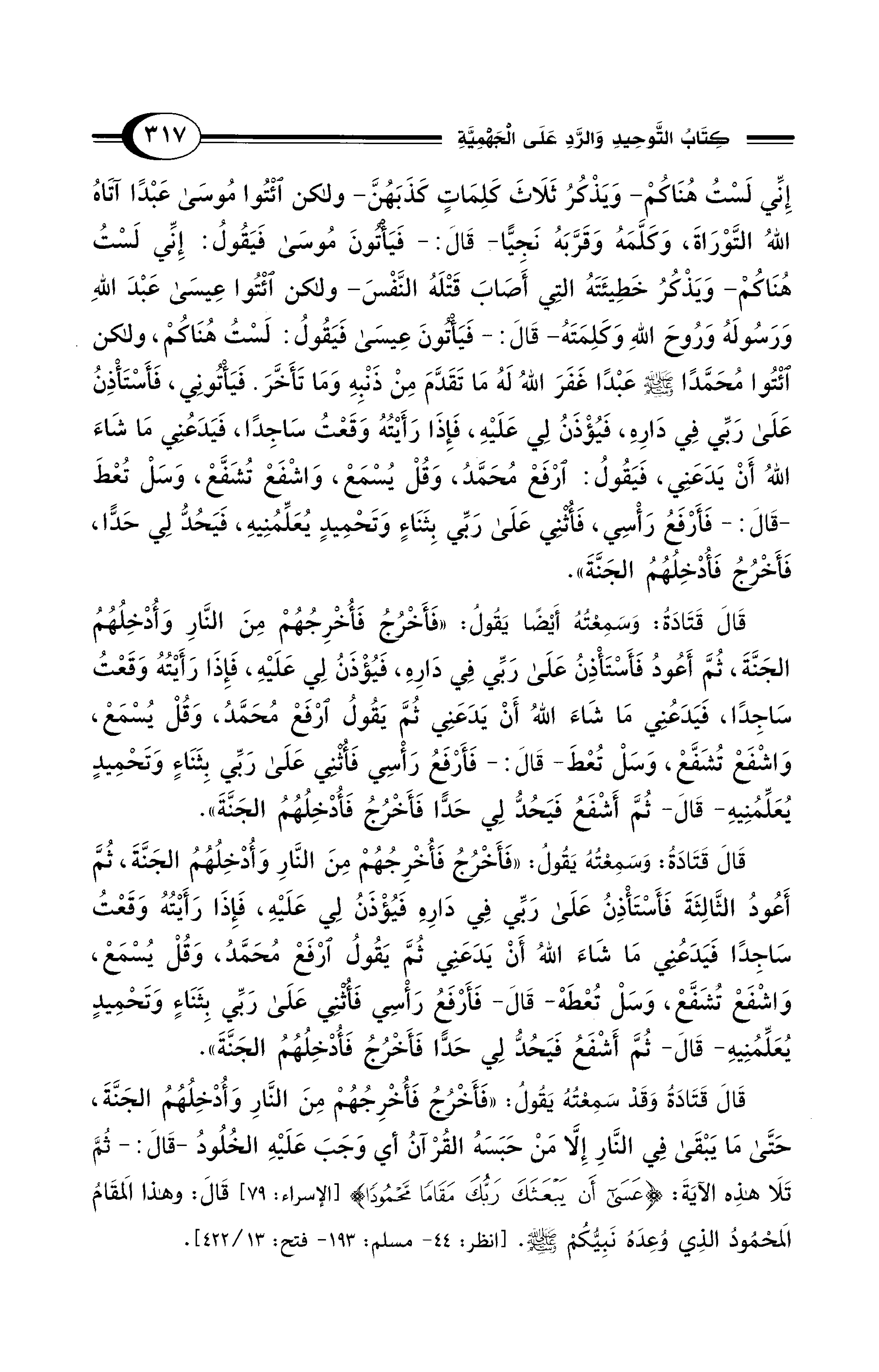 قَالَ قَتَادَةُ وَقَدْ سَمِعْتُهُ يَقُولُ: «فَأَخْرُجُ فَأُخْرِجُهُمْ مِنَ النَّارِ وَأُدْخِلُهُمُ الجَنَّةَ، حَتَّى مَا يَبْقَى فِي النَّارِ إِلاَّ مَنْ حَبَسَهُ الْقُرْآنُ أَيْ وَجَبَ عَلَيْهِ الْخُلُودُ -قَالَ:- ثُمَّ تَلاَ هَذِهِ الآيَةَ: {عَسَى أَنْ يَبْعَثَكَ رَبُّكَ مَقَامًا مَحْمُودًا} [الإسراء: 79] قَالَ: وَهَذَا المَقَامُ المَحْمُودُ الذِي وُعِدَهُ نَبِيُّكُمْ - صلى الله عليه وسلم -. [انظر: 44 - مسلم: 193 - فتح: 13/ 422]