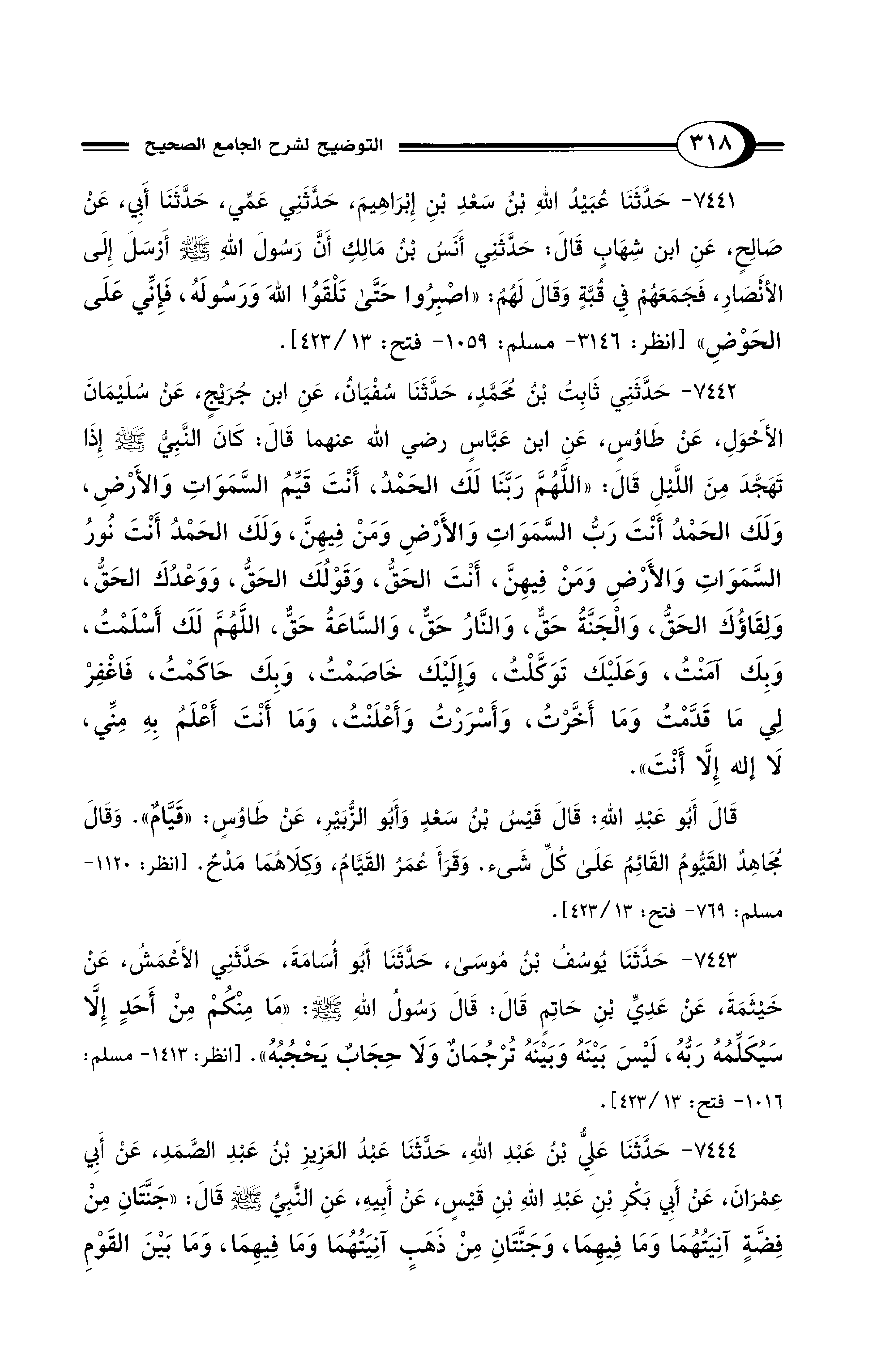 7442 - حَدَّثَنِي ثَابِتُ بْنُ مُحَمَّدٍ، حَدَّثَنَا سُفْيَانُ، عَنِ ابْنِ جُرَيْجٍ، عَنْ سُلَيْمَانَ الأَحْوَلِ، عَنْ طَاوُسٍ، عَنِ ابْنِ عَبَّاسٍ - رضي الله عنهما - قَالَ: كَانَ النَّبِيُّ - صلى الله عليه وسلم - إِذَا تَهَجَّدَ مِنَ اللَّيْلِ قَالَ: «اللَّهُمَّ رَبَّنَا لَكَ الْحَمْدُ، أَنْتَ قَيِّمُ السَّمَوَاتِ وَالأَرْضِ، وَلَكَ الحَمْدُ أَنْتَ رَبُّ السَّمَوَاتِ وَالأَرْضِ وَمَنْ فِيهِنَّ، وَلَكَ الحَمْدُ أَنْتَ نُورُ السَّمَوَاتِ وَالأَرْضِ وَمَنْ فِيهِنَّ، أَنْتَ الحَقُّ، وَقَوْلُكَ الحَقُّ، وَوَعْدُكَ الحَقُّ، وَلِقَاؤُكَ الحَقُّ، وَالْجَنَّةُ حَقٌّ، وَالنَّارُ حَقٌّ، وَالسَّاعَةُ حَقٌّ، اللَّهُمَّ لَكَ أَسْلَمْتُ، وَبِكَ آمَنْتُ، وَعَلَيْكَ تَوَكَّلْتُ، وَإِلَيْكَ خَاصَمْتُ، وَبِكَ حَاكَمْتُ، فَاغْفِرْ لِي مَا قَدَّمْتُ وَمَا أَخَّرْتُ، وَأَسْرَرْتُ وَأَعْلَنْتُ، وَمَا أَنْتَ أَعْلَمُ بِهِ مِنِّي، لاَ إِلَهَ إِلاَّ أَنْتَ».