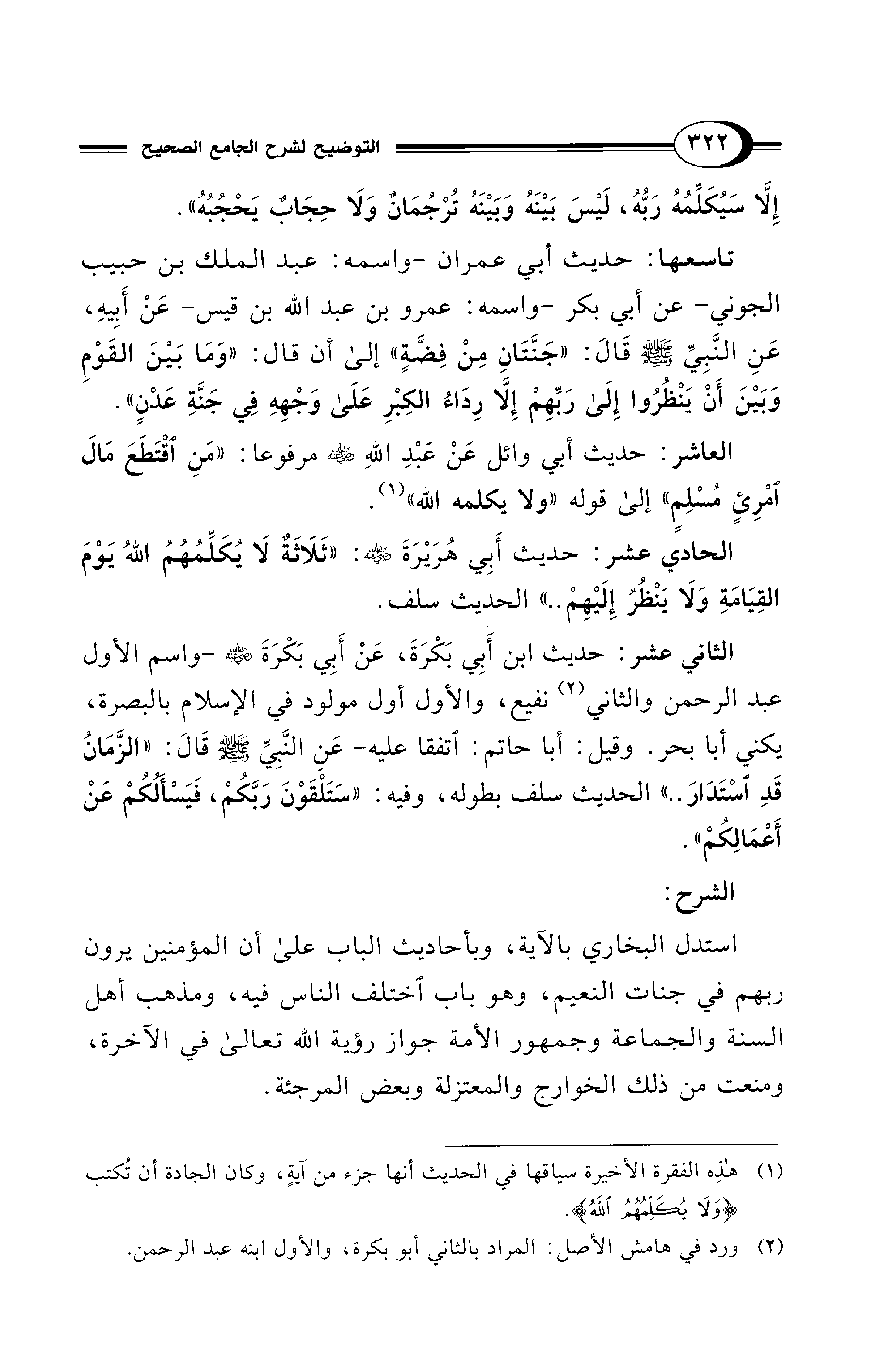 تاسعها: حديث أبي عمران -واسمه: عبد الملك بن حبيب الجوني- عن أبي بكر -واسمه: عمرو بن عبد الله بن قيس- عَنْ أَبِيهِ، عَنِ النَّبِيِّ - صلى الله عليه وسلم - قَالَ: "جَنَّتَانِ مِنْ فِضَّةٍ" إلى أن قال: "وَمَا بَيْنَ القَوْمِ وَبَيْنَ أَنْ يَنْظُرُوا إِلَي رَبِّهِمْ إِلَّا رِدَاءُ الكِبْرِ عَلَى وَجْهِهِ فِي جَنَّةِ عَدْنٍ".