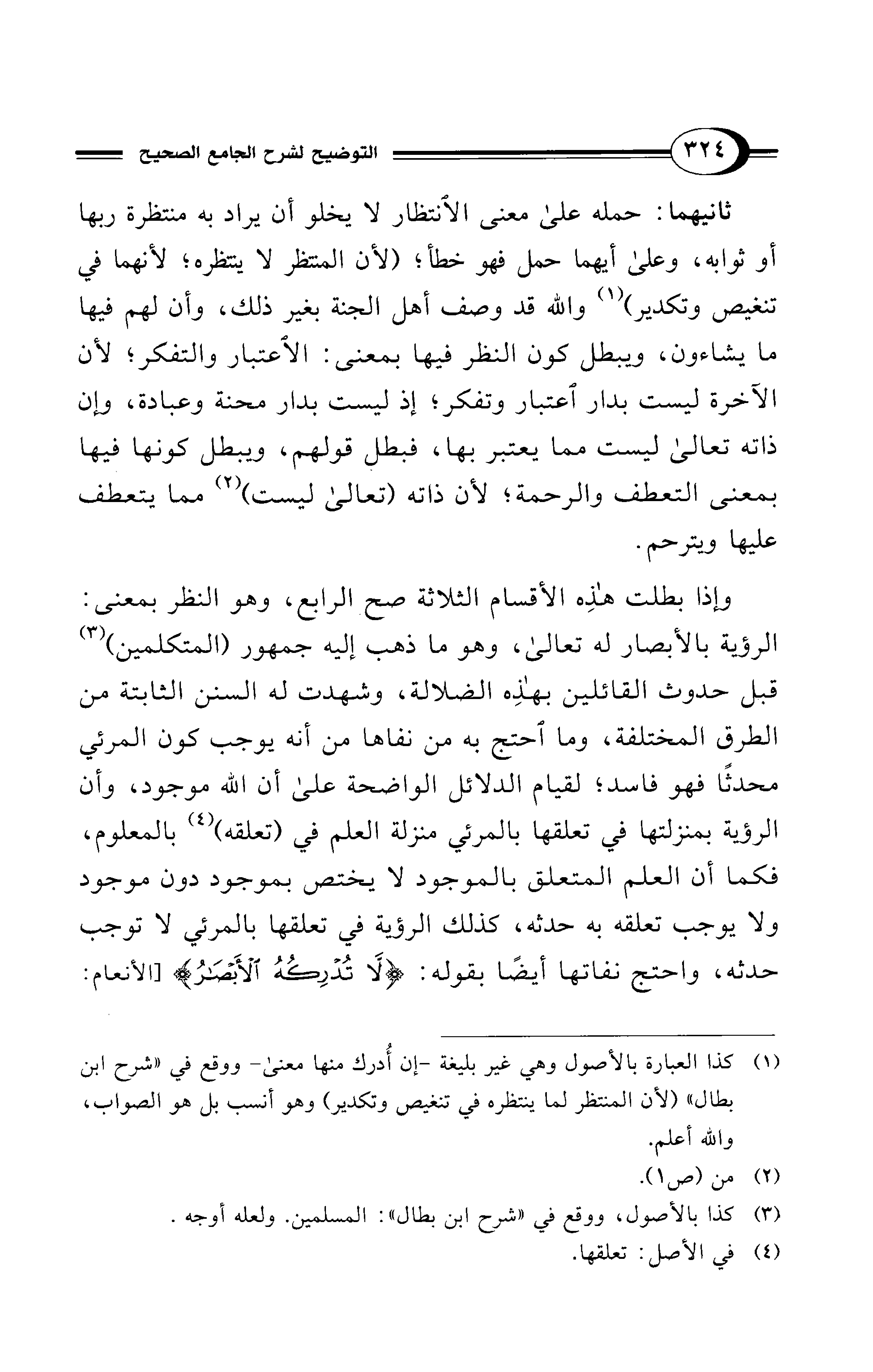 وإذا بطلت هذِه الأقسام الثلاثة صح الرابع، وهو النظر بمعنى: الرؤية بالأبصار له تعالى، وهو ما ذهب إليه جمهور (المتكلمين) (¬3) قبل حدوث القائلين بهذه الضلالة، وشهدت له السنن الثابتة من الطرق المختلفة، وما احتج به من نفاها من أنه يوجب كون المرئي محدثًا فهو فاسد؛ لقيام الدلائل الواضحة على أن الله موجود، وأن الرؤية بمنزلتها في تعلقها بالمرئي منزلة العلم في (تعلقه) (¬4) بالمعلوم، فكما أن العلم المتعلق بالموجود لا يختص بموجود دون موجود ولا يوجب تعلقه به حدثه، كذلك الرؤية في تعلقها بالمرئي لا توجب حدثه، واحتج نفاتها أيضًا بقوله: {لَا تُدْرِكُهُ الْأَبْصَارُ} [الأنعام: