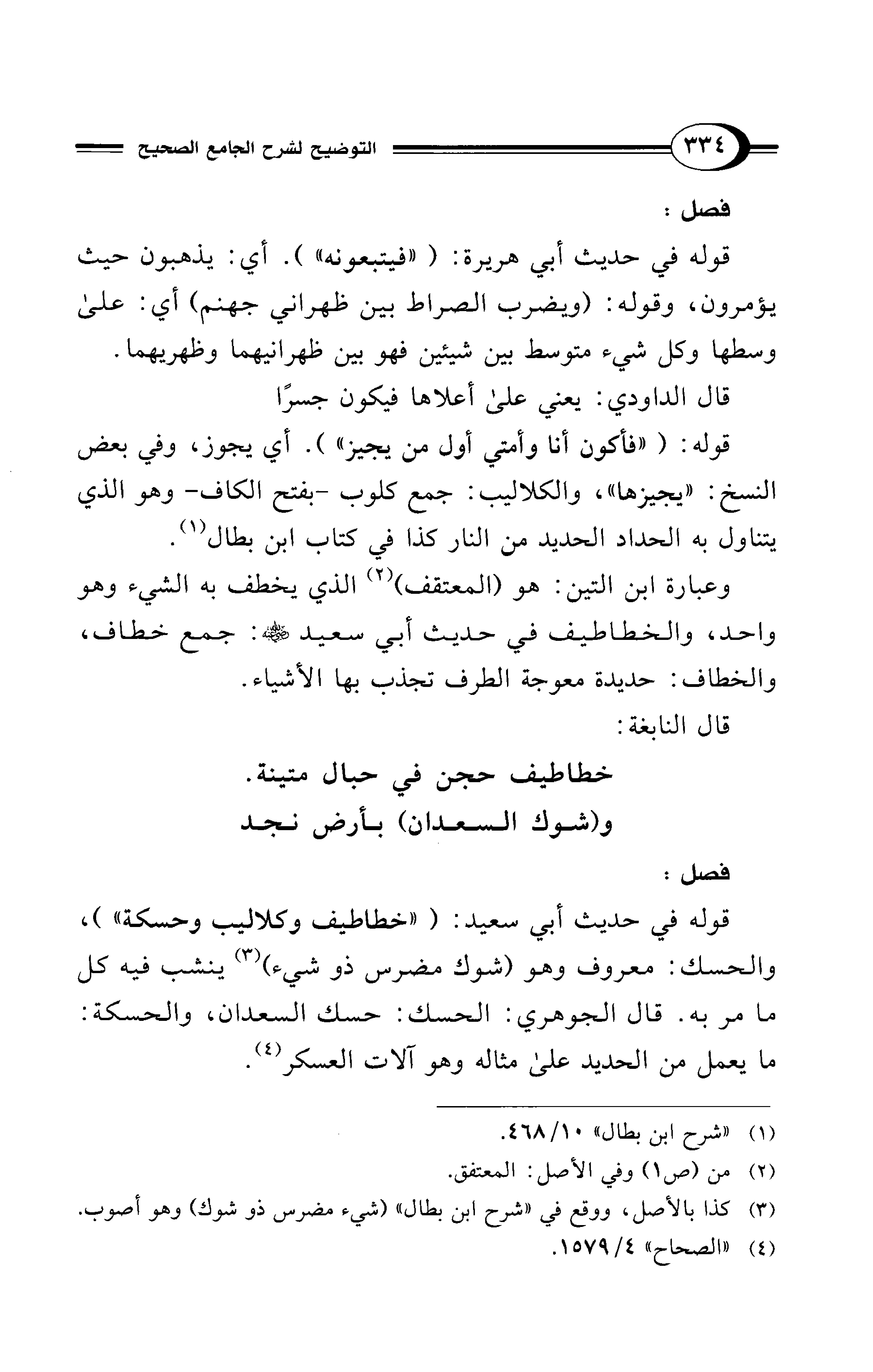 قوله في حديث أبي سعيد: ("خطاطيف وكلاليب وحسكه")، والحسك: معروف وهو (شوك مضرس ذو شيء) (¬3) ينشب فيه كل ما مر به. قال الجوهري: الحسك: حسك السعدان، والحسكة: ما يعمل من الحديد على مثاله وهو آلات العسكر (¬4).