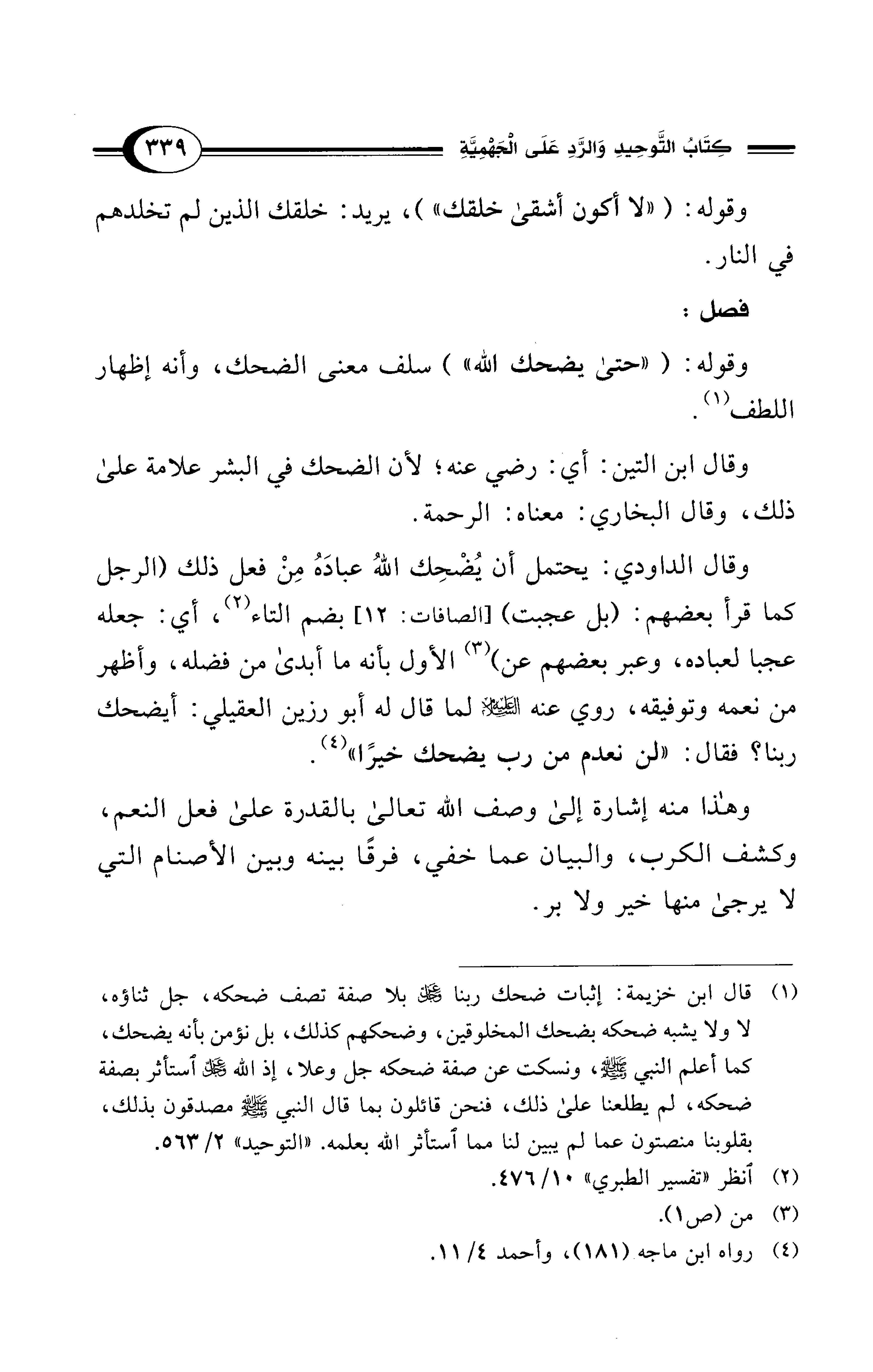 (¬1) قال ابن خزيمة: إثبات ضحك ربنا -عَزَّ وَجَلَّ- بلا صفة تصف ضحكه، -جل ثناؤه-، لا ولا يشبه ضحكه بضحك المخلوقين، وضحكهم كذلك، بل نؤمن بأنه يضحك، كما أعلم النبي - صلى الله عليه وسلم -، ونسكت عن صفة ضحكه -جل وعلا-، إذ الله -عَزَّ وَجَلَّ- استأثر بصفة ضحكه، لم يطلعنا على ذلك، فنحن قائلون بما قال النبي - صلى الله عليه وسلم - مصدقون بذلك، بقلوبنا منصتون عما لم يبين لنا مما استأثر الله بعلمه. "التوحيد" 2/ 563.