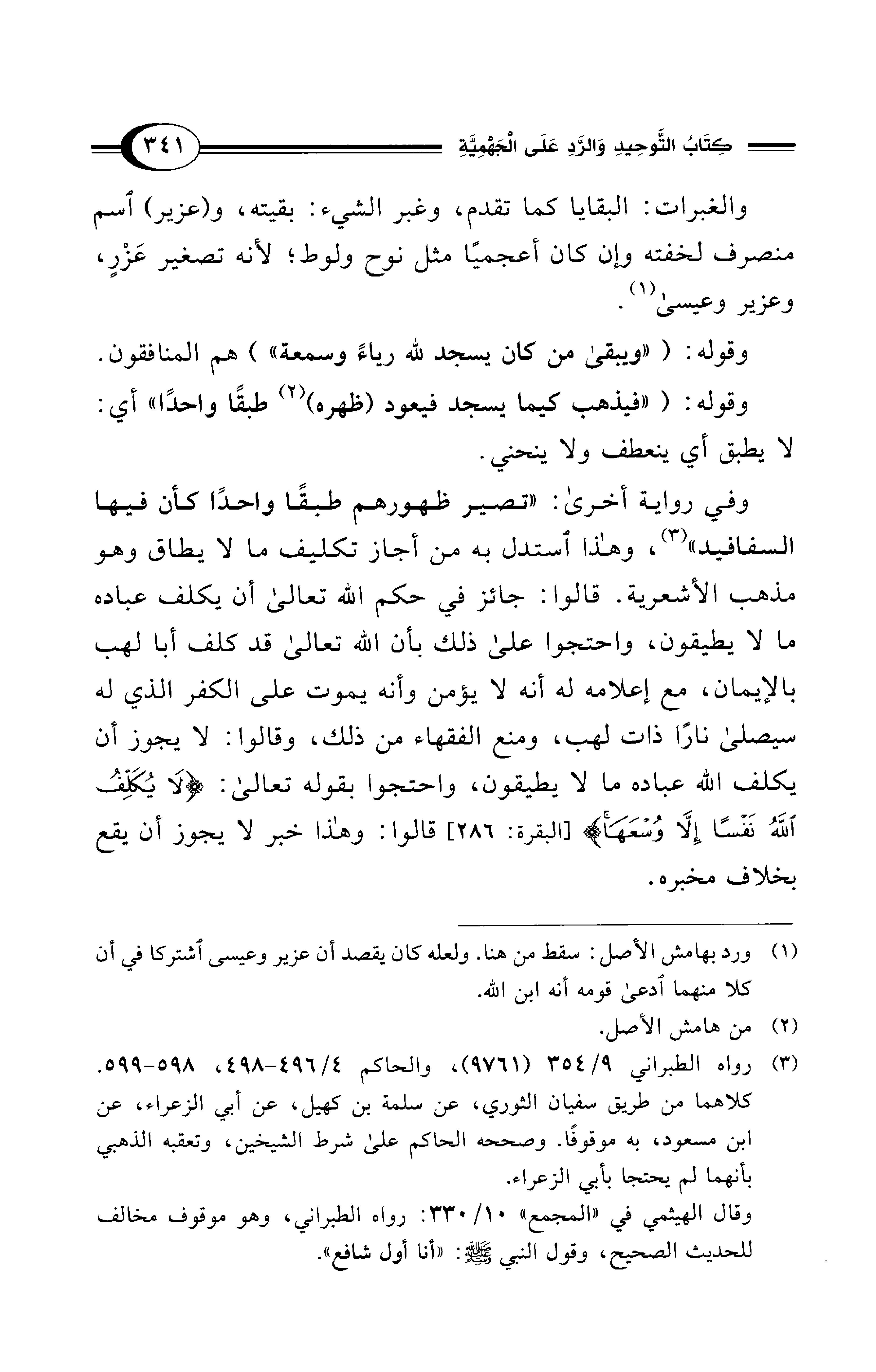 (¬1) ورد بهامش الأصل: سقط من هنا. ولعله كان يقصد أن عزير وعيسى اشتركا في أن كلا منهما ادعى قومه أنه ابن الله.