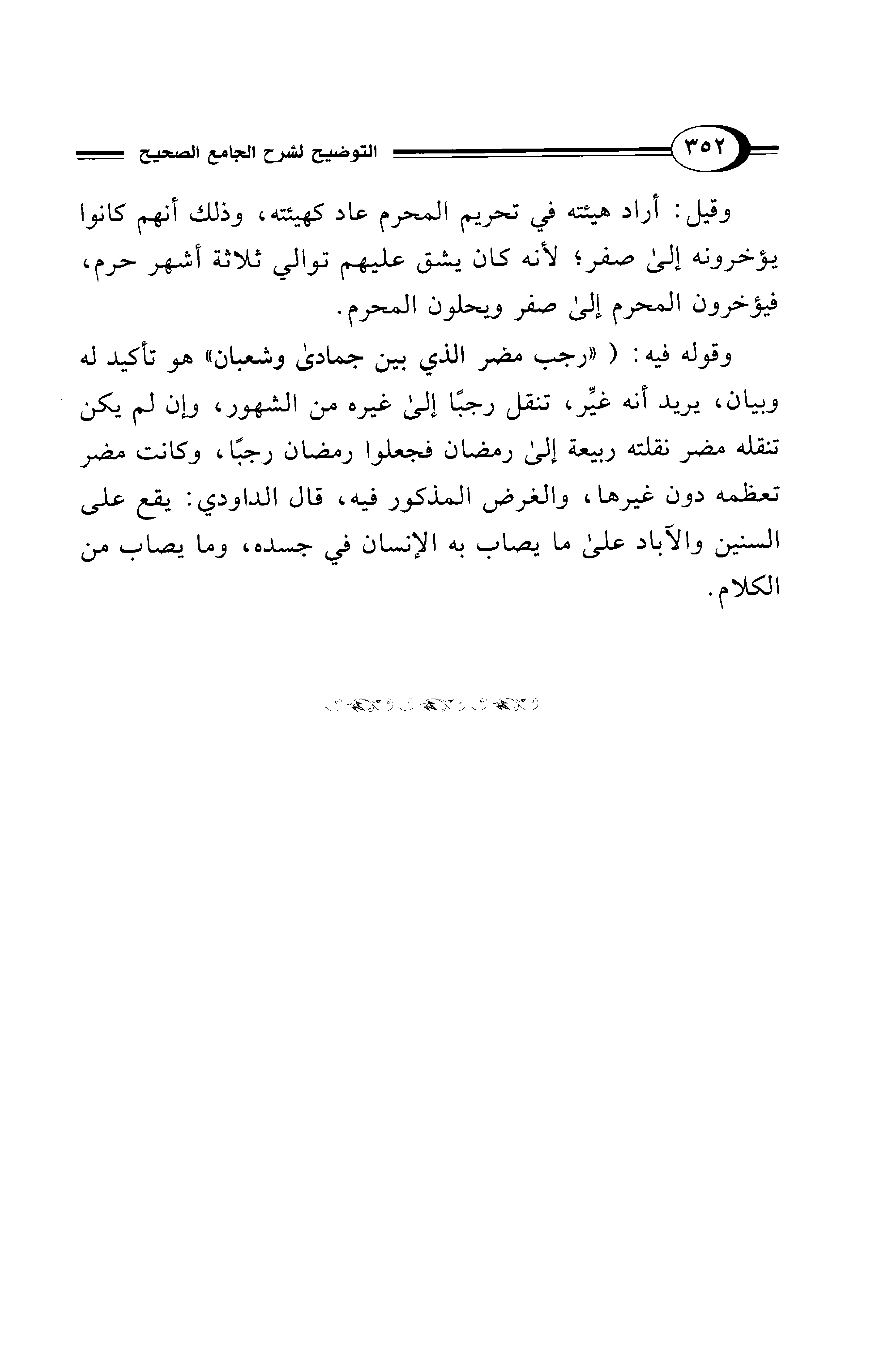 وقوله فيه: ("رجب مضر الذي بين جمادى وشعبان" هو تأكيد له وبيان، يريد أنه غيِّر، تنقل رجبًا إلى غيره من الشهور، وإن لم يكن تنقله مضر نقلته ربيعة إلى رمضان فجعلوا رمضان رجبًا، وكانت مضر تعظمه دون غيرها، والغرض المذكور فيه، قال الداودي: يقع على السنين والآباد على ما يصاب به الإنسان في جسده، وما يصاب من الكلام.