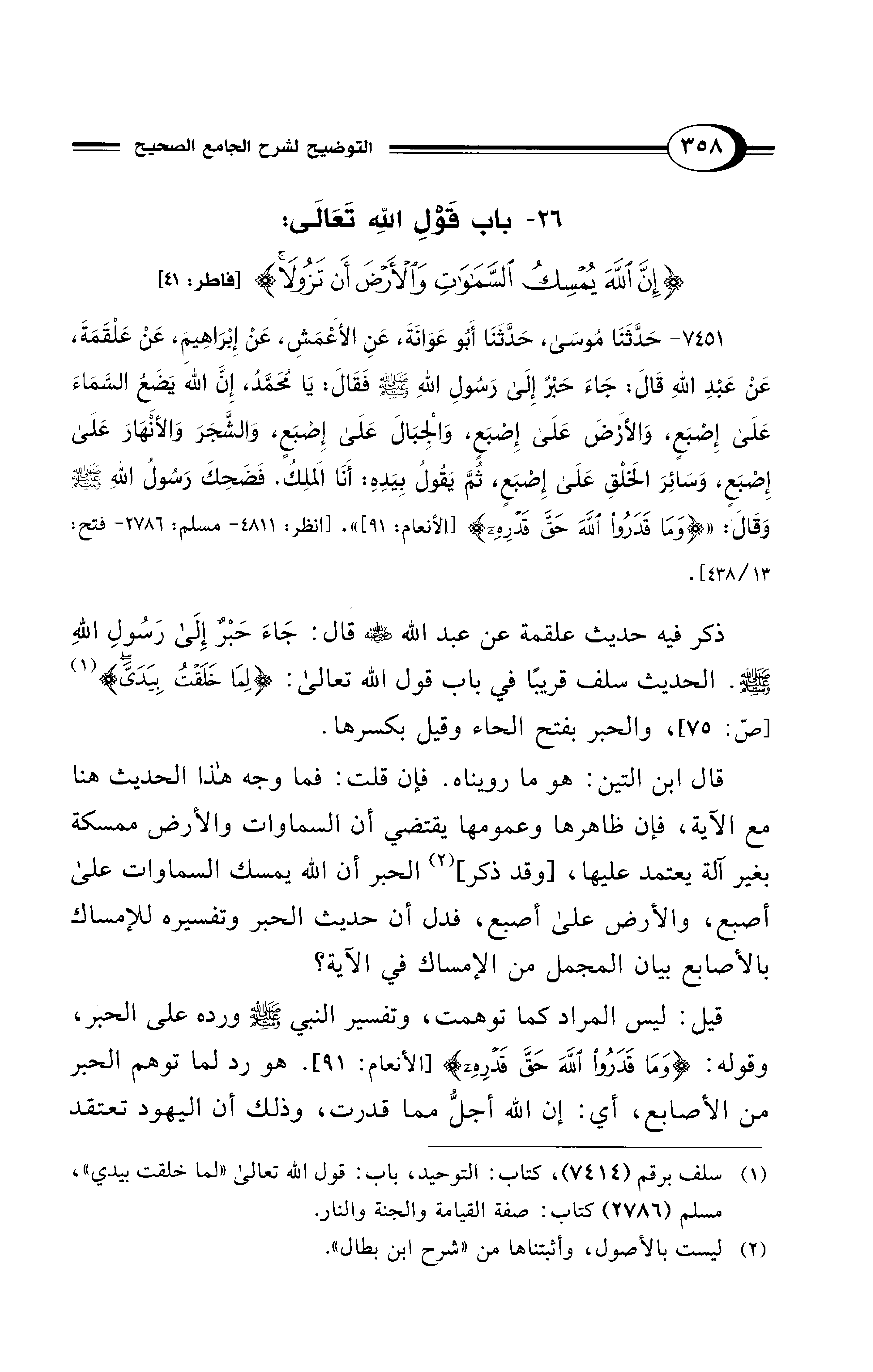 7451 - حَدَّثَنَا مُوسَى، حَدَّثَنَا أَبُو عَوَانَةَ، عَنِ الأَعْمَشِ، عَنْ إِبْرَاهِيمَ، عَنْ عَلْقَمَةَ، عَنْ عَبْدِ اللهِ قَالَ: جَاءَ حَبْرٌ إِلَى رَسُولِ اللهِ - صلى الله عليه وسلم - فَقَالَ: يَا مُحَمَّدُ، إِنَّ اللهَ يَضَعُ السَّمَاءَ عَلَى إِصْبَعٍ، وَالأَرْضَ عَلَى إِصْبَعٍ، وَالْجِبَالَ عَلَى إِصْبَعٍ، وَالشَّجَرَ وَالأَنْهَارَ عَلَى إِصْبَعٍ، وَسَائِرَ الخَلْقِ عَلَى إِصْبَعٍ، ثُمَّ يَقُولُ بِيَدِهِ: أَنَا المَلِكُ. فَضَحِكَ رَسُولُ اللهِ - صلى الله عليه وسلم - وَقَالَ: «{وَمَا قَدَرُوا اللهَ حَقَّ قَدْرِه}» [الأنعام: 91]. [انظر: 4811 - مسلم: 2786 - فتح: 13/ 438].