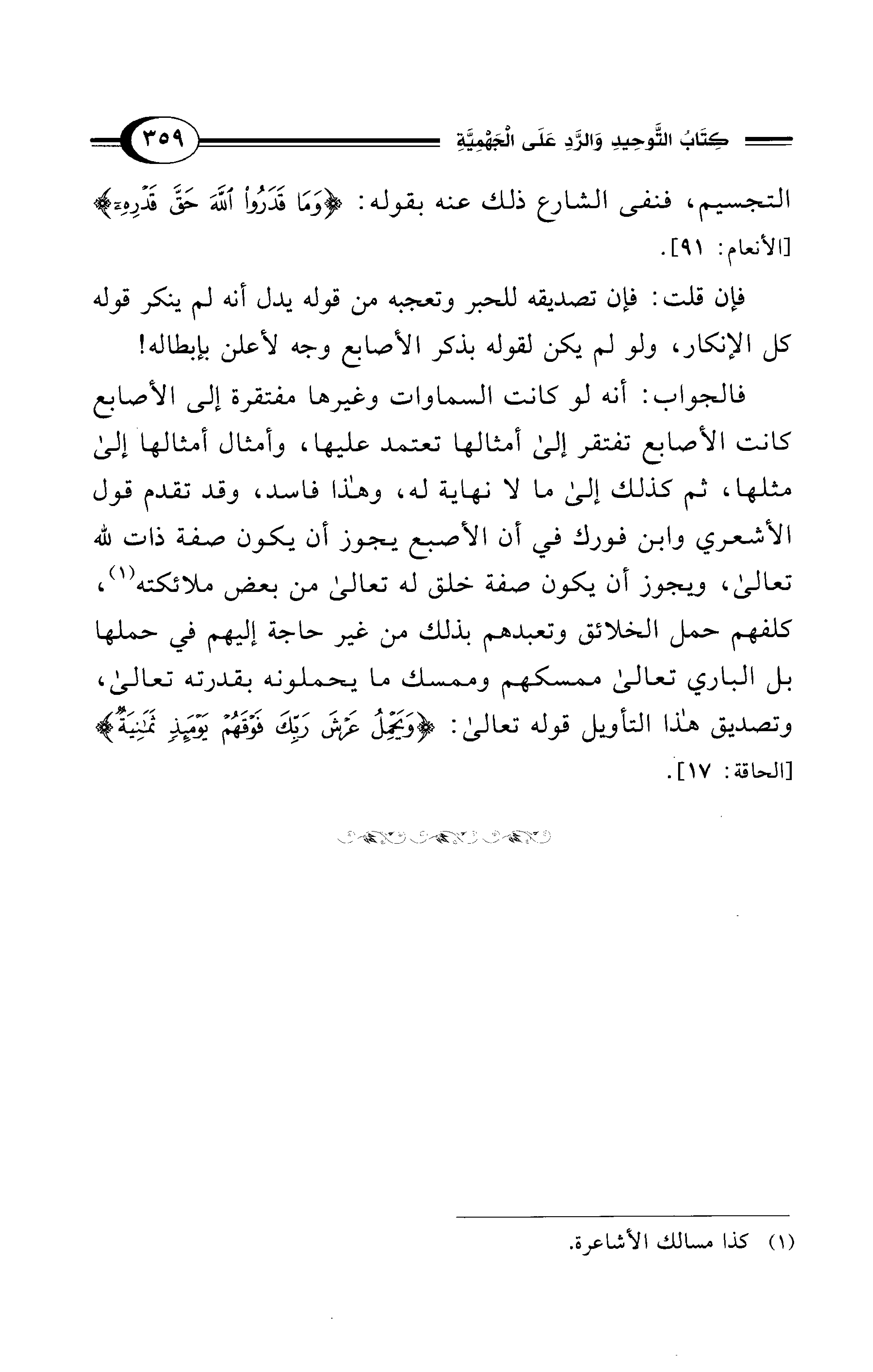 فالجواب: أنه لو كانت السماوات وغيرها مفتقرة إلى الأصابع كانت الأصابع تفتقر إلى أمثالها تعتمد عليها، وأمثال أمثالها إلى مثلها، ثم كذلك إلى ما لا نهاية له، وهذا فاسد، وقد تقدم قول الأشعري وابن فورك في أن الأصبع يجوز أن يكون صفة ذات لله تعالى، ويجوز أن يكون صفة خلق له تعالى من بعض ملائكته (¬1)، كلفهم حمل الخلائق وتعبدهم بذلك من غير حاجة إليهم في حملها بل الباري تعالى ممسكهم وممسك ما يحملونه بقدرته تعالى، وتصديق هذا التأويل قوله تعالى: {وَيَحْمِلُ عَرْشَ رَبِّكَ فَوْقَهُمْ يَوْمَئِذٍ ثَمَانِيَةٌ} [الحاقة: 17].
