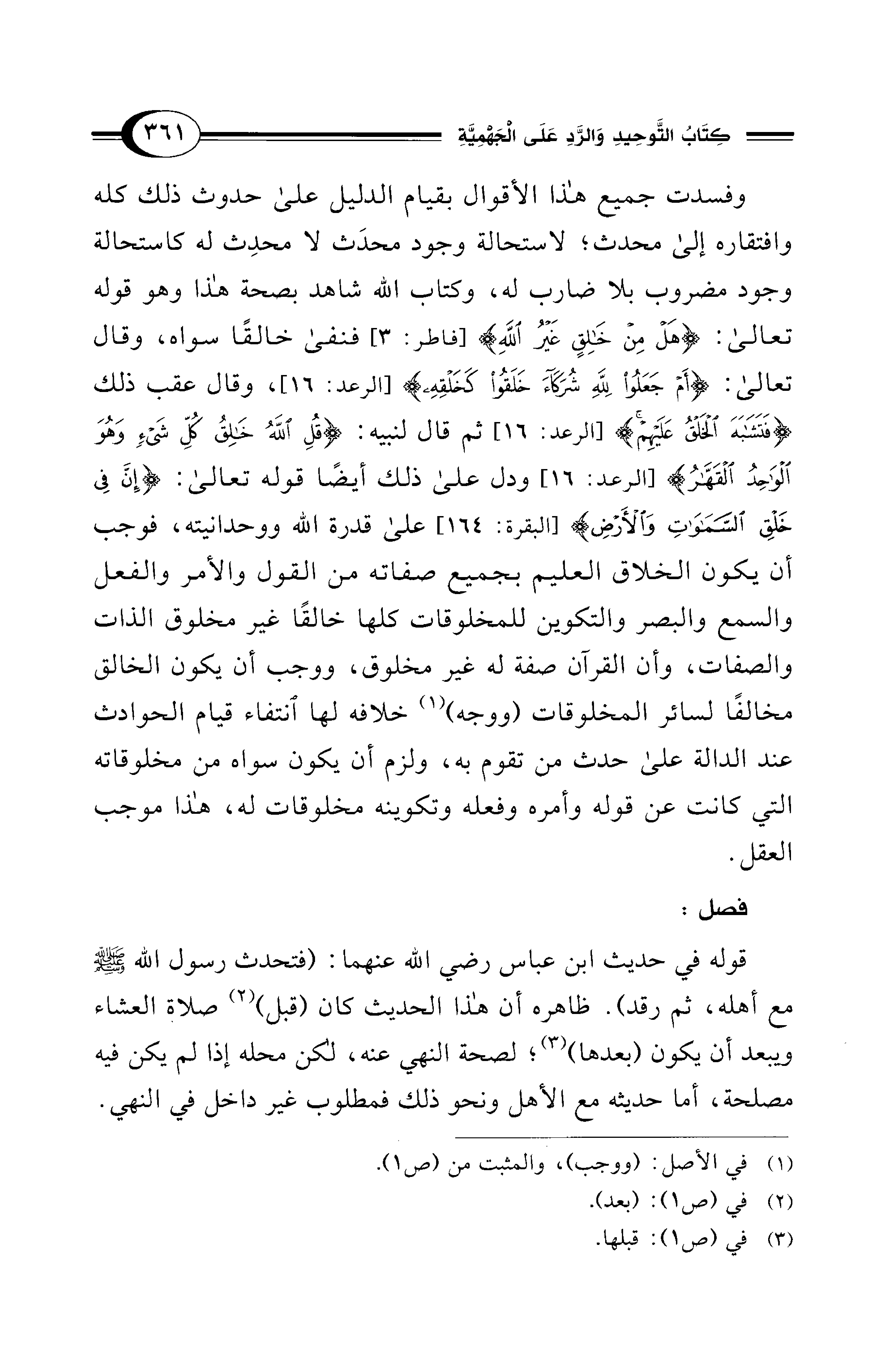 وفسدت جميع هذا الأقوال بقيام الدليل على حدوث ذلك كله وافتقاره إلى محدث؛ لاستحالة وجود محدَث لا محدِث له كاستحالة وجود مضروب بلا ضارب له، وكتاب الله شاهد بصحة هذا وهو قوله تعالى: {هَلْ مِنْ خَالِقٍ غَيْرُ اللهِ} [فاطر: 3] فنفى خالقًا سواه، وقال تعالى: {أَمْ جَعَلُوا لِلَّهِ شُرَكَاءَ خَلَقُوا كَخَلْقِهِ} [الرعد: 16]، وقال عقب ذلك {فَتَشَابَهَ الْخَلْقُ عَلَيْهِمْ} [الرعد: 16] ثم قال لنبيه: {قُلِ اللهُ خَالِقُ كُلِّ شَيْءٍ وَهُوَ الْوَاحِدُ الْقَهَّارُ} [الرعد: 16] ودل على ذلك أيضًا قوله تعالى: {إِنَّ فِي خَلْقِ السَّمَاوَاتِ وَالْأَرْضِ} [البقرة: 164] على قدرة الله ووحدانيته، فوجب أن يكون الخلاق العليم بجميع صفاته من القول والأمر والفعل والسمع والبصر والتكوين للمخلوقات كلها خالقًا غير مخلوق الذات والصفات، وأن القرآن صفة له غير مخلوق، ووجب أن يكون الخالق مخالفًا لسائر المخلوقات (ووجه) (¬1) خلافه لها انتفاء قيام الحوادث عند الدالة على حدث من تقوم به، ولزم أن يكون سواه من مخلوقاته التي كانت عن قوله وأمره وفعله وتكوينه مخلوقات له، هذا موجب العقل.
