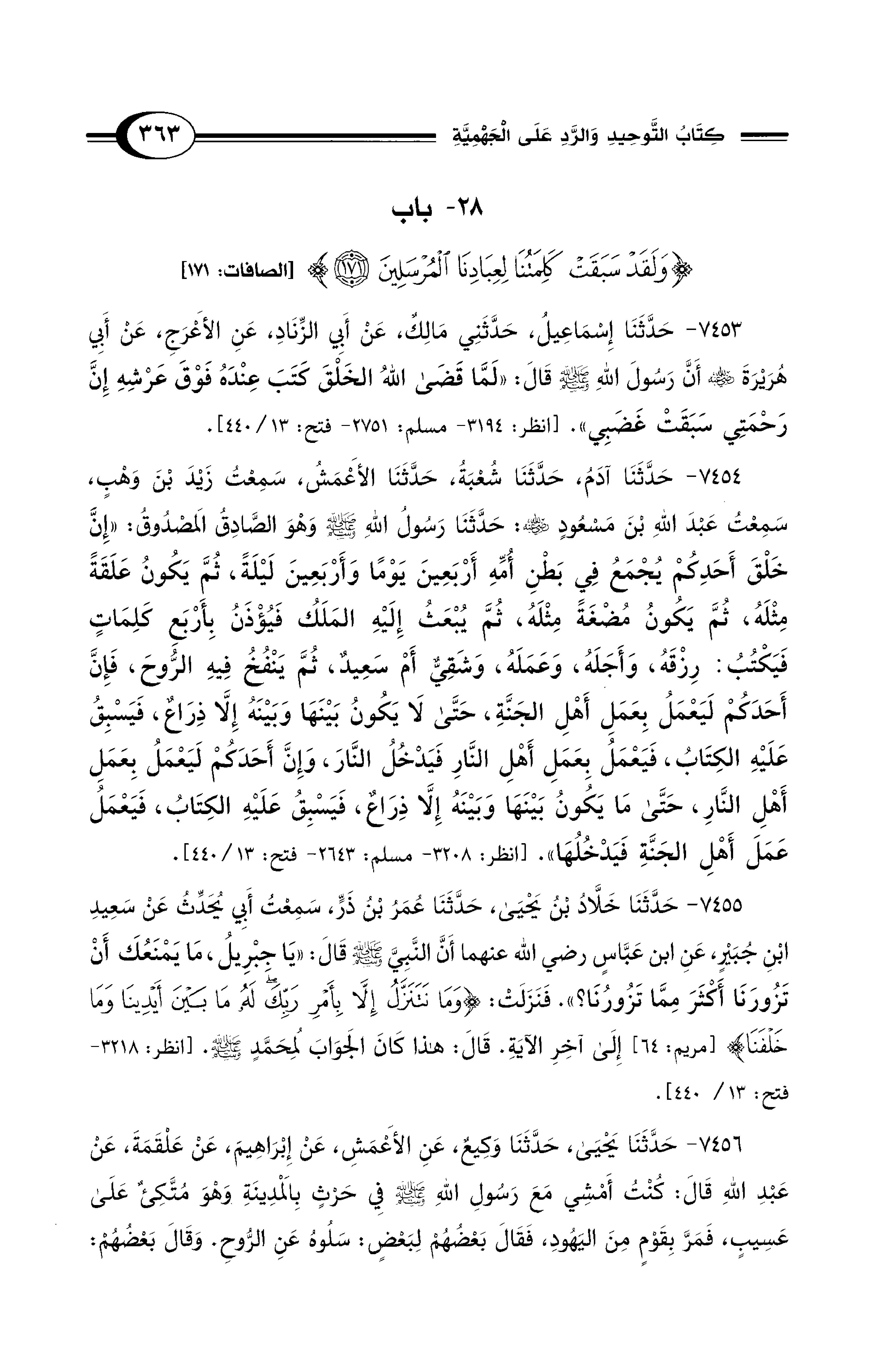 7454 - حَدَّثَنَا آدَمُ، حَدَّثَنَا شُعْبَةُ، حَدَّثَنَا الأَعْمَشُ، سَمِعْتُ زَيْدَ بْنَ وَهْبٍ، سَمِعْتُ عَبْدَ اللهِ بْنَ مَسْعُودٍ - رضي الله عنه -: حَدَّثَنَا رَسُولُ اللهِ - صلى الله عليه وسلم - وَهْوَ الصَّادِقُ المَصْدُوقُ: «إِنَّ خَلْقَ أَحَدِكُمْ يُجْمَعُ فِي بَطْنِ أُمِّهِ أَرْبَعِينَ يَوْمًا وَأَرْبَعِينَ لَيْلَةً، ثُمَّ يَكُونُ عَلَقَةً مِثْلَهُ، ثُمَّ يَكُونُ مُضْغَةً مِثْلَهُ، ثُمَّ يُبْعَثُ إِلَيْهِ الْمَلَكُ فَيُؤْذَنُ بِأَرْبَعِ كَلِمَاتٍ فَيَكْتُبُ: رِزْقَهُ وَأَجَلَهُ، وَعَمَلَهُ، وَشَقِىٌّ أَمْ سَعِيدٌ، ثُمَّ يَنْفُخُ فِيهِ الرُّوحَ، فَإِنَّ أَحَدَكُمْ لَيَعْمَلُ بِعَمَلِ أَهْلِ الجَنَّةِ، حَتَّى لاَ يَكُونُ بَيْنَهَا وَبَيْنَهُ إِلاَّ ذِرَاعٌ، فَيَسْبِقُ عَلَيْهِ الكِتَابُ، فَيَعْمَلُ بِعَمَلِ أَهْلِ النَّارِ فَيَدْخُلُ النَّارَ، وَإِنَّ أَحَدَكُمْ لَيَعْمَلُ بِعَمَلِ أَهْلِ النَّارِ، حَتَّى مَا يَكُونُ بَيْنَهَا وَبَيْنَهُ إِلاَّ ذِرَاعٌ، فَيَسْبِقُ عَلَيْهِ الكِتَابُ، فَيَعْمَلُ عَمَلَ أَهْلِ الجَنَّةِ فَيَدْخُلُهَا» [انظر: 3208 - مسلم:2643 - فتح: 13/ 440]