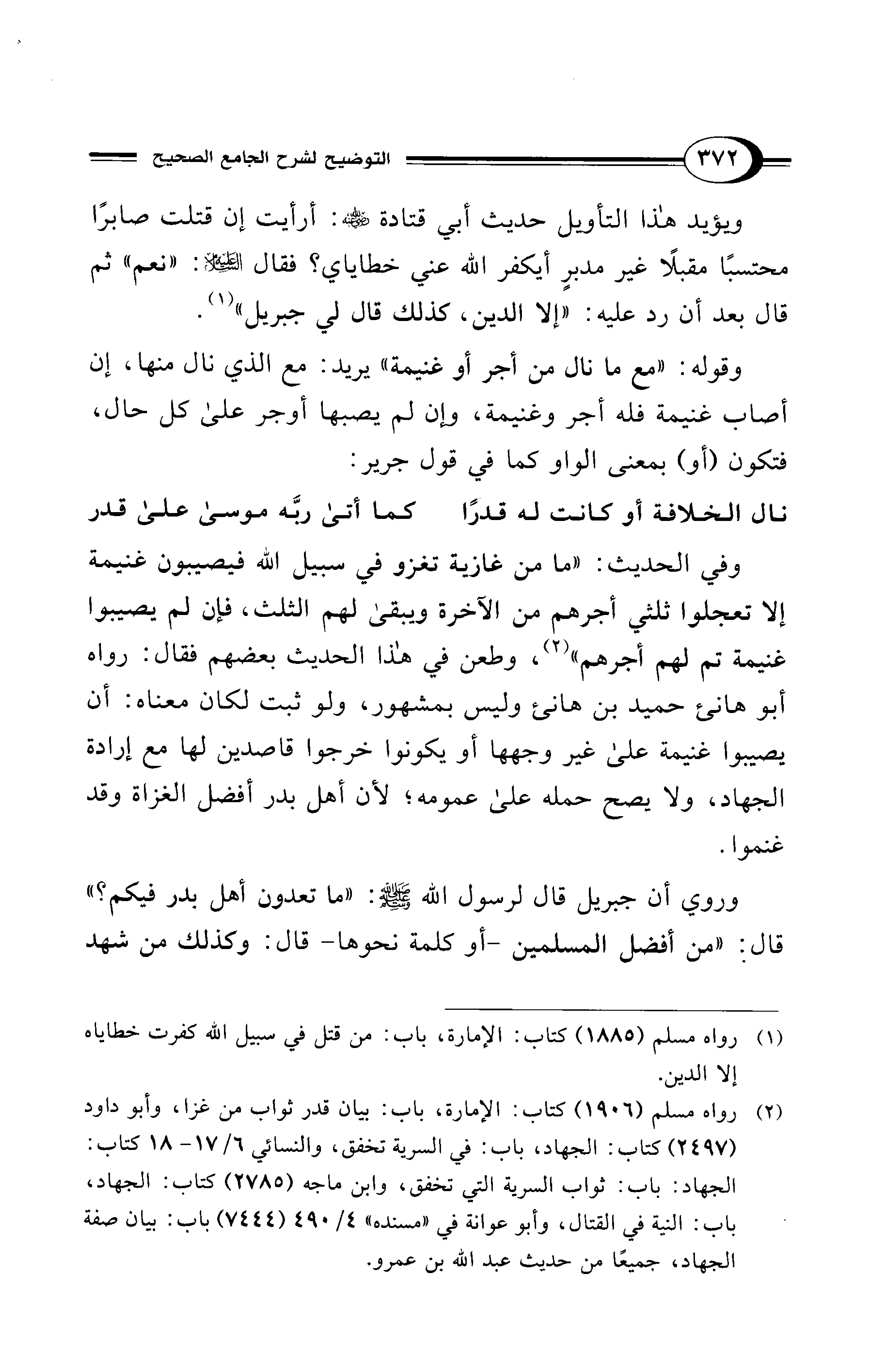 (¬2) رواه مسلم (1906) كتاب: الإمارة، باب: بيان قدر ثواب من غزا، وأبو داود (2497) كتاب: الجهاد، باب: في السرية تخفق، والنسائي 6/ 17 - 18 كتاب: الجهاد: باب: ثواب السرية التي تخفق، وابن ماجه (2785) كتاب: الجهاد، باب: النية في القتال، وأبو عوانة في "مسنده" 4/ 490 (7444) باب: بيان صفة الجهاد، جميعًا من حديث عبد الله بن عمرو.
