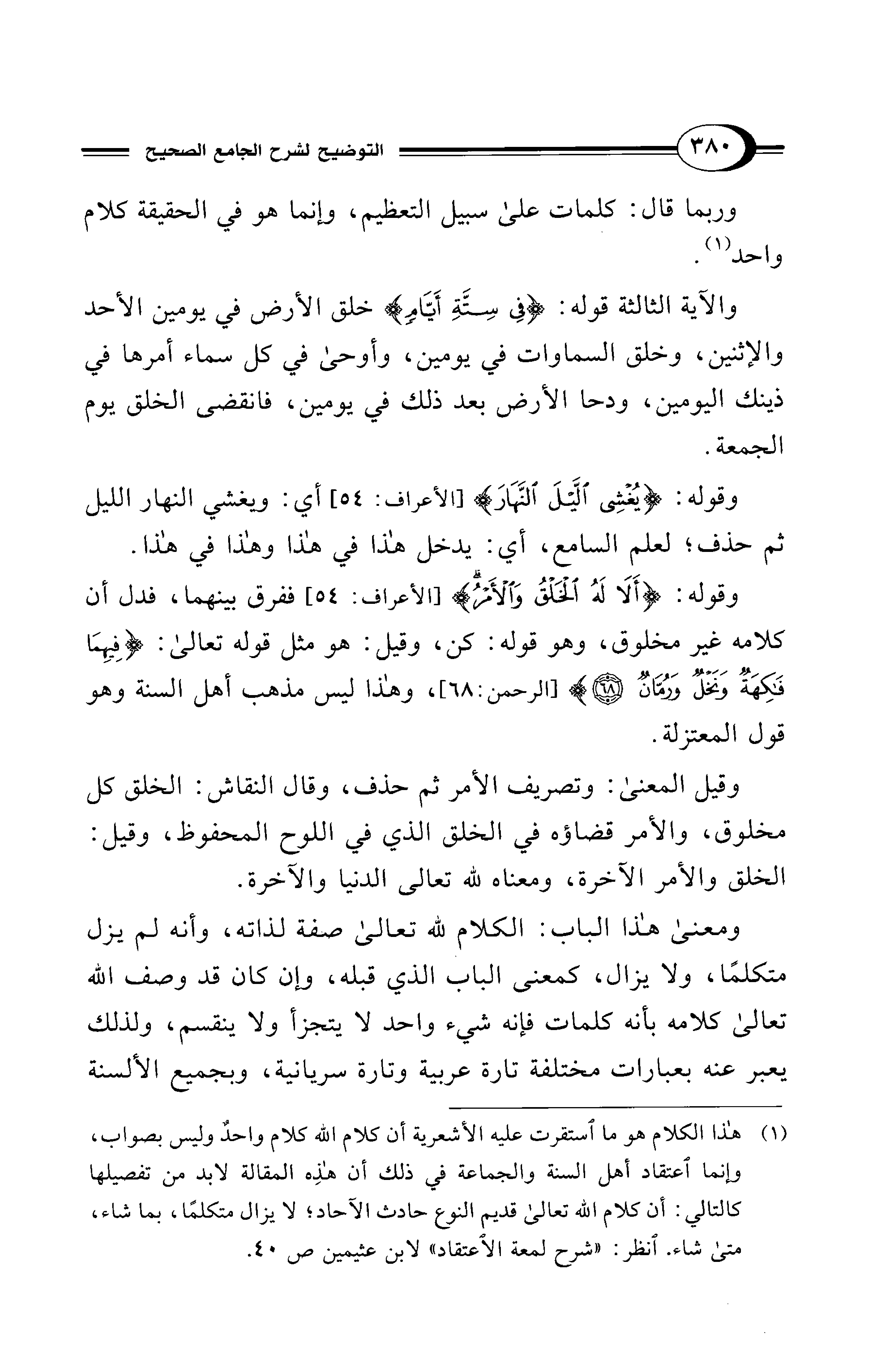 (¬1) هذا الكلام هو ما استقرت عليه الأشعرية أن كلام الله كلام واحدٌ وليس بصواب، وإنما اعتقاد أهل السنة والجماعة في ذلك أن هذِه المقالة لابد من تفصيلها كالتالي: أن كلام الله تعالى قديم النوع حادث الآحاد؛ لايزال متكلمًا، بما شاء، متى شاء. انظر: "شرح لمعة الاعتقاد" لابن عثيمين ص40.
