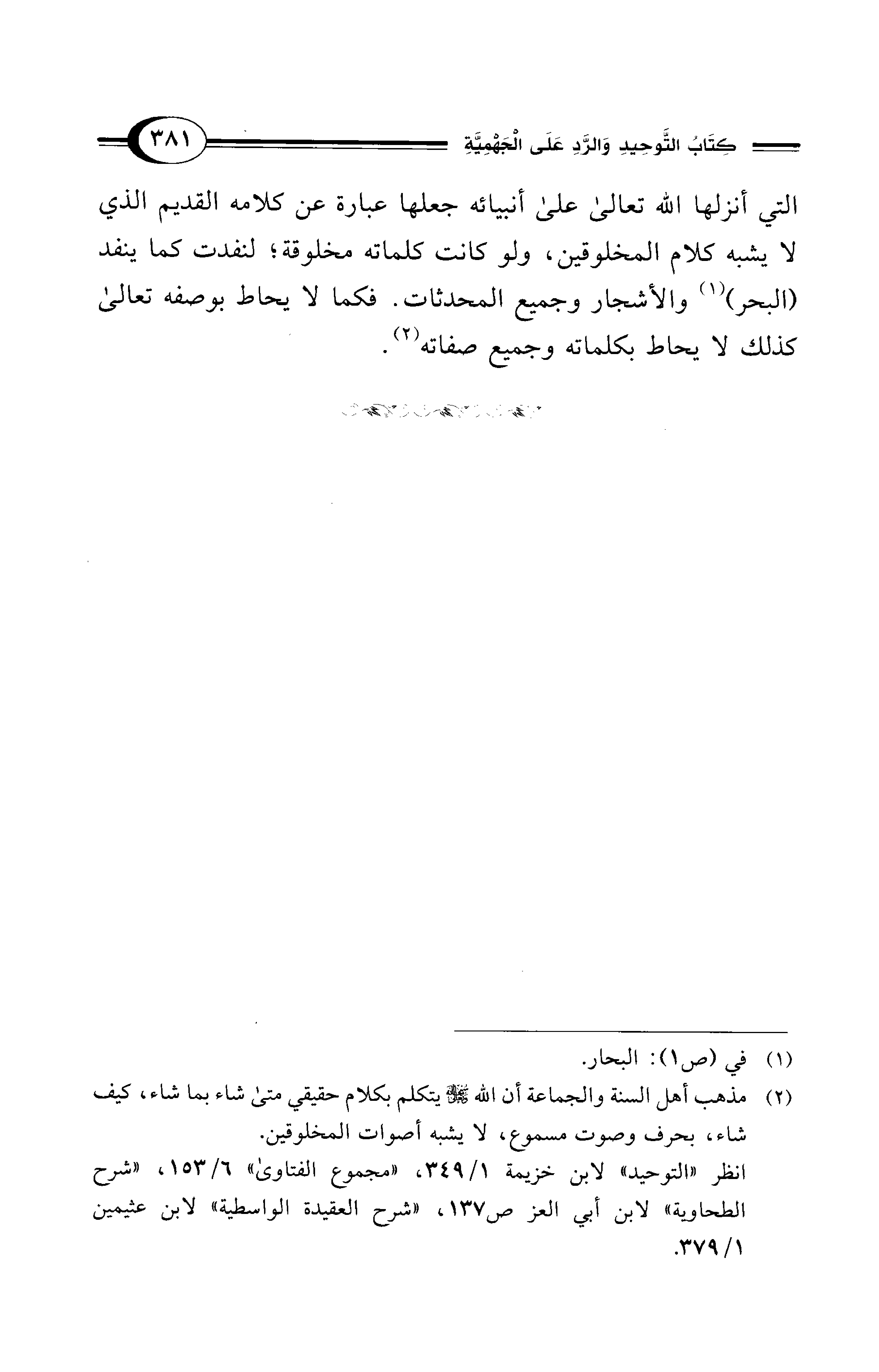 انظر "التوحيد" لابن خزيمة 1/ 349، "مجموع الفتاوى" 6/ 153، "شرح الطحاوية" لابن أبي العز ص137، "شرح العقيدة الواسطية" لابن عثيمين 1/ 379.