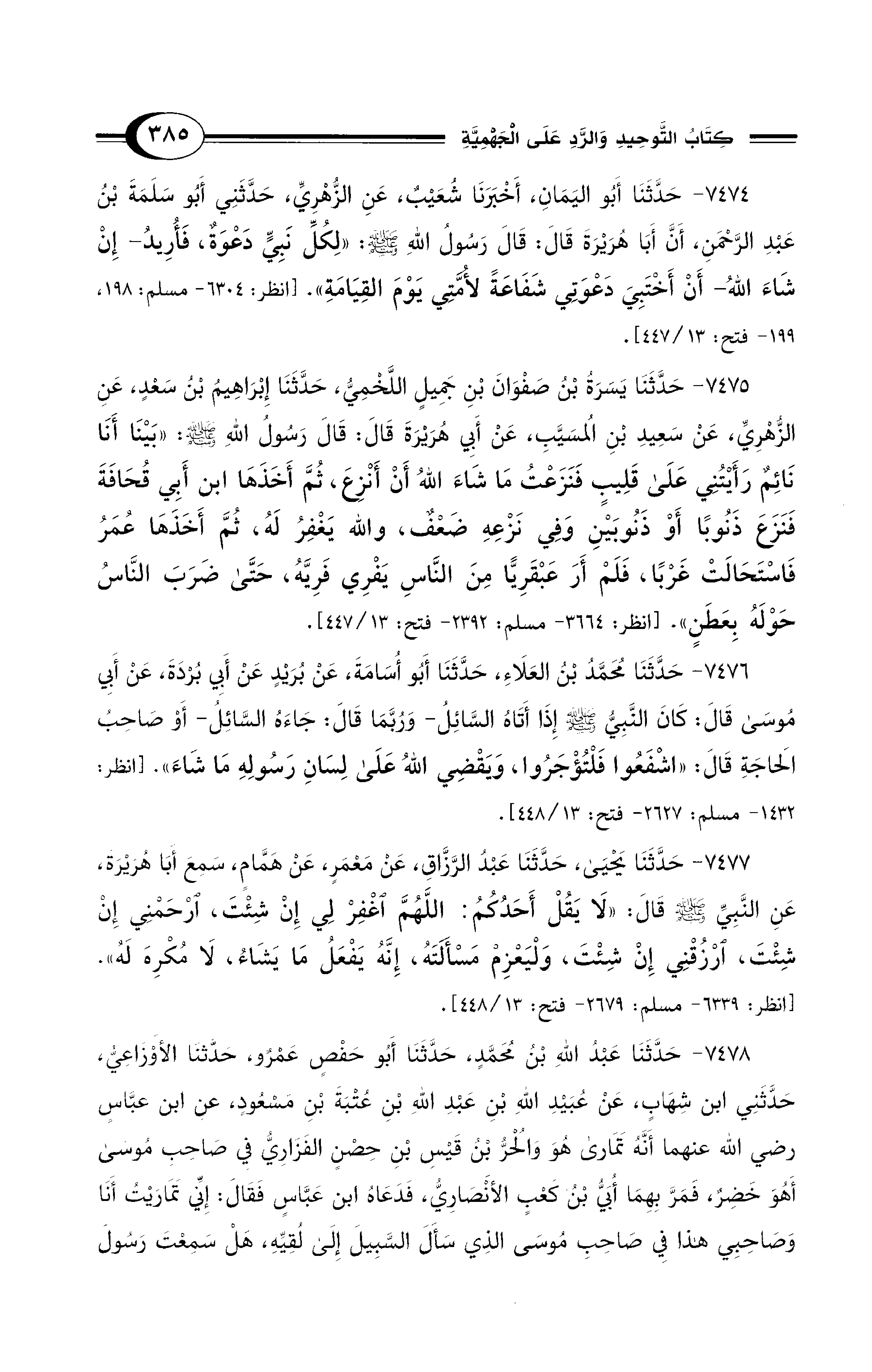 7474 - حَدَّثَنَا أَبُو اليَمَانِ، أَخْبَرَنَا شُعَيْبٌ، عَنِ الزُّهْرِيِّ، حَدَّثَنِي أَبُو سَلَمَةَ بْنُ عَبْدِ الرَّحْمَنِ، أَنَّ أَبَا هُرَيْرَةَ قَالَ: قَالَ رَسُولُ اللهِ - صلى الله عليه وسلم -: «لِكُلِّ نَبِيٍّ دَعْوَةٌ، فَأُرِيدُ -إِنْ شَاءَ اللهُ- أَنْ أَخْتَبِيَ دَعْوَتِي شَفَاعَةً لأُمَّتِي يَوْمَ القِيَامَةِ». [انظر: 6304 - مسلم: 198، 199 - فتح: 13/ 447].