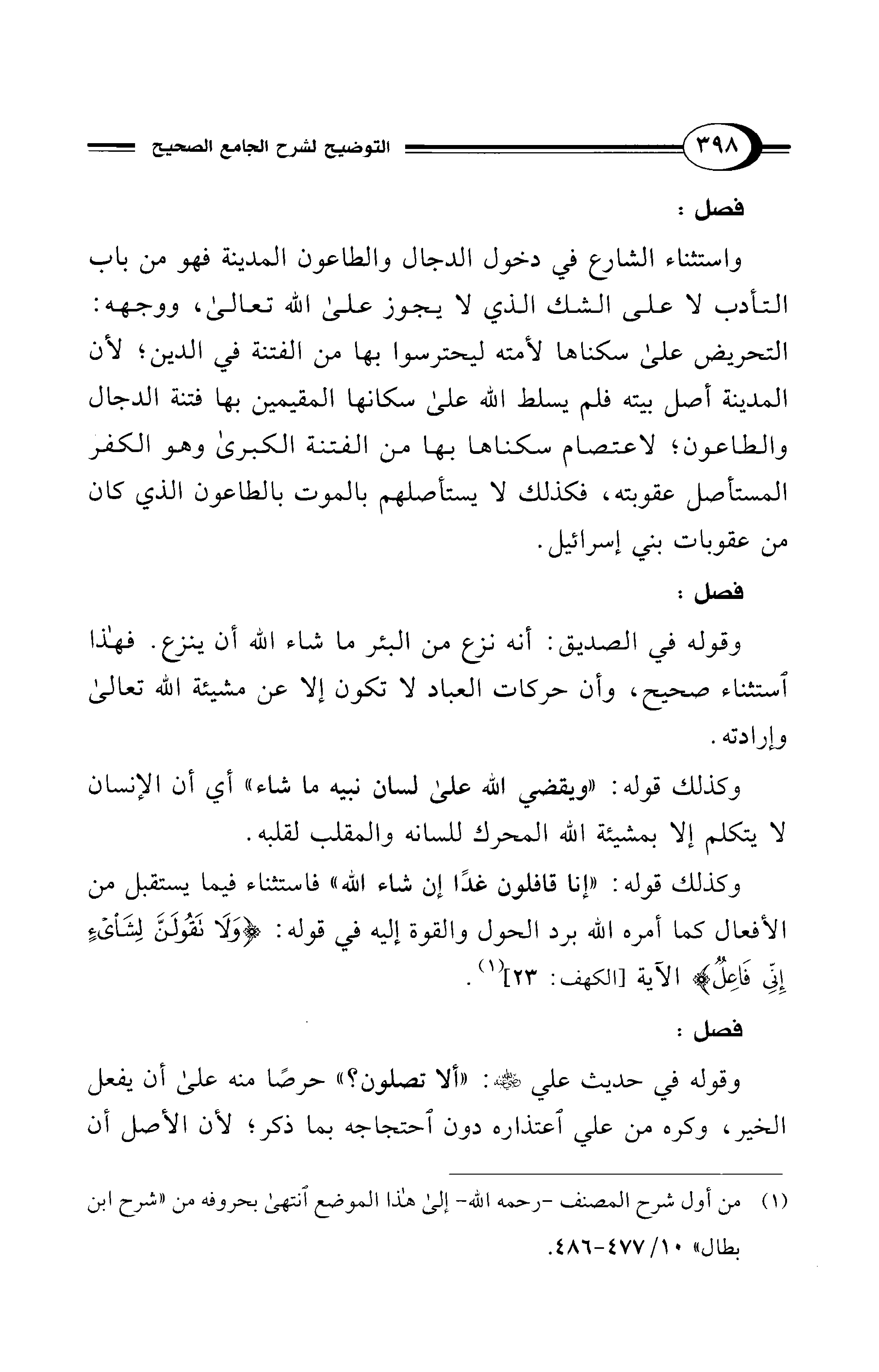 وكذلك قوله: "إنا قافلون غدًا إن شاء الله" فاستثناء فيما يستقبل من الأفعال كما أمره الله برد الحول والقوة إليه في قوله: {وَلَا تَقُولَنَّ لِشَيْءٍ إِنِّي فَاعِلٌ} [الكهف: 23]. (¬1)