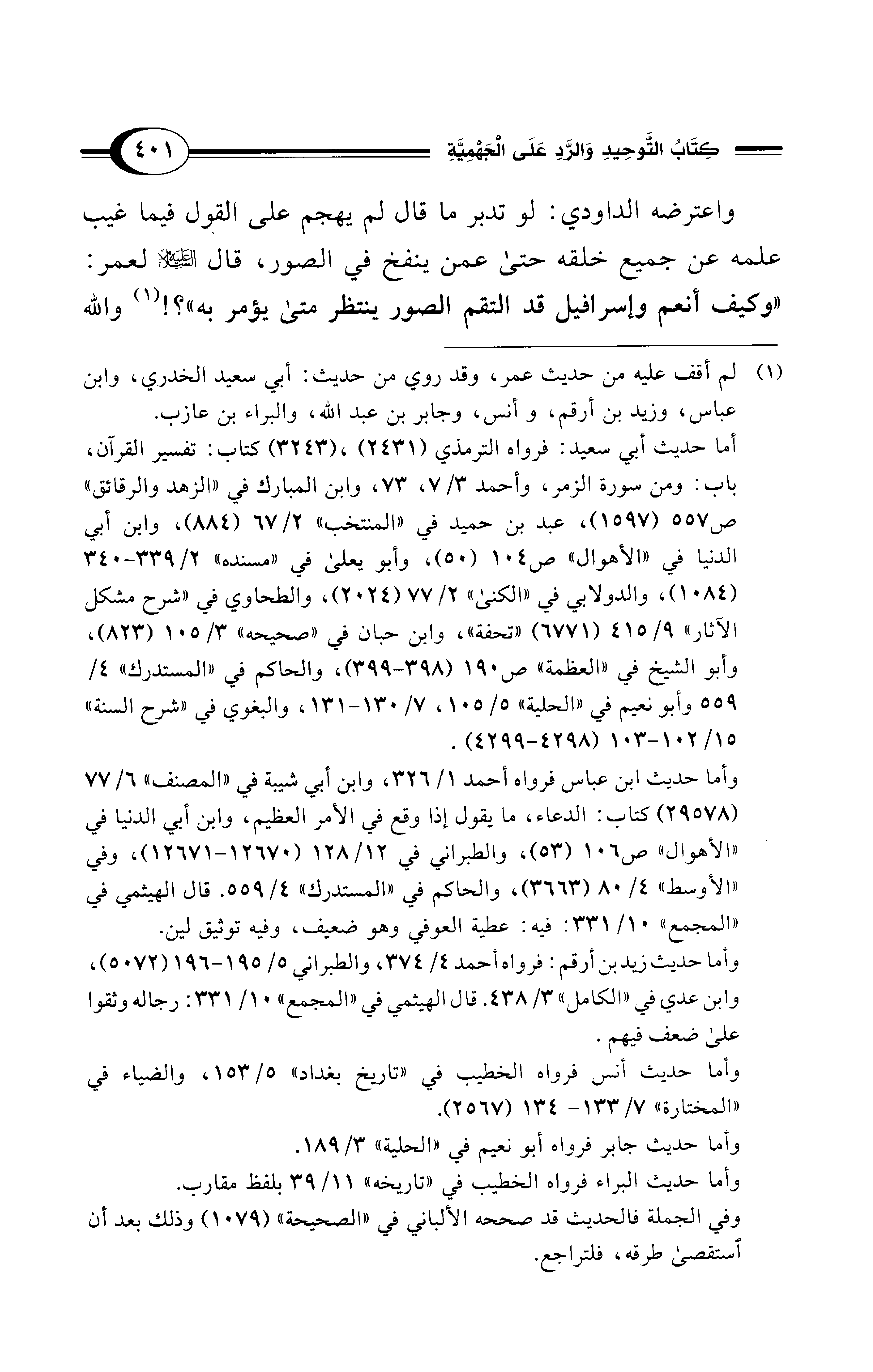 واعترضه الداودي: لو تدبر ما قال لم يهجم على القول فيما غيب علمه عن جميع خلقه حتى عمن ينفخ في الصور، قال - عليه السلام - لعمر: "وكيف أنعم وإسرافيل قد التقم الصور ينتظر متي يؤمر به"؟! (¬1) والله