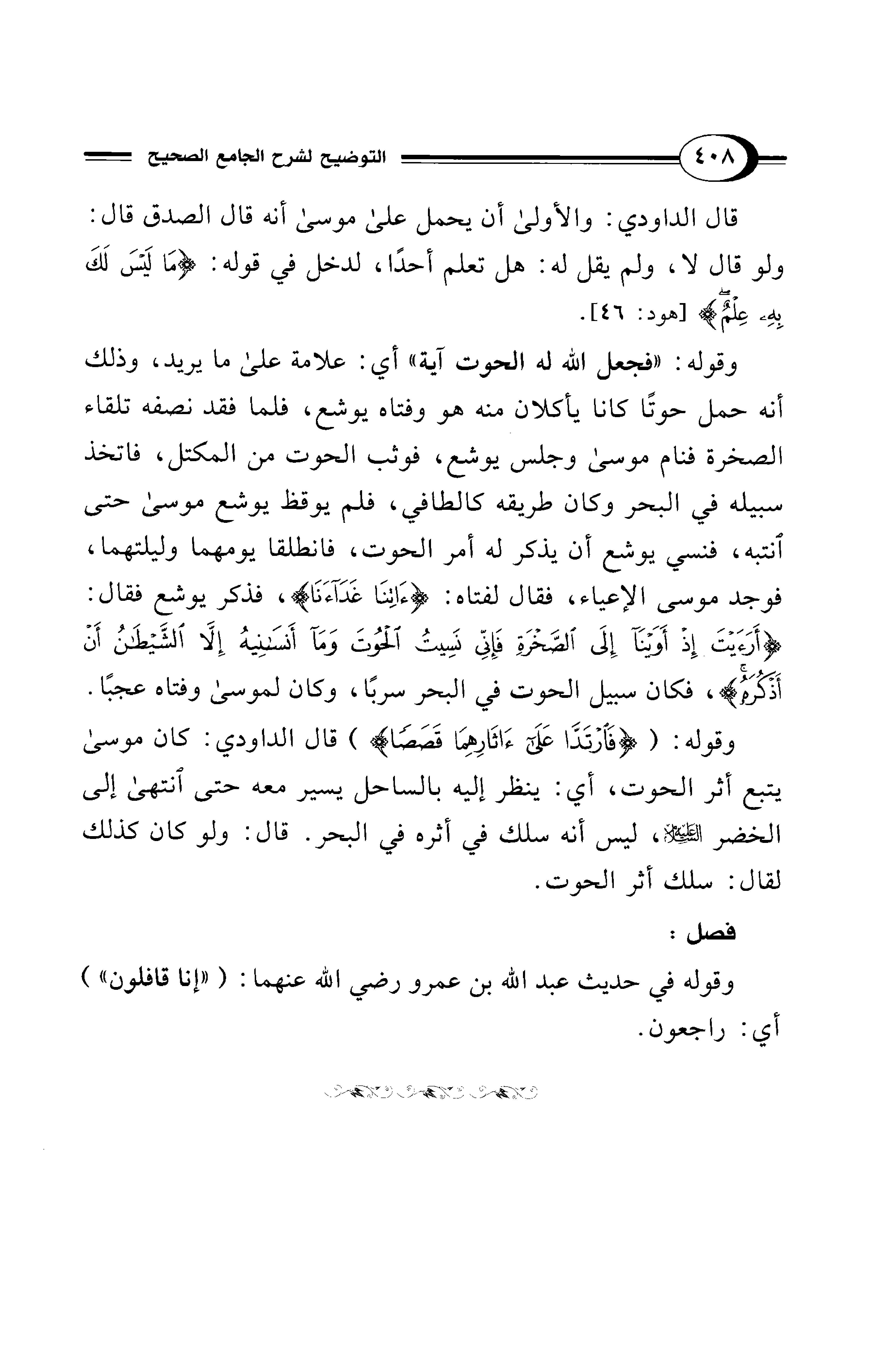 وقوله: ({فَارْتَدَّا عَلَى آثَارِهِمَا قَصَصًا}) قال الداودي: كان موسى يتبع أثر الحوت، أي: ينظر إليه بالساحل يسير معه حتى انتهى إلى الخضر - عليه السلام -، ليس أنه سلك في أثره في البحر. قال: ولو كان كذلك لقال: سلك أثر الحوت.