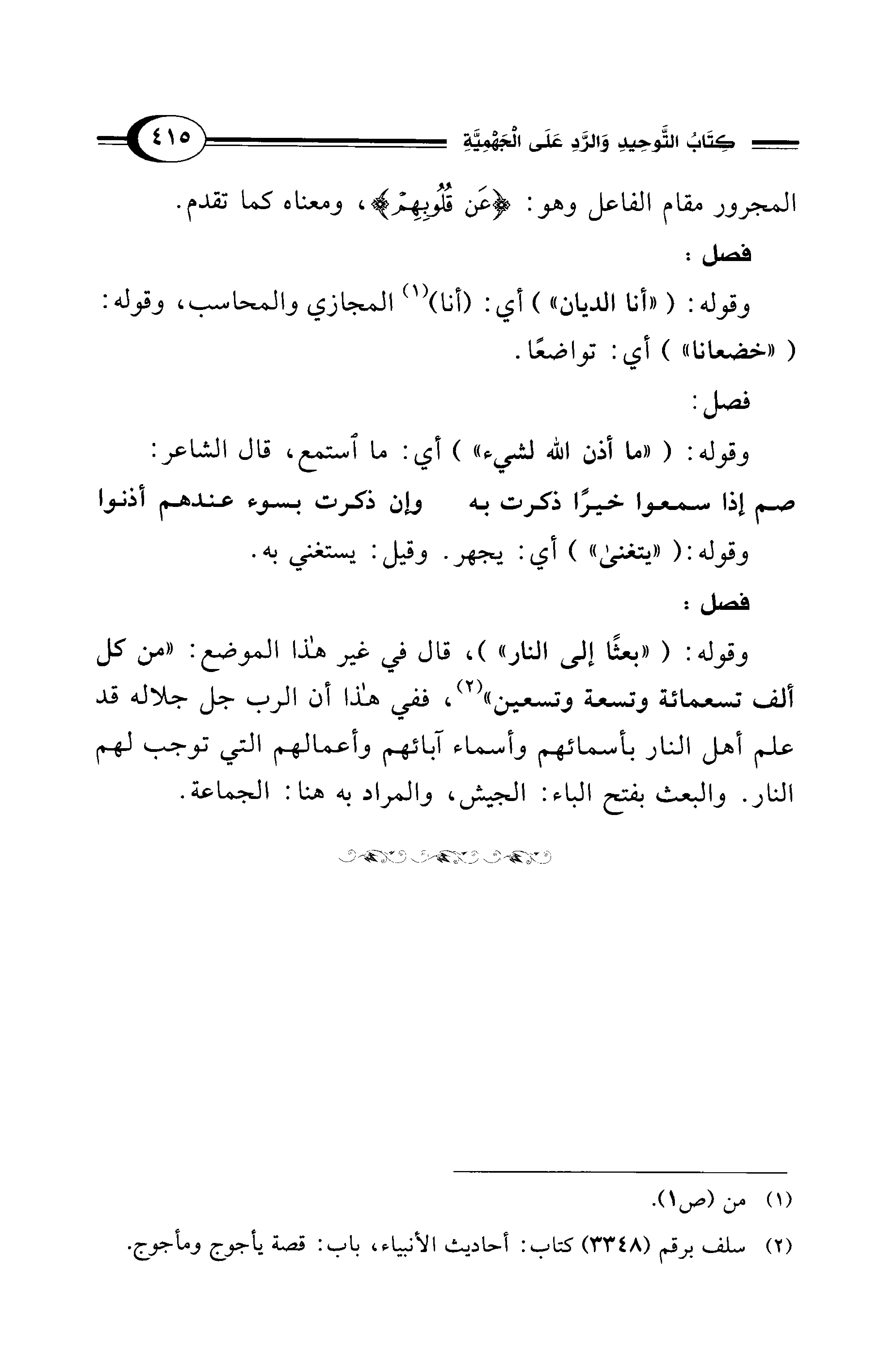 وقوله: ("بعثًا إلى النار")، قال في غير هذا الموضع: "من كل ألف تسعمائة وتسعة وتسعين" (¬2)، ففي هذا أن الرب -جل جلاله- قد علم أهل النار بأسمائهم وأسماء آبائهم وأعمالهم التي توجب لهم النار. والبعث بفتح الباء: الجيش، والمراد به هنا: الجماعة.