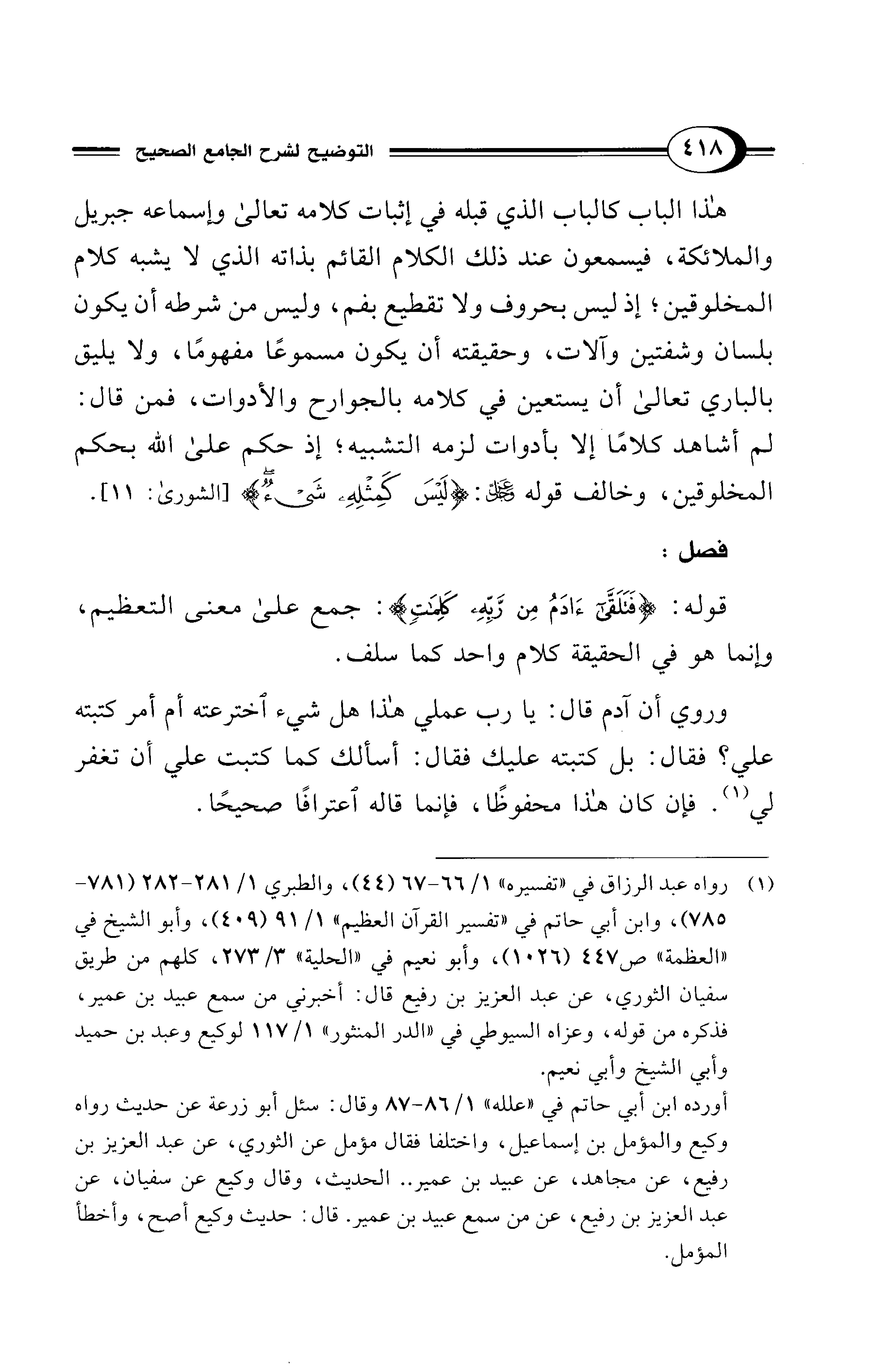 هذا الباب كالباب الذي قبله في إثبات كلامه تعالى وإسماعه جبريل والملائكة، فيسمعون عند ذلك الكلام القائم بذاته الذي لا يشبه كلام المخلوقين؛ إذ ليس بحروف ولا تقطيع بفم، وليس من شرطه أن يكون بلسان وشفتين وآلات، وحقيقته أن يكون مسموعًا مفهومًا، ولا يليق بالباري تعالى أن يستعين في كلامه بالجوارح والأدوات، فمن قال: لم أشاهد كلامًا إلا بأدوات لزمه التشبيه؛ إذ حكم على الله بحكم المخلوقين، وخالف قوله -عَزَّ وَجَلَّ-: {لَيْسَ كَمِثْلِهِ شَيْءٌ} [الشورى: 11].