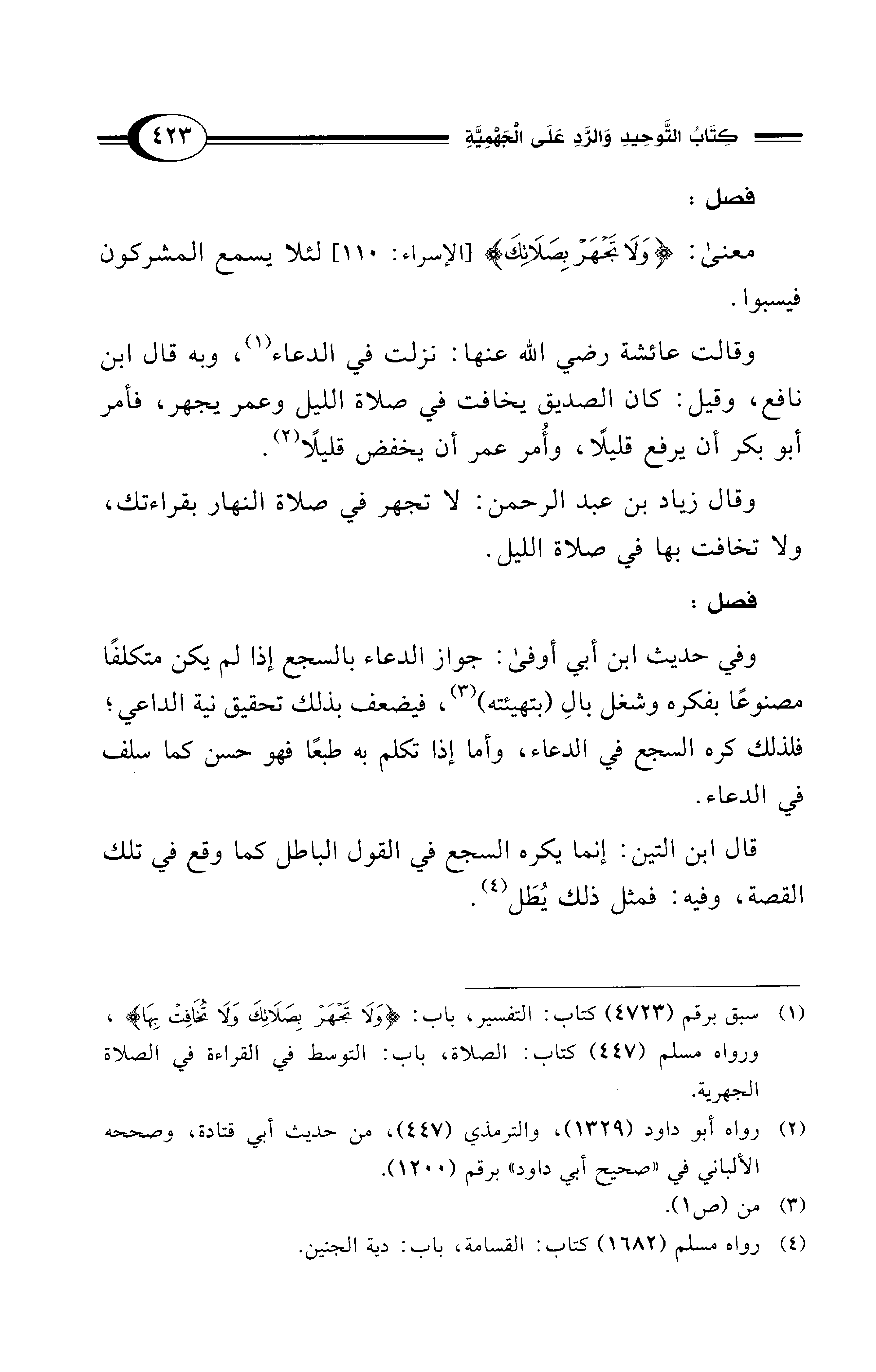 معنى: {وَلَا تَجْهَرْ بِصَلَاتِكَ} [الإسراء: 110] لئلا يسمع المشركون فيسبوا.