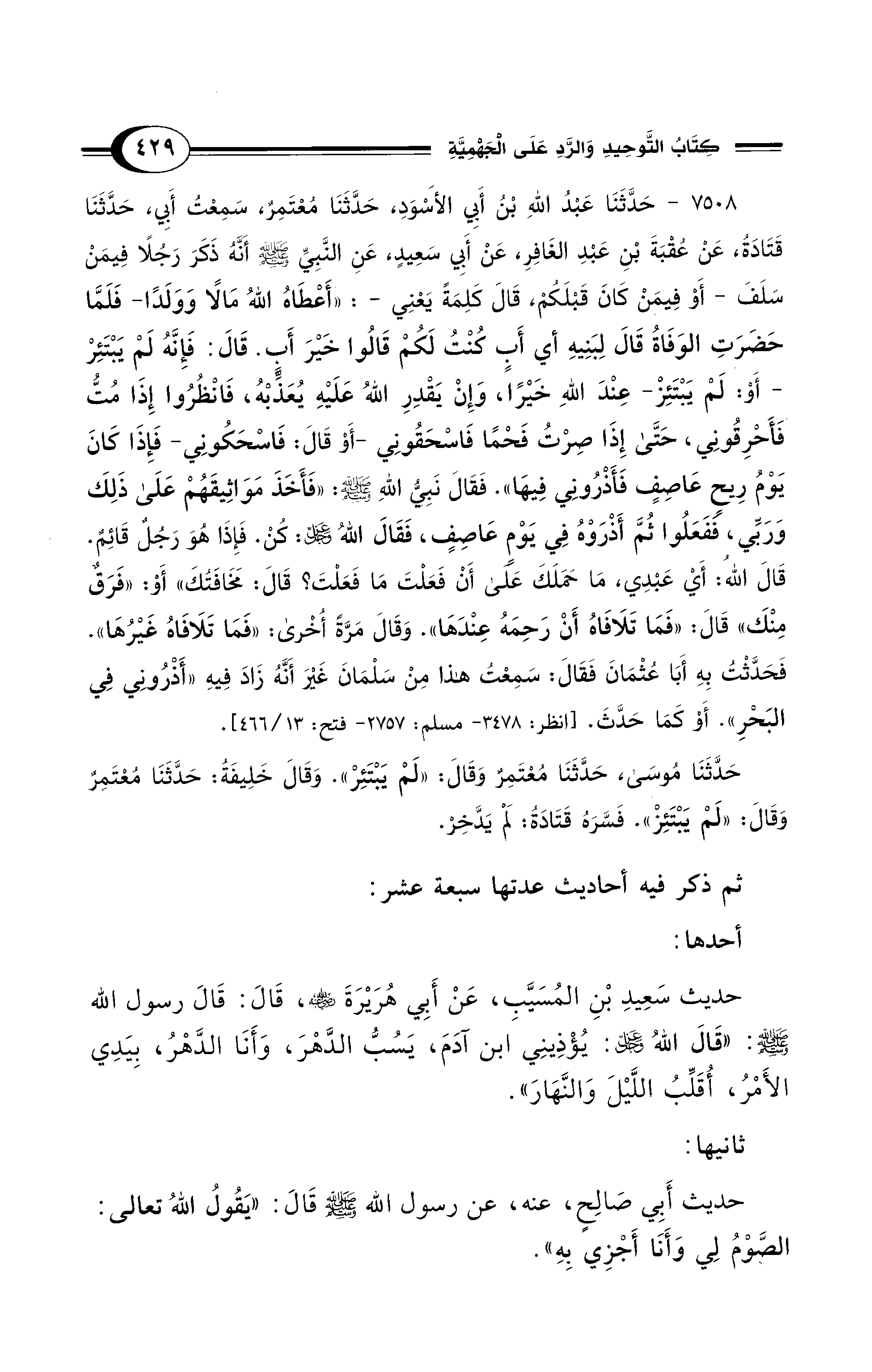 حديث سَعِيدِ بْنِ المُسَيَّبِ، عَنْ أَبِي هُرَيْرَةَ - رضي الله عنه -، قَالَ: قَالَ رسول الله - صلى الله عليه وسلم -: "قَالَ اللهُ -عَزَّ وَجَلَّ-: يُؤْذِينِي ابن آدَمَ، يَسُبُّ الدَّهْرَ، وَأَنَا الدَّهْرُ، بِيَدِي الأَمْرُ، أُقَلِّبُ اللَّيْلَ وَالنَّهَارَ".