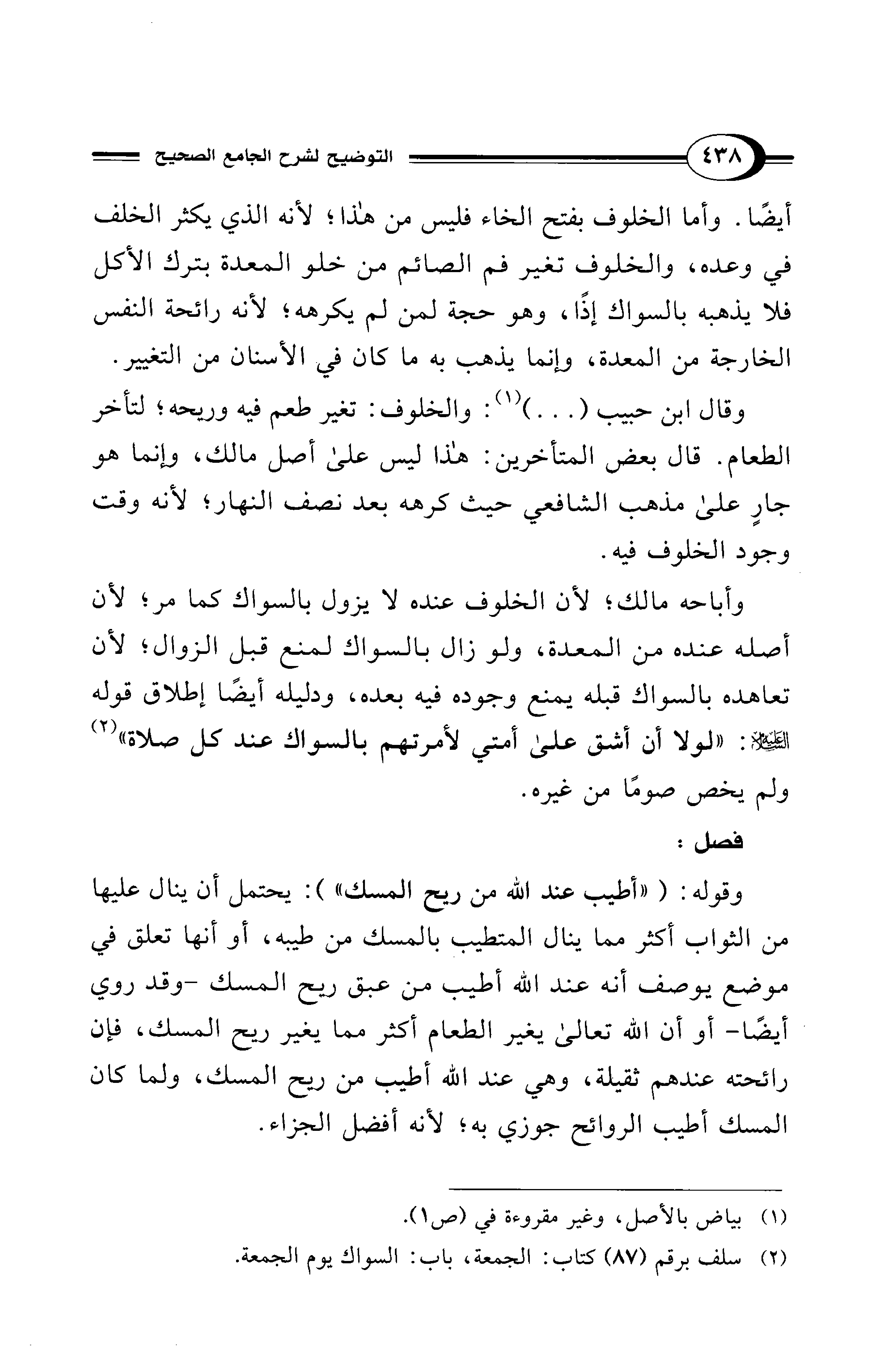 أيضًا. وأما الخلوف بفتح الخاء فليس من هذا؛ لأنه الذي يكثر الخلف في وعده، والخلوف تغير فم الصائم من خلو المعدة بترك الأكل فلا يذهبه بالسواك إذًا، وهو حجة لمن لم يكرهه؛ لأنه رائحة النفس الخارجة من المعدة، وإنما يذهب به ما كان في الأسنان من التغيير.
