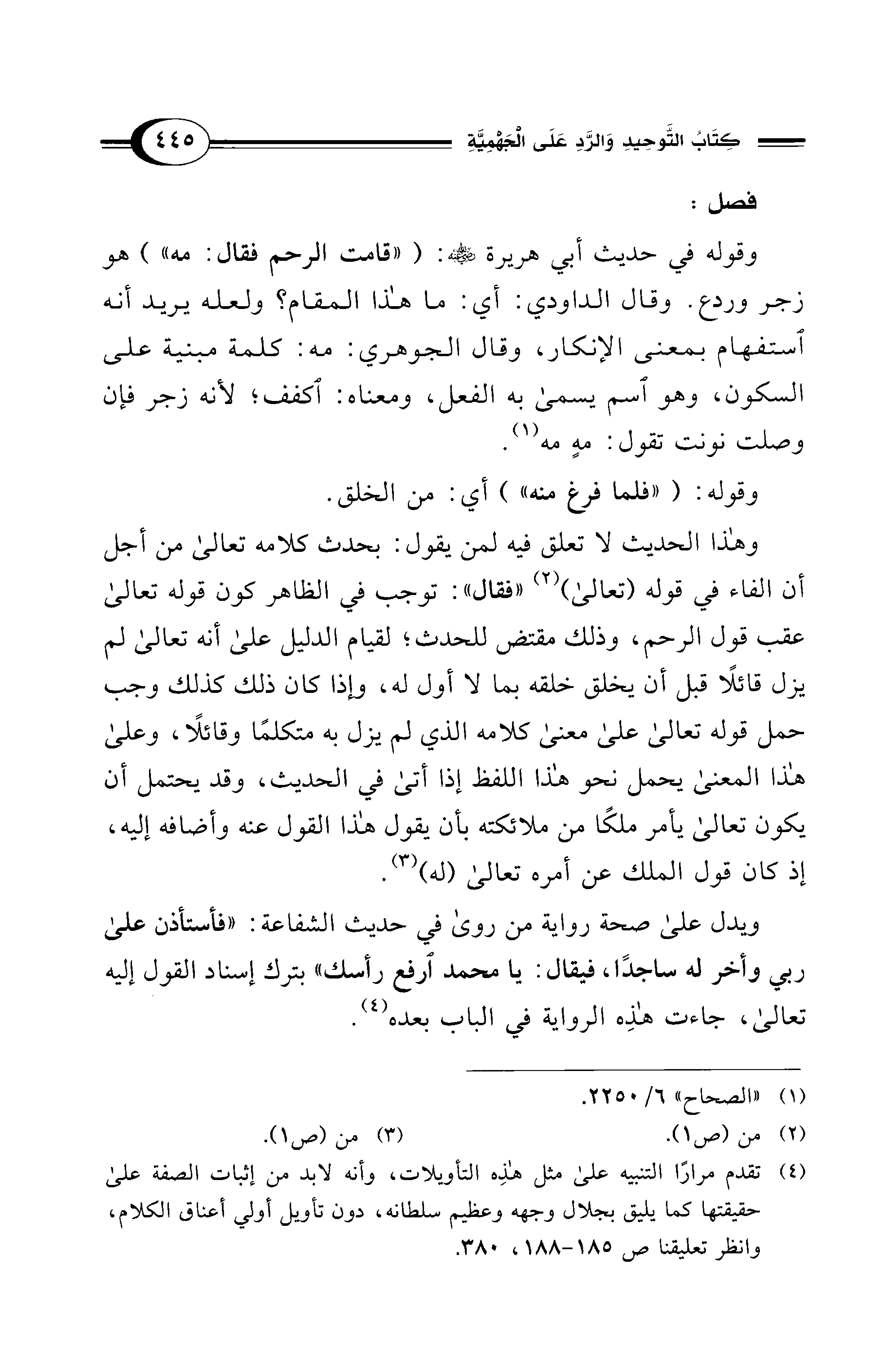 (¬4) تقدم مرارًا التنبيه على مثل هذِه التأويلات، وأنه لابد من إثبات الصفة على حقيقتها كما يليق بجلال وجهه وعظيم سلطانه، دون تأويل أولى أعناق الكلام، وانظر تعليقنا ص185 - 188، 380.
