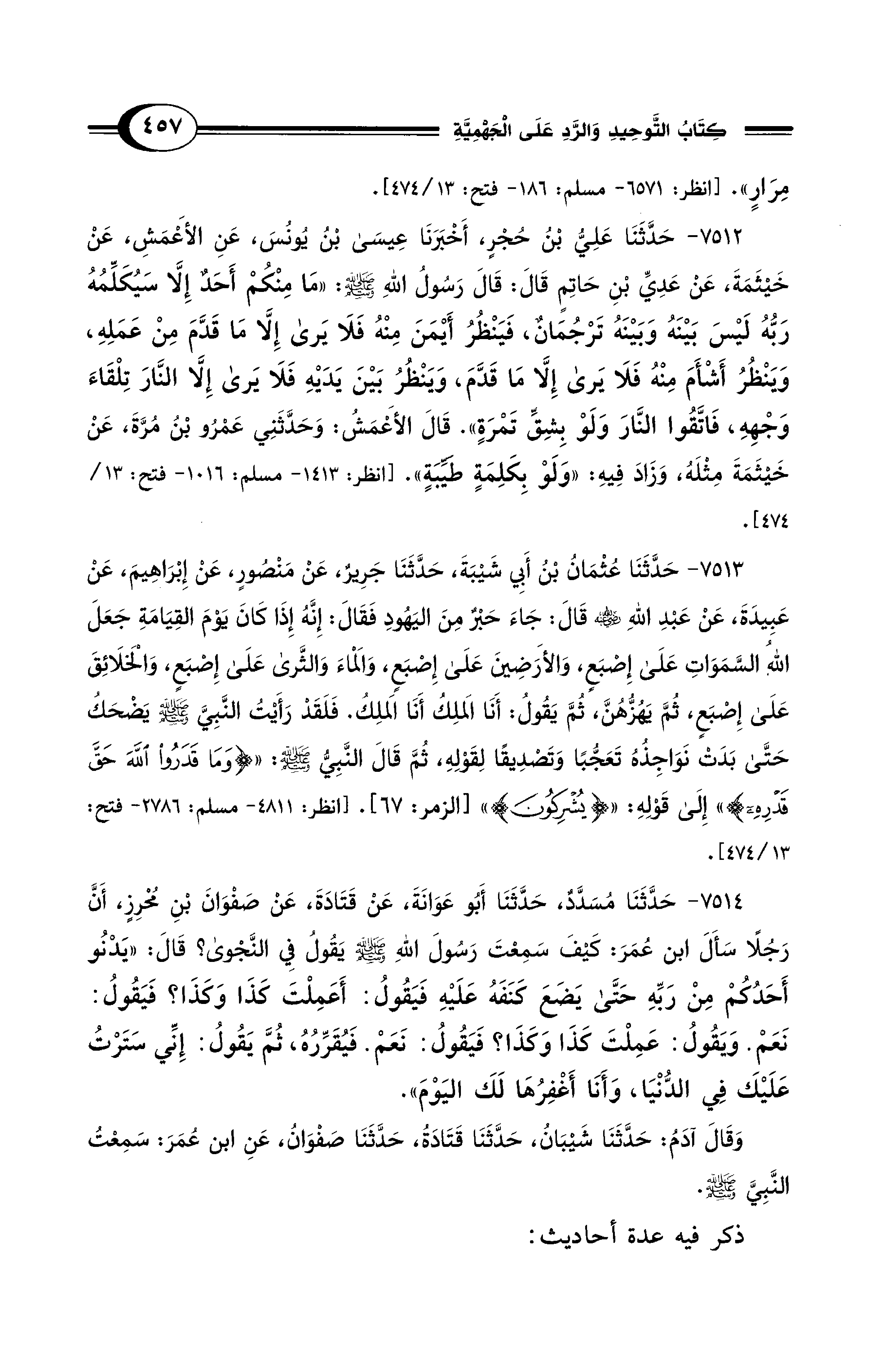 7512 - حَدَّثَنَا عَلِيُّ بْنُ حُجْرٍ، أَخْبَرَنَا عِيسَى بْنُ يُونُسَ، عَنِ الأَعْمَشِ، عَنْ خَيْثَمَةَ، عَنْ عَدِيِّ بْنِ حَاتِمٍ قَالَ: قَالَ رَسُولُ اللهِ - صلى الله عليه وسلم -: «مَا مِنْكُمْ أَحَدٌ إِلاَّ سَيُكَلِّمُهُ رَبُّهُ لَيْسَ بَيْنَهُ وَبَيْنَهُ تَرْجُمَانٌ، فَيَنْظُرُ أَيْمَنَ مِنْهُ فَلاَ يَرَى إِلاَّ مَا قَدَّمَ مِنْ عَمَلِهِ، وَيَنْظُرُ أَشْأَمَ مِنْهُ فَلاَ يَرَى إِلاَّ مَا قَدَّمَ، وَيَنْظُرُ بَيْنَ يَدَيْهِ فَلاَ يَرَى إِلاَّ النَّارَ تِلْقَاءَ وَجْهِهِ، فَاتَّقُوا النَّارَ وَلَوْ بِشِقِّ تَمْرَةٍ». قَالَ الأَعْمَشُ: وَحَدَّثَنِي عَمْرُو بْنُ مُرَّةَ، عَنْ خَيْثَمَةَ مِثْلَهُ، وَزَادَ فِيهِ: «وَلَوْ بِكَلِمَةٍ طَيِّبَةٍ». [انظر: 1413 - مسلم: 1016 - فتح: 13/ 474].