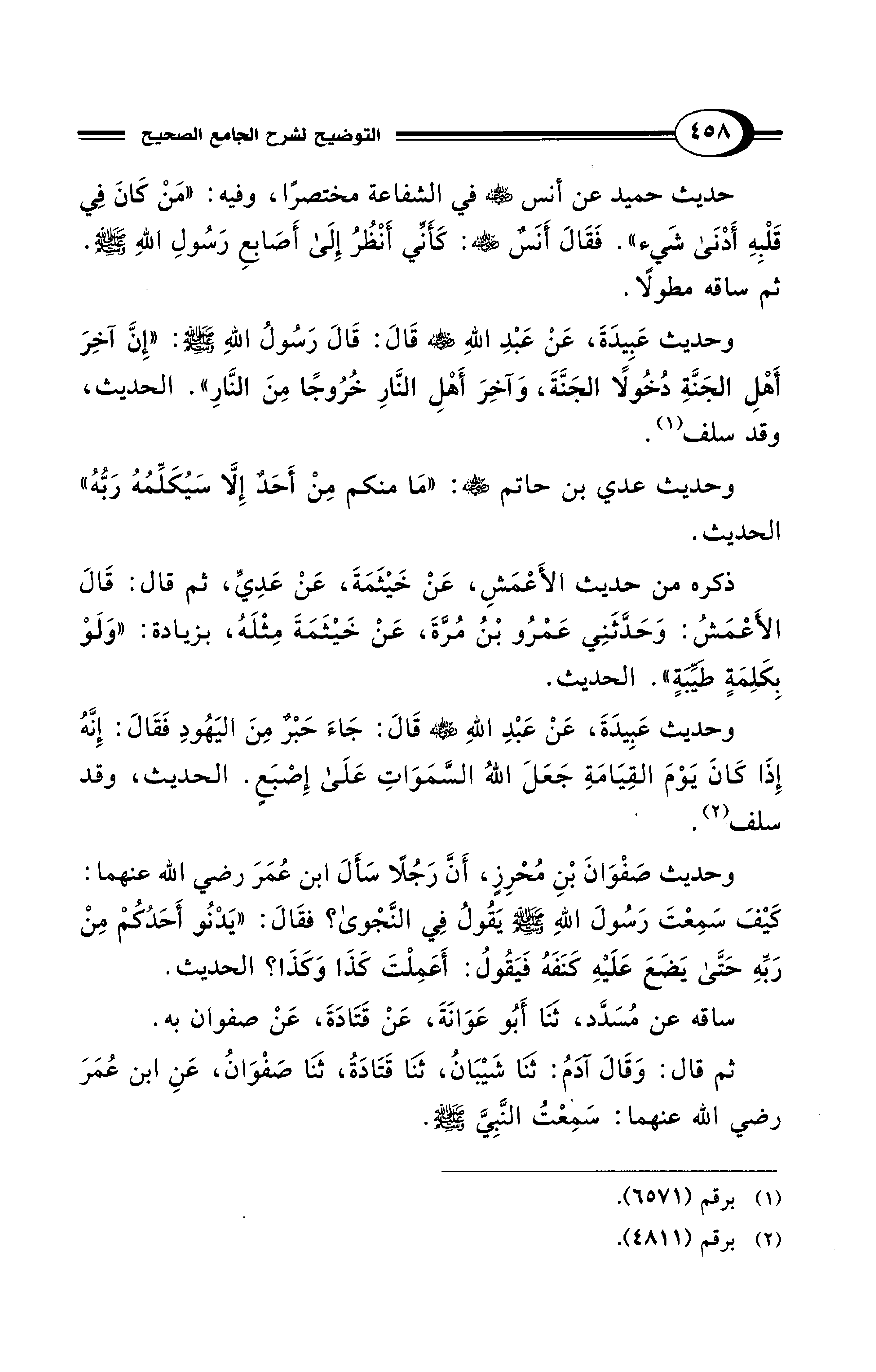 وحديث عدي بن حاتم - رضي الله عنه -: "مَا منكم مِنْ أَحَدٌ إِلَّا سَيُكَلِّمُهُ رَبُّهُ" الحديث.
