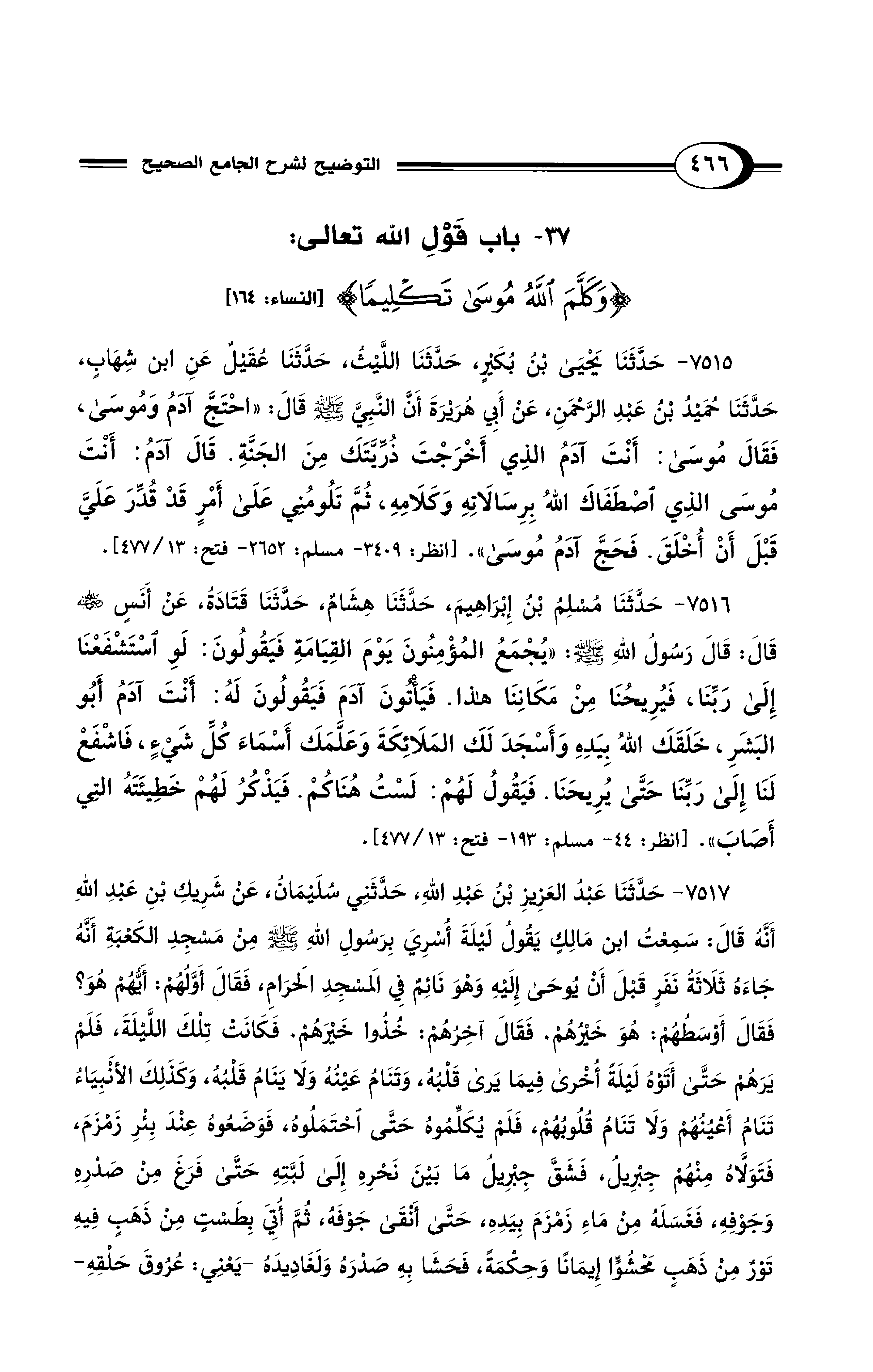 37 - باب قَوْلِ الله تعالىِ: {وكَلَّمَ اللهُ مُوسَى تَكْلِيمًا} [النساء: 164]