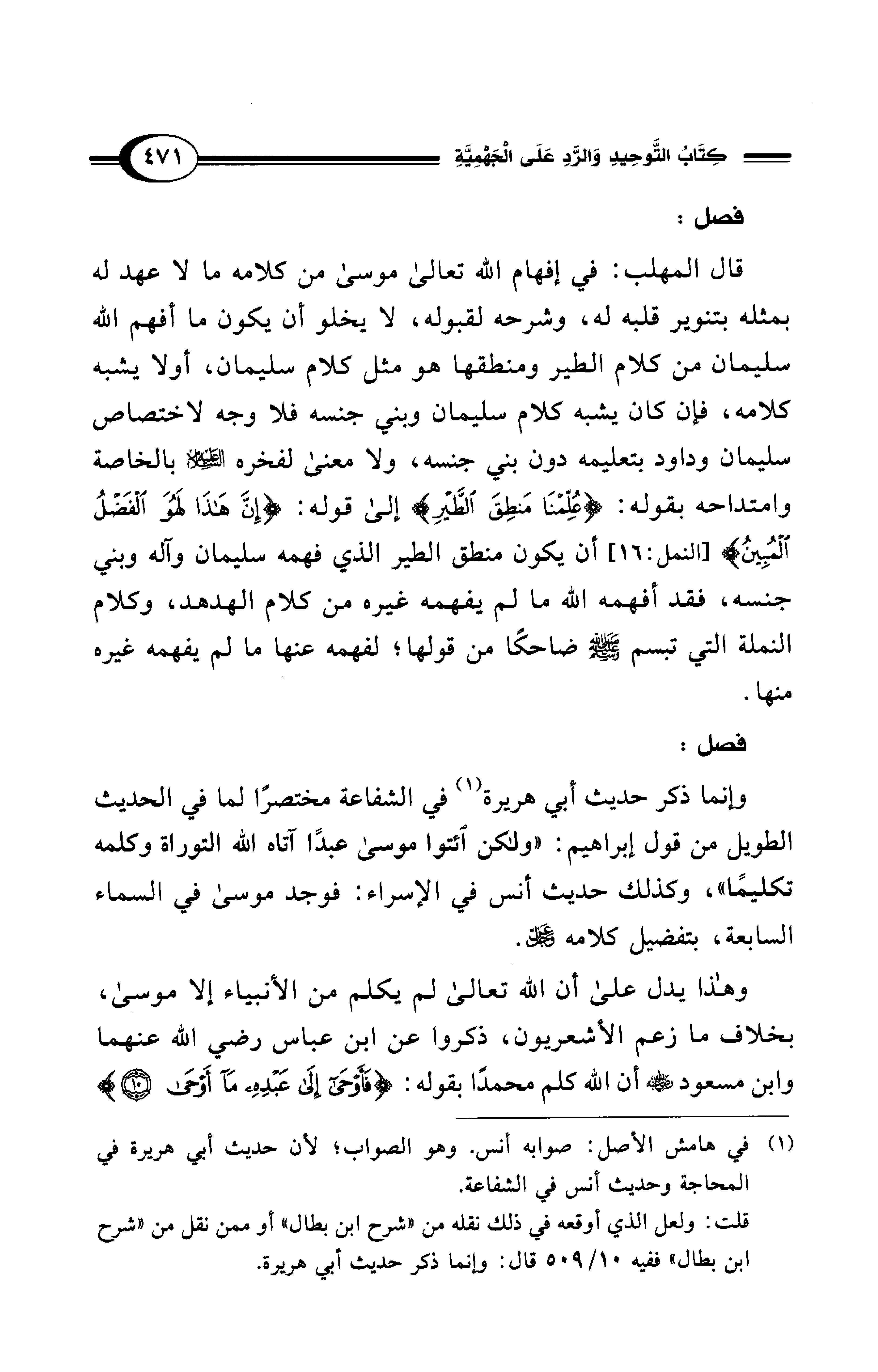 وإنما ذكر حديث أبي هريرة (¬1) في الشفاعة مختصرًا لما في الحديث الطويل من قول إبراهيم: "ولكن ائتوا موسى عبدًا اتاه الله التوراة وكلمه تكليمًا"، وكذلك حديث أنس في الإسراء: فوجد موسى في السماء السابعة، بتفضيل كلامه -عَزَّ وَجَلَّ-.
