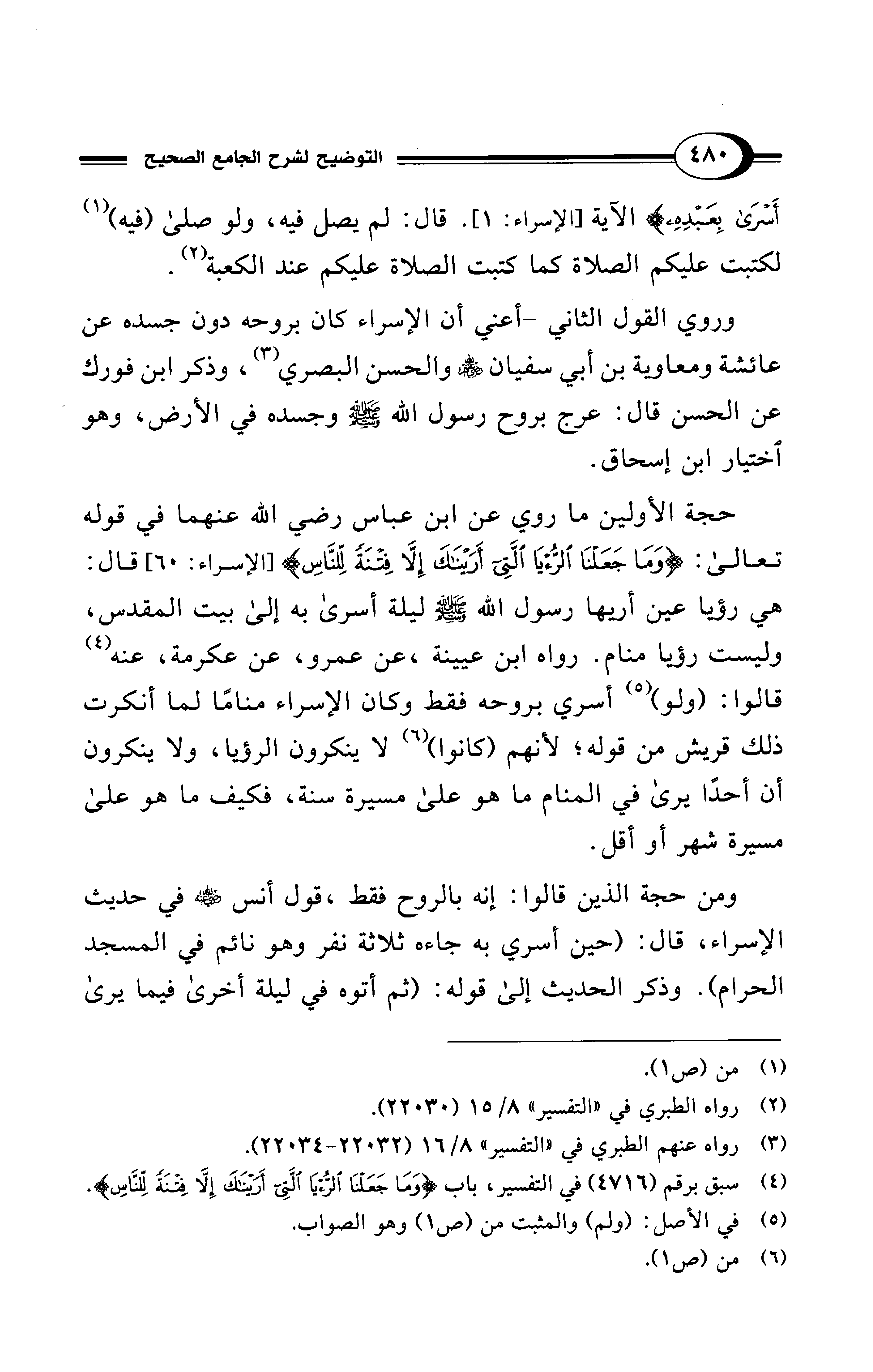 حجة الأولين ما روي عن ابن عباس - رضي الله عنهما - في قوله تعالى: {وَمَا جَعَلْنَا الرُّؤْيَا الَّتِي أَرَيْنَاكَ إِلَّا فِتْنَةً لِلنَّاسِ} [الإسراء: 60] قال: هي رؤيا عين أريها رسول الله - صلى الله عليه وسلم - ليلة أسري به إلى بيت المقدس، وليست رؤيا منام. رواه ابن عيينة، عن عمرو، عن عكرمة، عنه (¬4) قالوا: (ولو) (¬5) أسري بروحه فقط وكان الإسراء منامًا لما أنكرت ذلك قريش من قوله؛ لأنهم (كانوا) (¬6) لا ينكرون الرؤيا، ولا ينكرون أن أحدًا يرى في المنام ما هو على مسيرة سنة، فكيف ما هو على مسيرة شهر أو أقل.