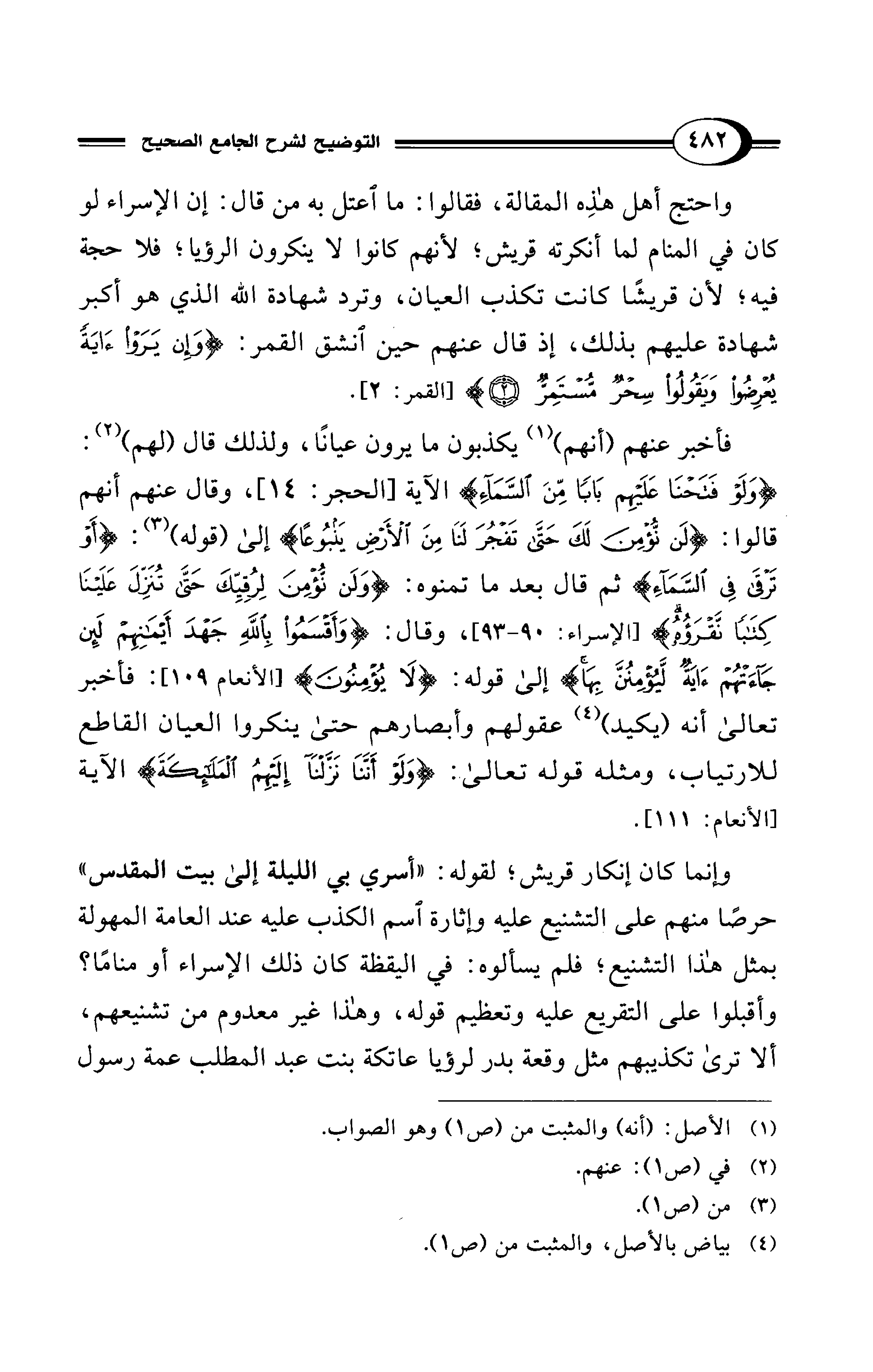 واحتج أهل هذِه المقالة، فقالوا: ما اعتل به من قال: إن الإسراء لو كان في المنام لما أنكرته قريش؛ لأنهم كانوا لا ينكرون الرؤيا؛ فلا حجة فيه. لأن قريشًا كانت تكذب العيان، وترد شهادة الله الذي هو أكبر شهادة عليهم بذلك، إذ قال عنهم حين انشق القمر: {وَإِنْ يَرَوْا آيَةً يُعْرِضُوا وَيَقُولُوا سِحْرٌ مُسْتَمِرٌّ (2)} [القمر: 2].
