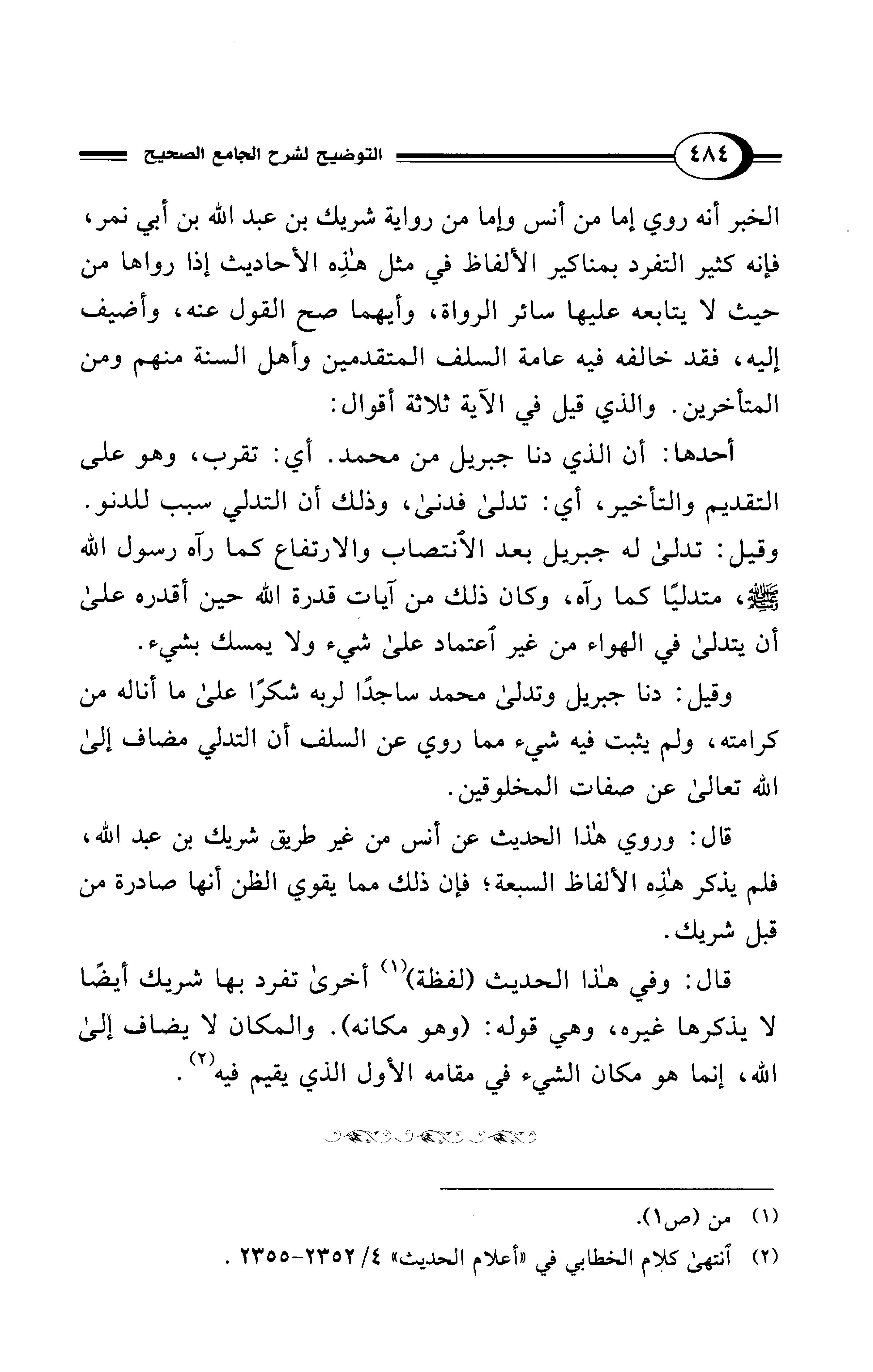 وقيل: دنا جبريل وتدلى محمد ساجدًا لربه شكرًا على ما أناله من كرامته، ولم يثبت فيه شيء مما روي عن السلف أن التدلي مضاف إلى الله تعالى عن صفات المخلوقين.