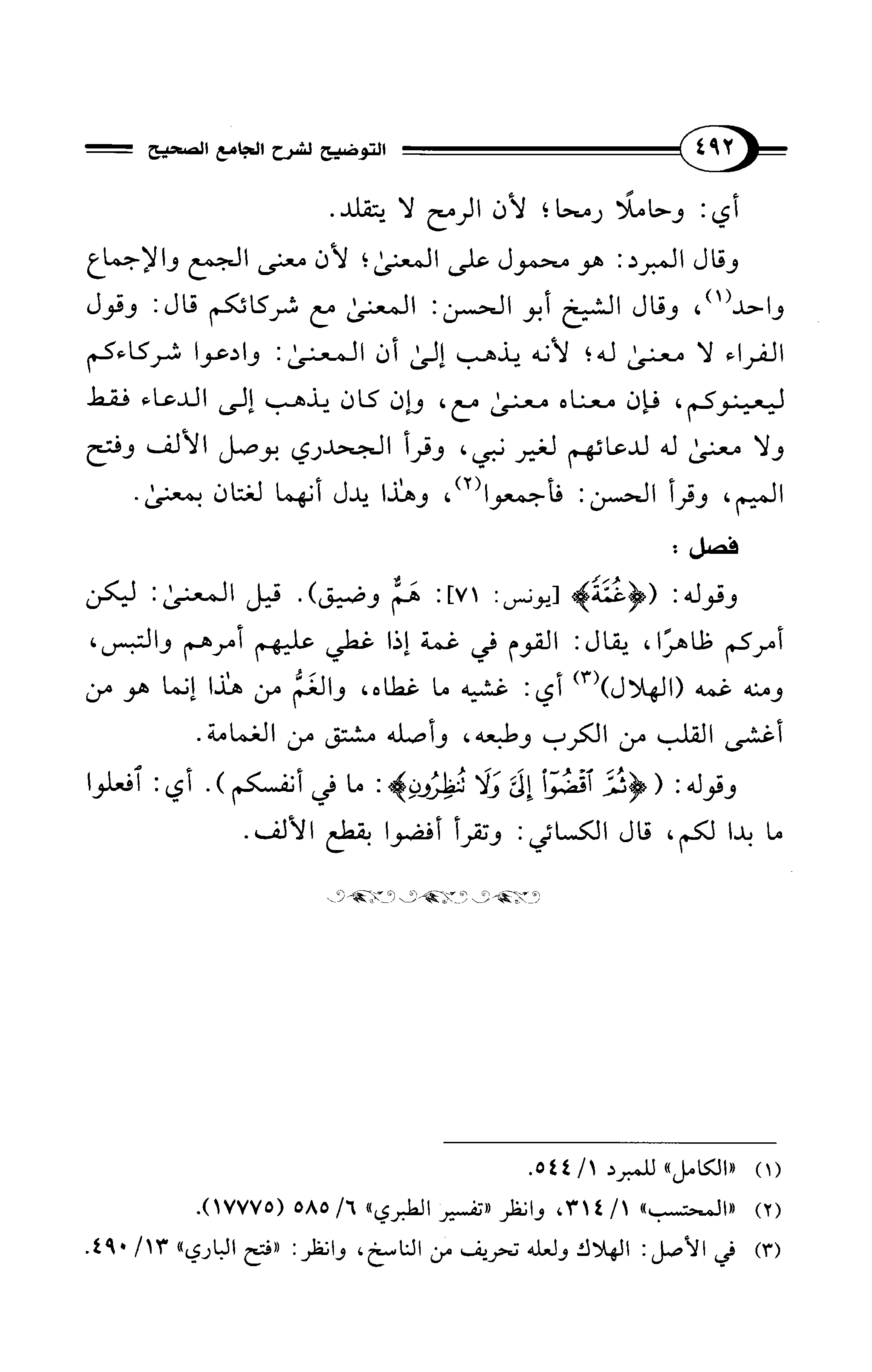 وقوله: ({غُمَّةً} [يونس: 71]: هَمٌّ وضيق). قيل المعنى: ليكن أمركم ظاهرًا، يقال: القوم في غمة إذا غطي عليهم أمرهم والتبس، ومنه غمه (الهلال) (¬3) أي: غشيه ما غطاه، والغَمُّ من هذا إنما هو من أغشى القلب من الكرب وطبعه، وأصله مشتق من الغمامة.