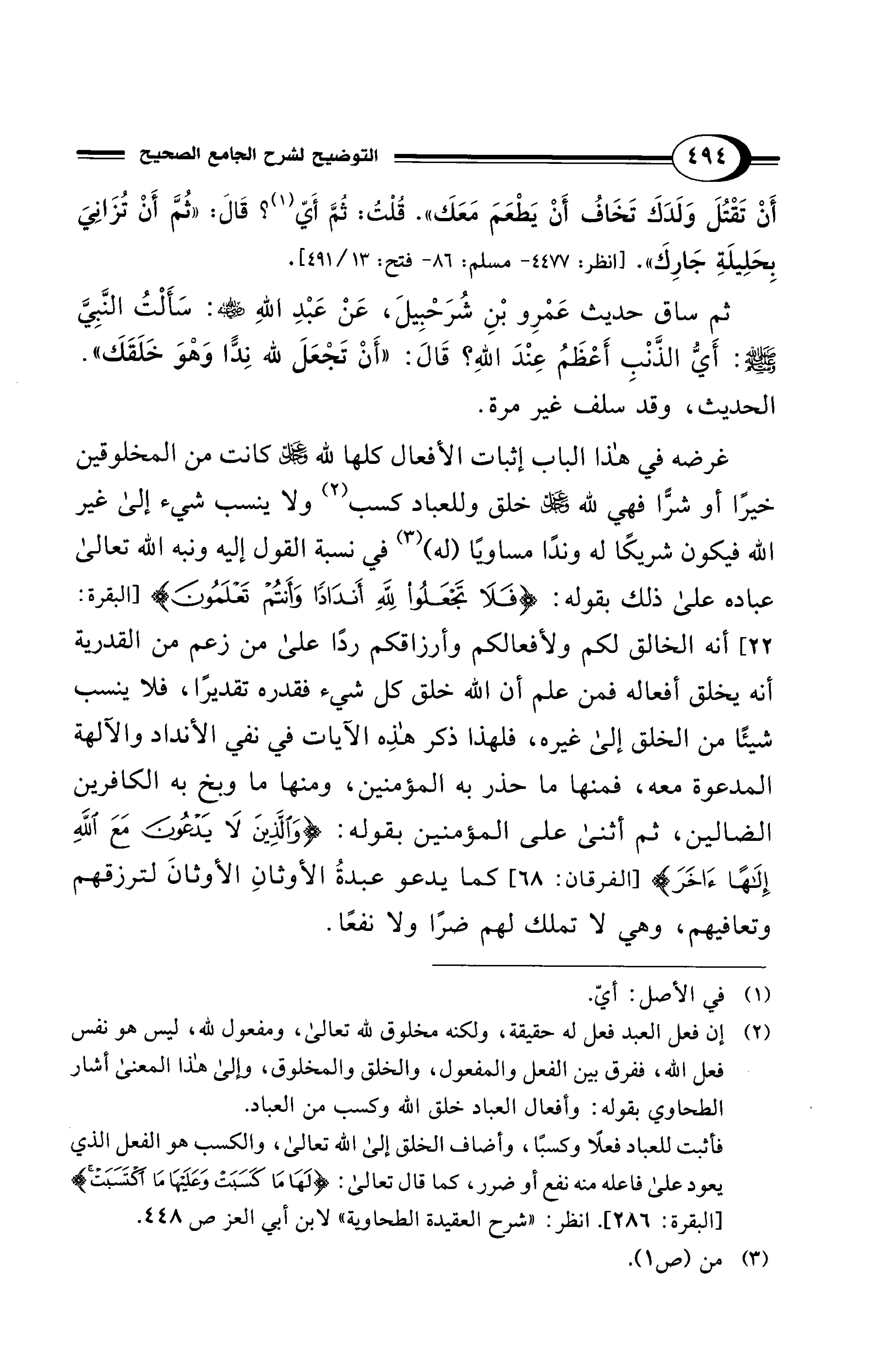 (¬2) إن فعل العبد فعل له حقيقة، ولكنه مخلوق لله تعالى، ومفعول لله، ليس هو نفس فعل الله، ففرق بين الفعل والمفعول، والخلق والمخلوق، وإلى هذا المعنى أشار الطحاوي بقوله: وأفعال العباد خلق الله وكسب من العباد.