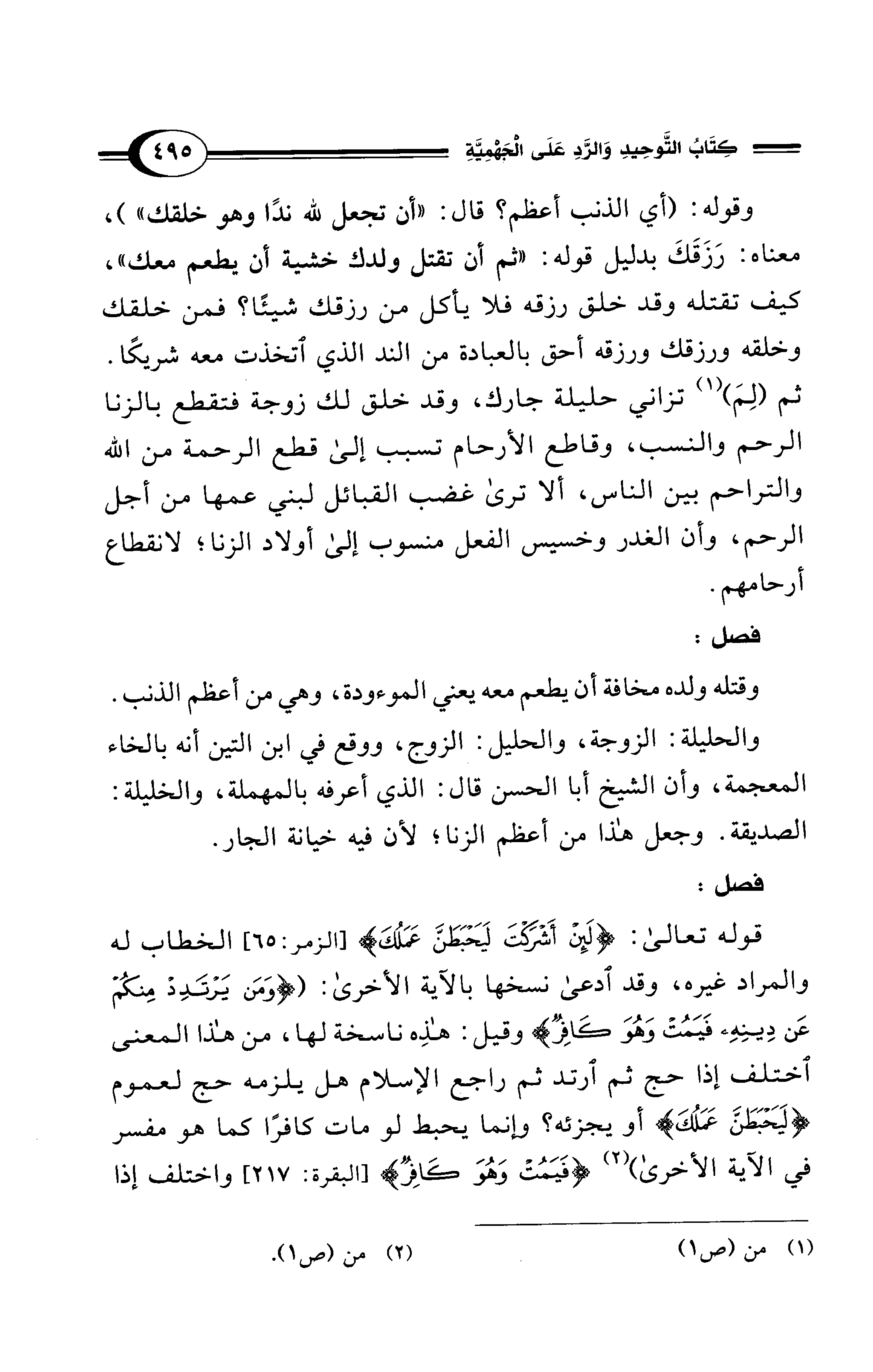 وقوله: (أي الذنب أعظم؟ قال: "أن تجعل لله ندًا وهو خلقك")، معناه: رَزَقَكَ بدليل قوله: "ثم أن تقتل ولدك خشية أن يطعم معك"، كيف تقتله وقد خلق رزقه فلا يأكل من رزقك شيئًا؟ فمن خلقك وخلقه ورزقك ورزقه أحق بالعبادة من الند الذي اتخذت معه شريكًا. ثم (لِمَ) (¬1) تزاني حليلة جارك، وقد خلق لك زوجة فتقطع بالزنا الرحم والنسب، وقاطع الأرحام تسبب إلى قطع الرحمة من الله والتراحم بين الناس، ألا ترى غضب القبائل لبني عمها من أجل الرحم، وأن الغدر وخسيس الفعل منسوب إلى أولاد الزنا؛ لانقطاع أرحامهم.