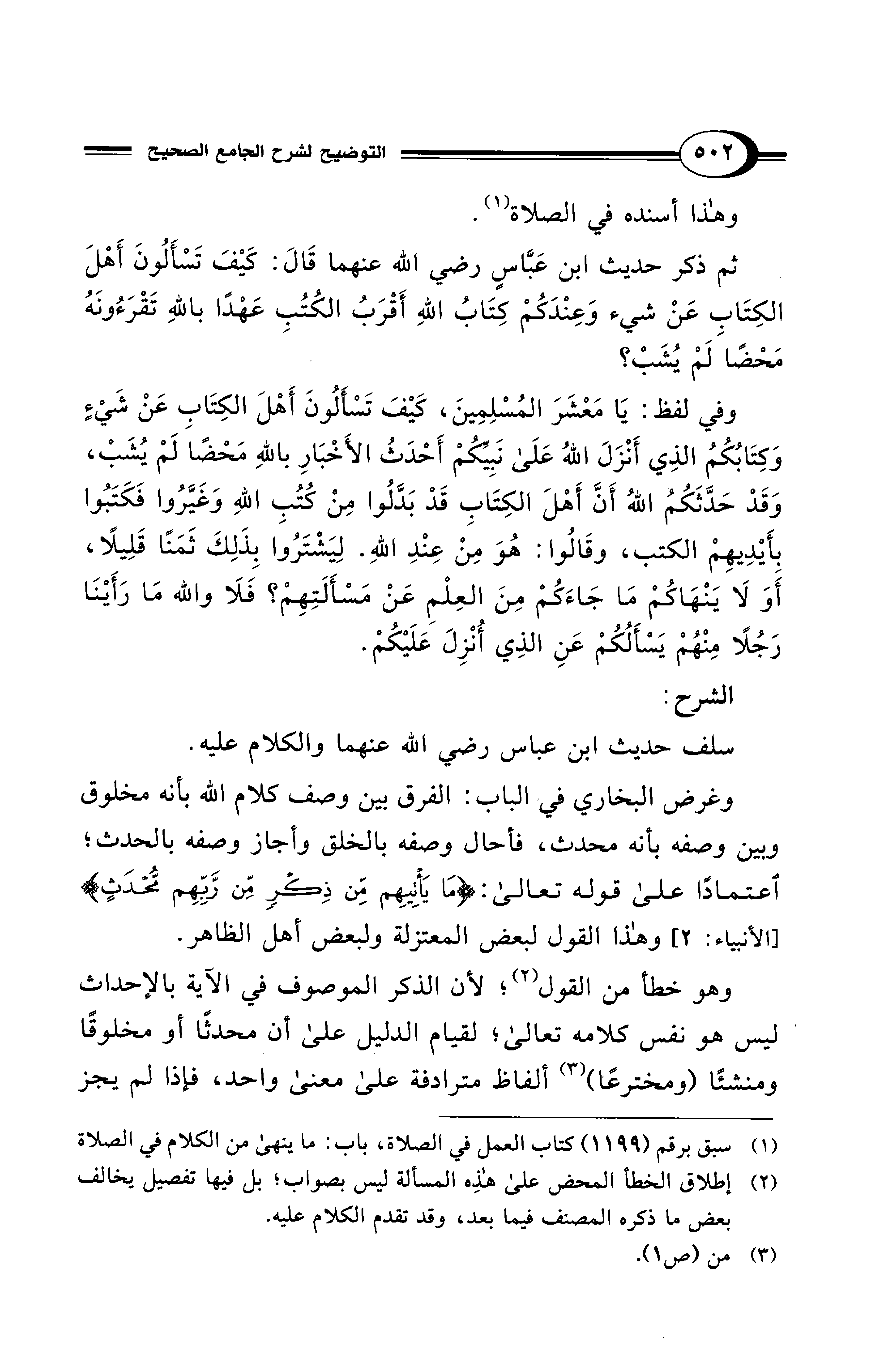 ثم ذكر حديث ابن عَبَّاسٍ - رضي الله عنهما - قَالَ: كَيْفَ تَسْأَلُونَ أَهْلَ الكِتَاب عَنْ شيء وَعِنْدَكُمْ كِتَابُ اللهِ أَقْرَبُ الكُتُبِ عَهْدًا باللهِ تَقْرَءُونَهُ مَحْضًا لَمْ يُشَبْ؟