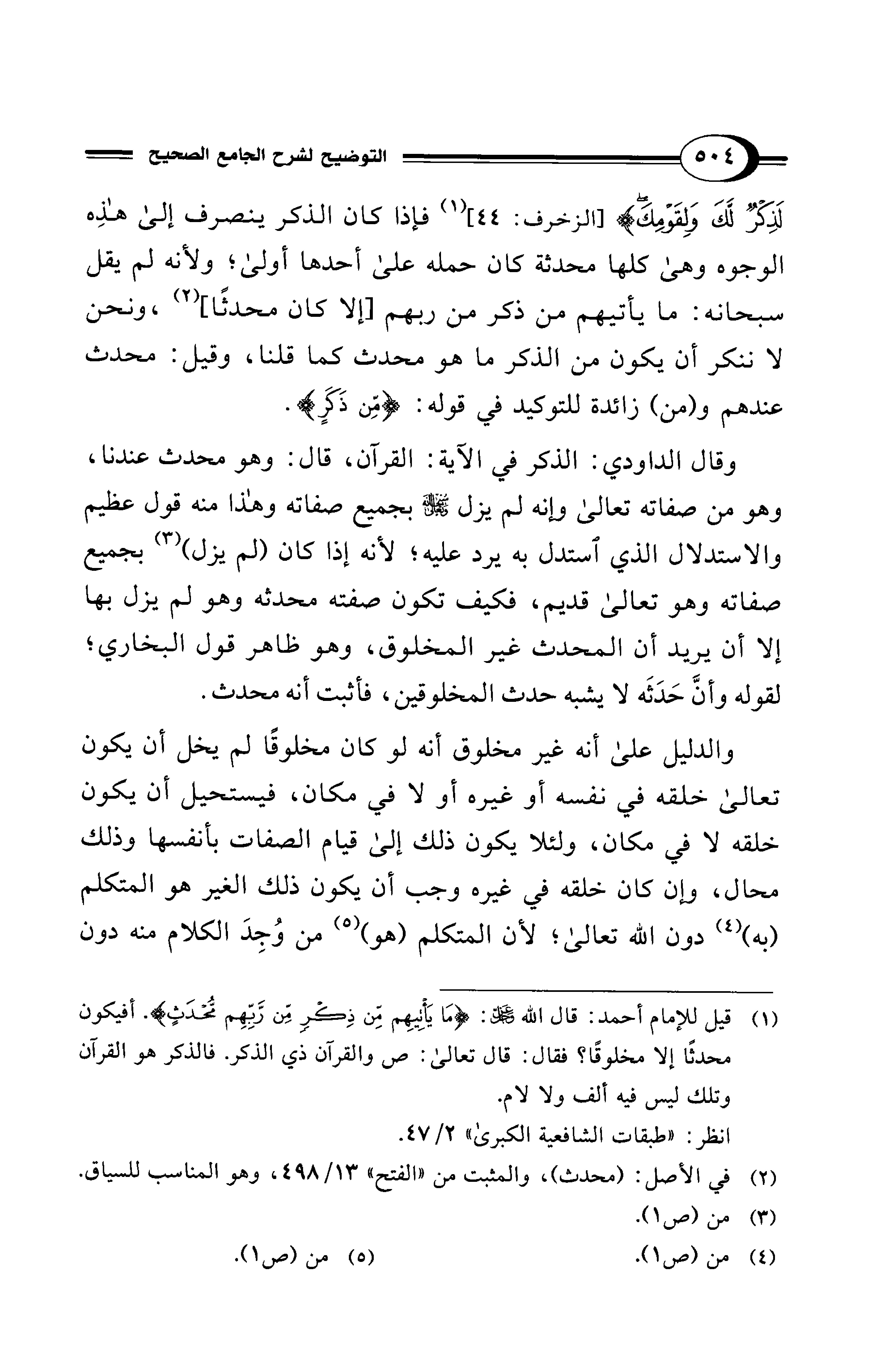 (¬1) قيل للإمام أحمد: قال الله -عَزَّ وَجَلَّ-: {مَا يَأْتِيهِمْ مِنْ ذِكْرٍ مِنْ رَبِّهِمْ مُحْدَثٍ}. أفيكون محدثًا إلا مخلوقًا؟ فقال: قال تعالى: ص والقران ذي الذكر. فالذكر هو القرآن وتلك ليس فيه ألف ولا لام.