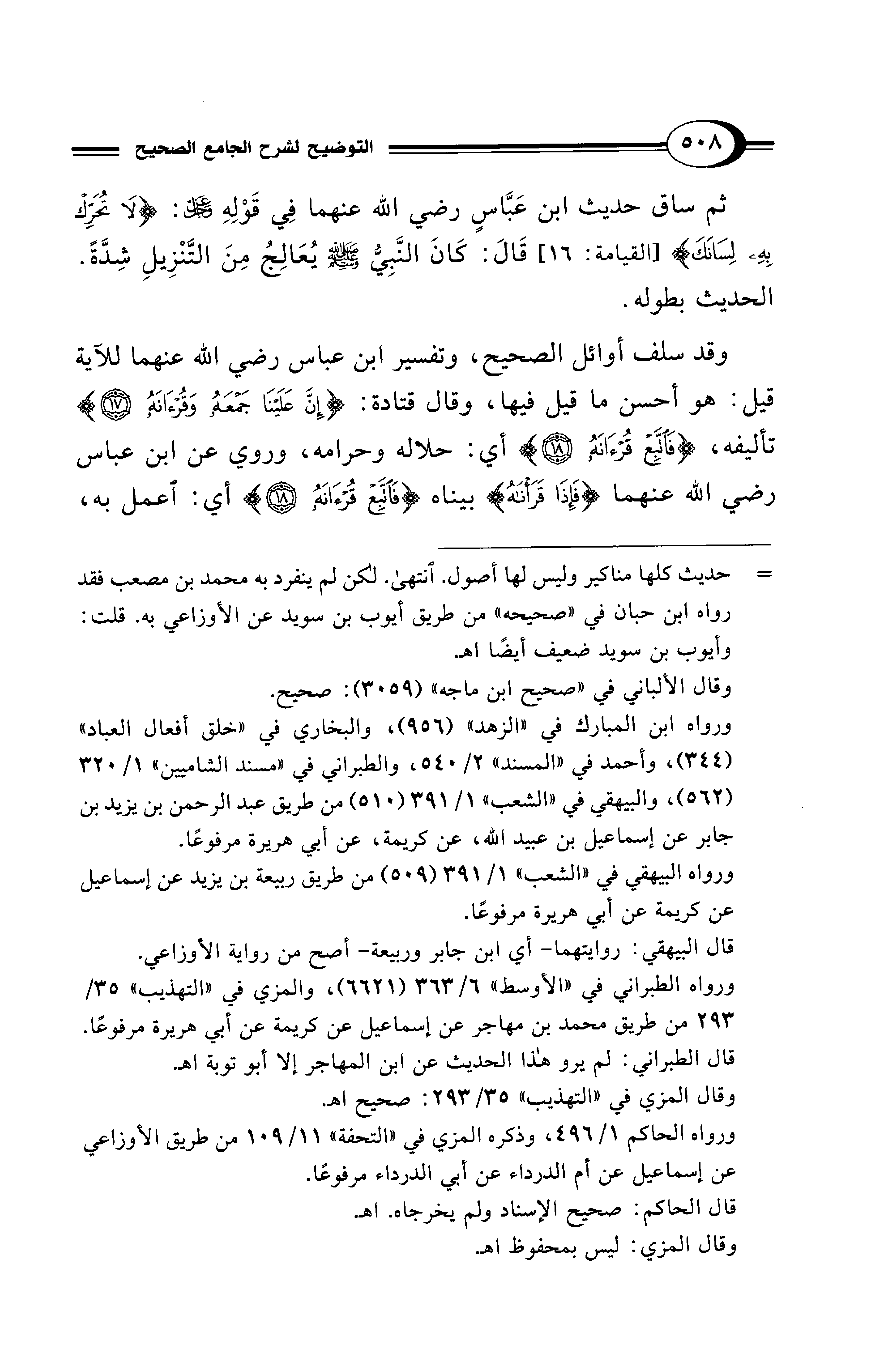 ثم ساق حديث ابن عَبَّاسٍ - رضي الله عنهما - في قَوْلِهِ -عَزَّ وَجَلَّ-: {لَا تُحَرِّكْ بِهِ لِسَانَكَ} [القيامة: 16] قَالَ: كَانَ النَّبِيَّ - صلى الله عليه وسلم - يُعَالِجُ مِنَ التَّنْزِيلِ شِدَّةً. الحديث بطوله.