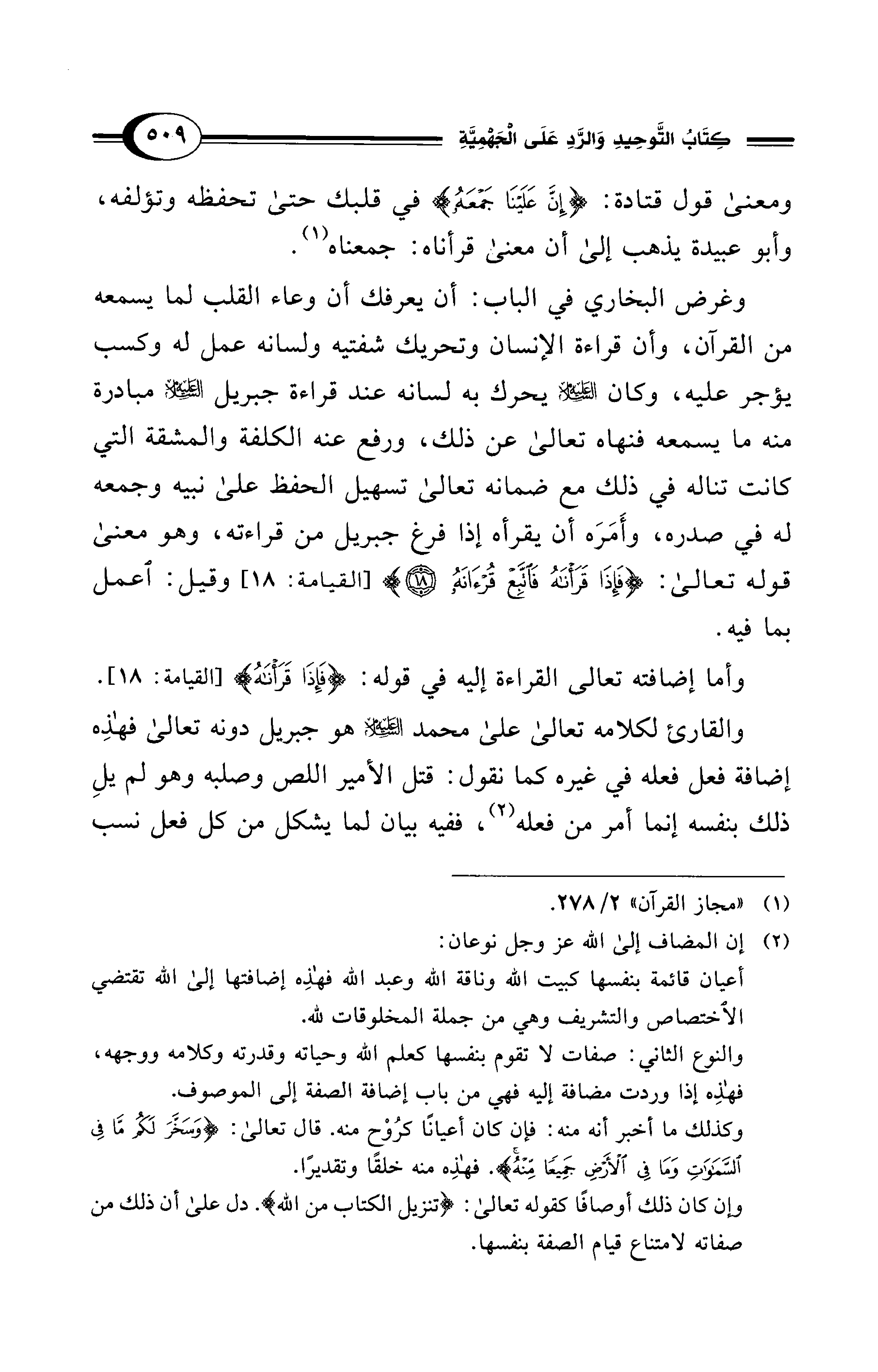 وأما إضافته تعالى القراءة إليه في قوله: {فَإِذَا قَرَأْنَاهُ} [القيامة: 18].